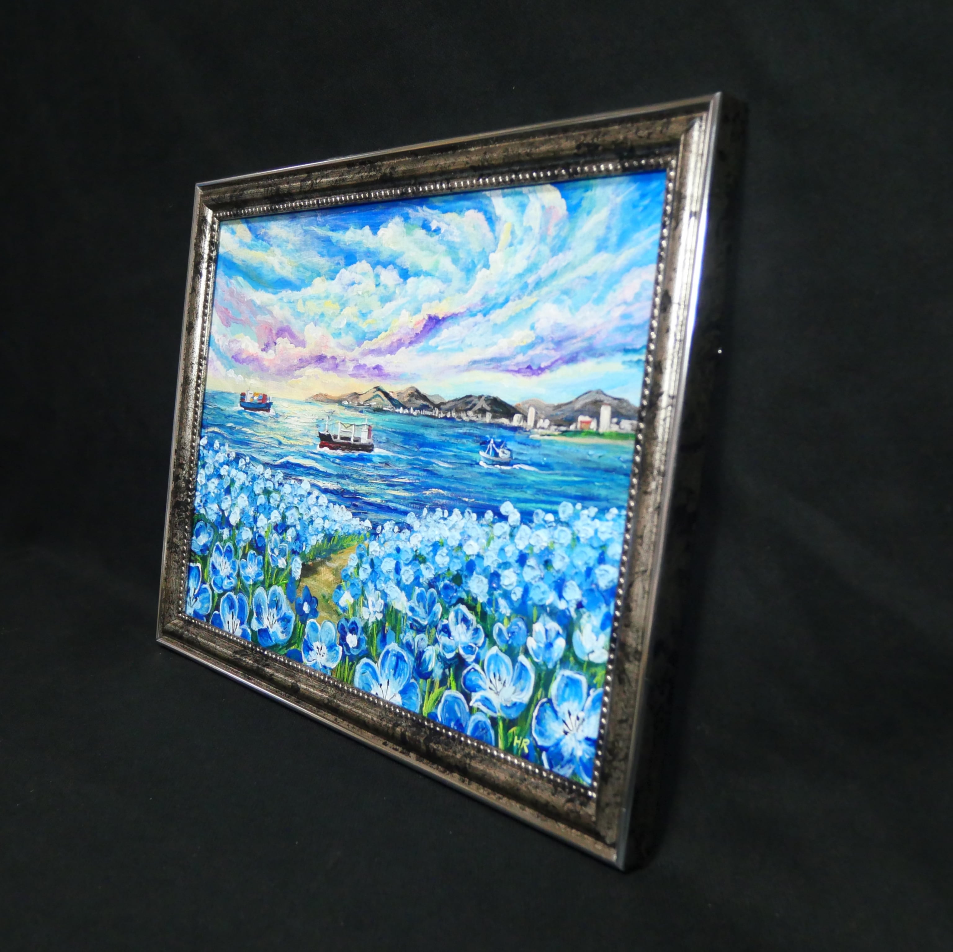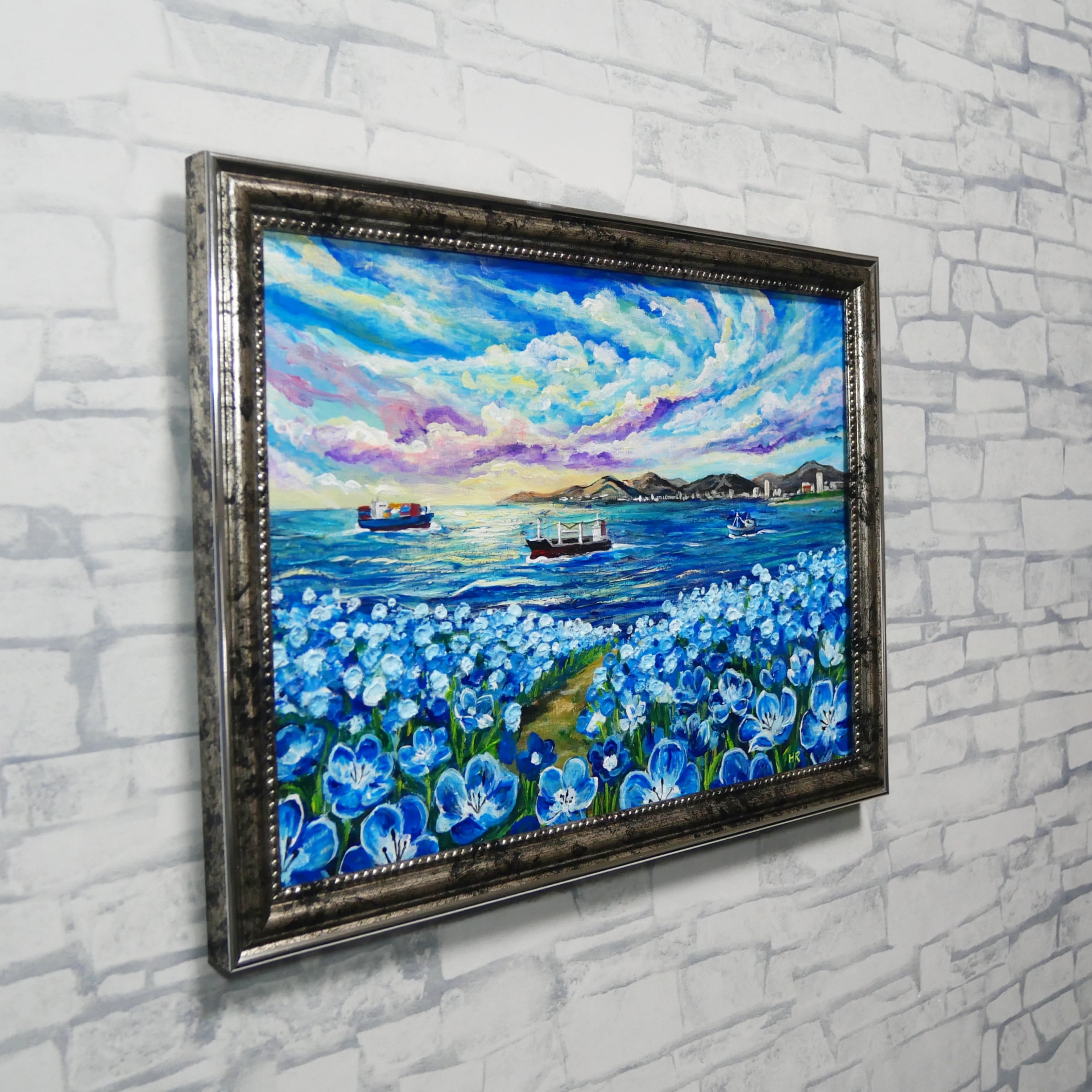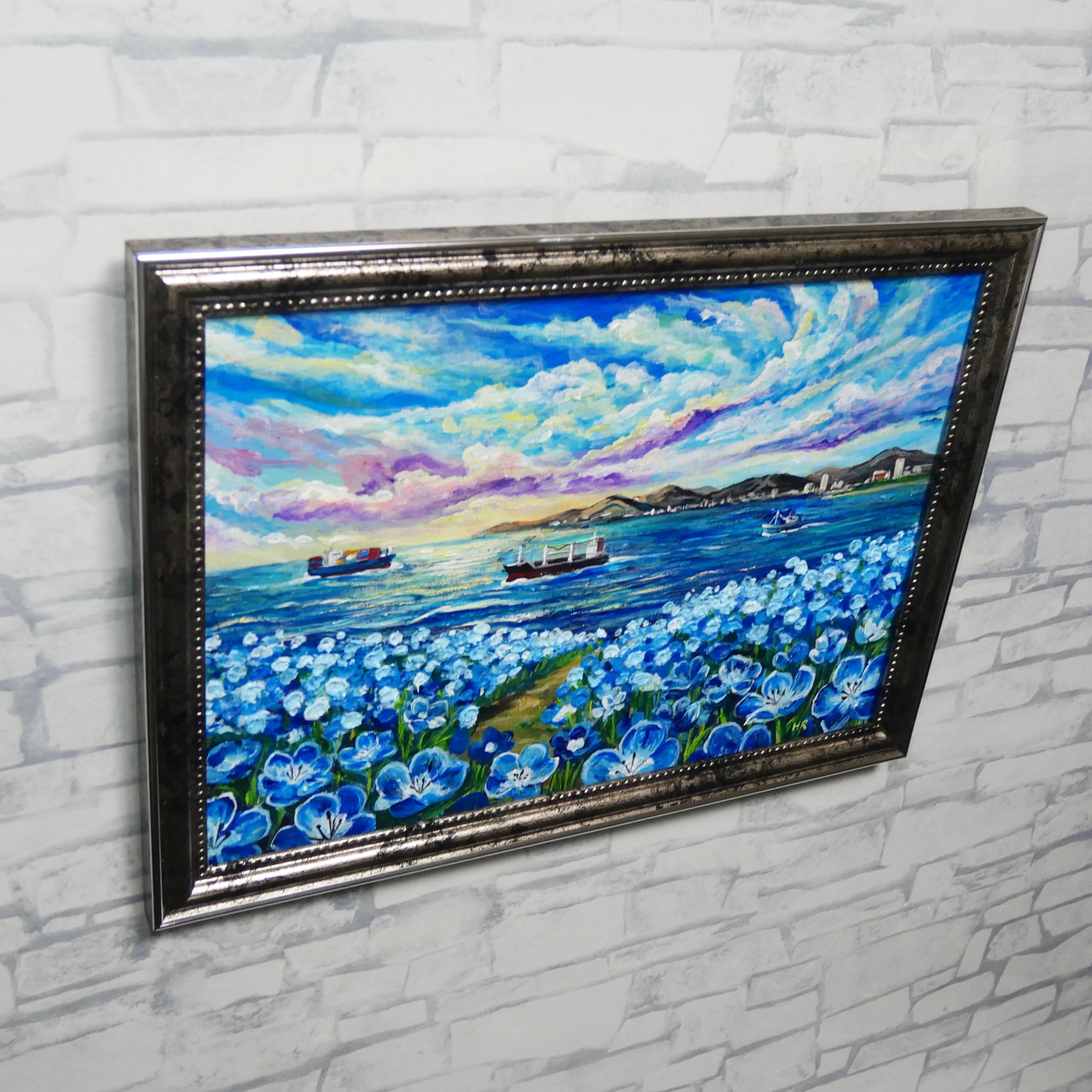 心が整う「青」のグラデーションが魅力。可憐なネモフィラのブルーから、深く澄んだ海の紺碧、そして夕暮れを予感させる空の紫まで、色彩の魔術が癒やしと静寂をもたらします。油絵ならではの立体感と、幾重にも重ねられた絵の具が生み出す厚塗りの質感は、この作品をただの風景画から一歩進めた「本物の絵画」としての実感を与えます。