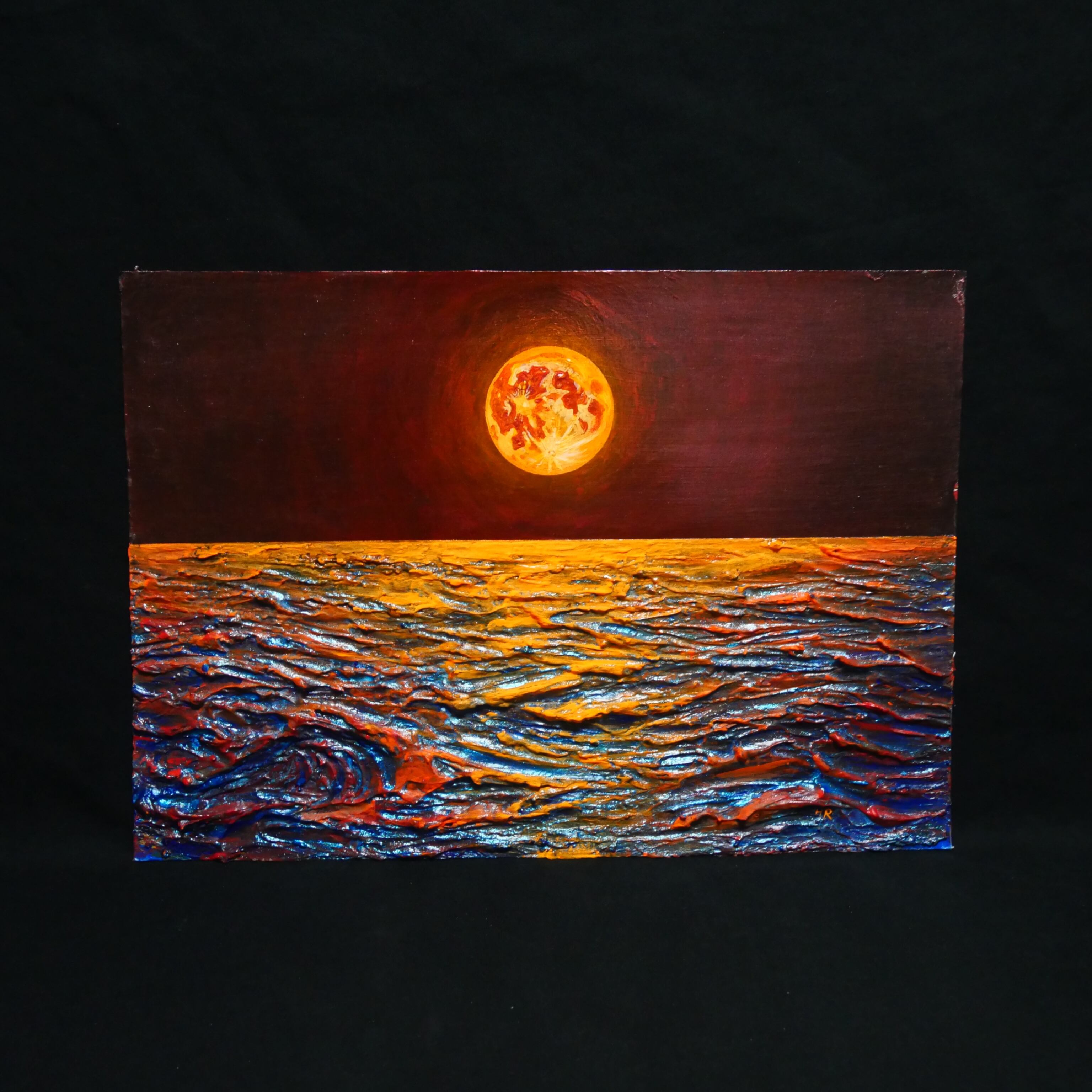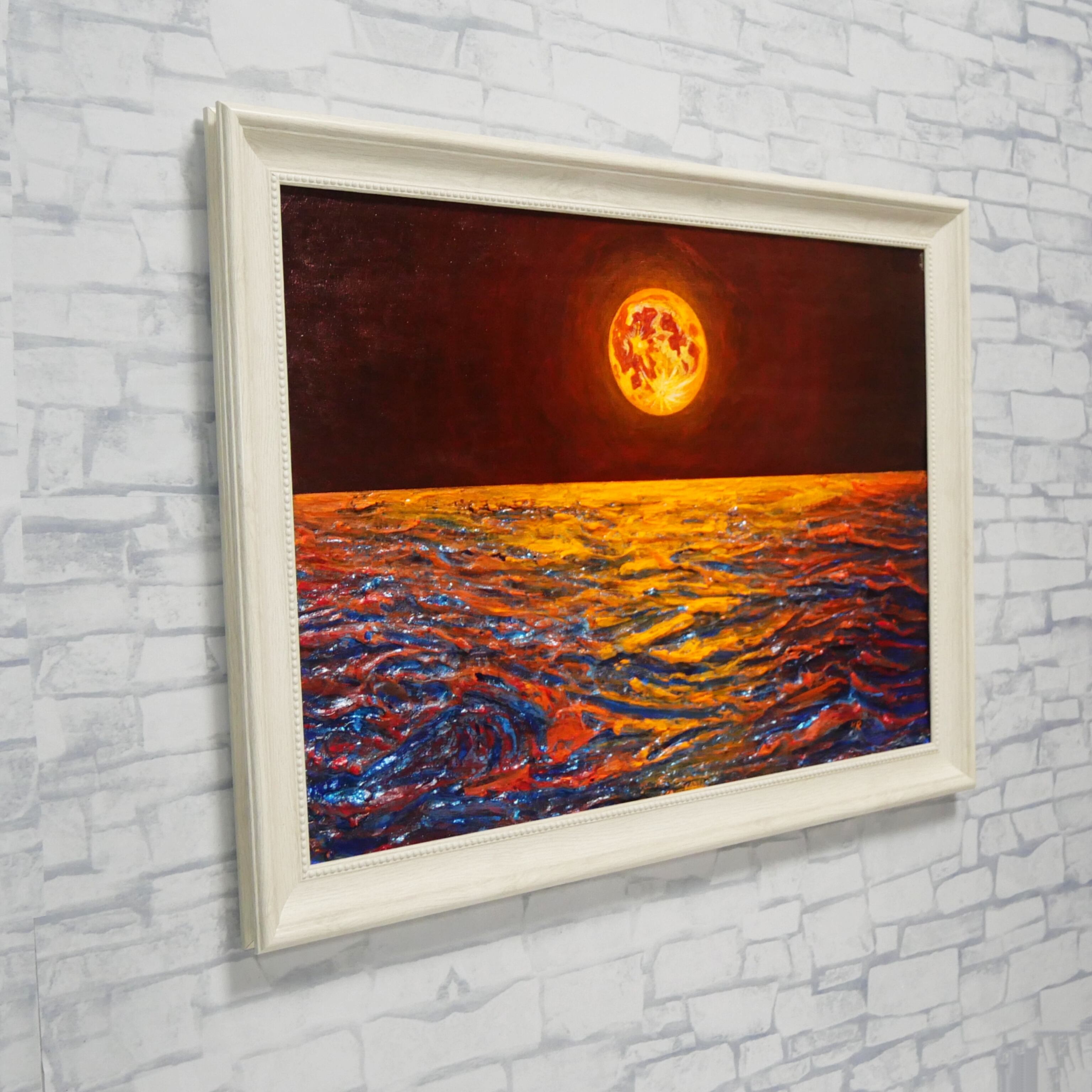 「豊穣のルナ・オーシャン」は、燃えるようなオレンジの満月が波打つ大海原を黄金色に染め上げる、美しさと力強さを兼ね備えた特別な油絵作品です。このアートは、月の引力が海を動かすように、見る者の運命をポジティブな方向へと導くエネルギーを込めて描き上げられており、心を奪われる独自の存在感を放っています。