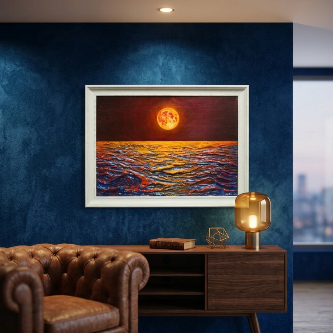 濃厚なオレンジと深いブルー、そして反射するゴールドのコントラストは、風水において「繁栄」と「金運」を象徴します。満月がもたらす満たされたエネルギーを、目に見える形で取り込むことができます。この作品を通じて、空間に福を招き入れる特別な存在を感じてください。