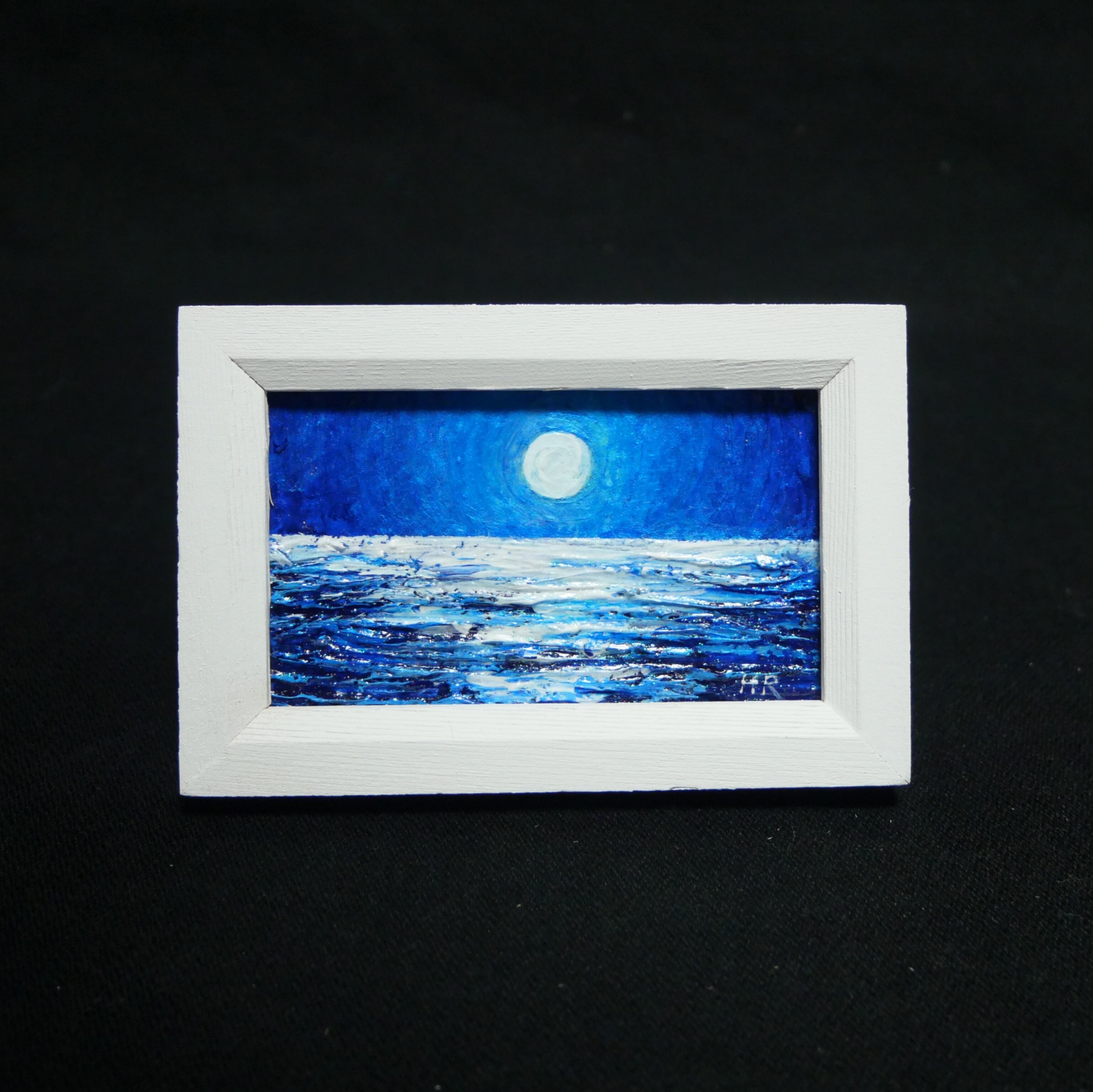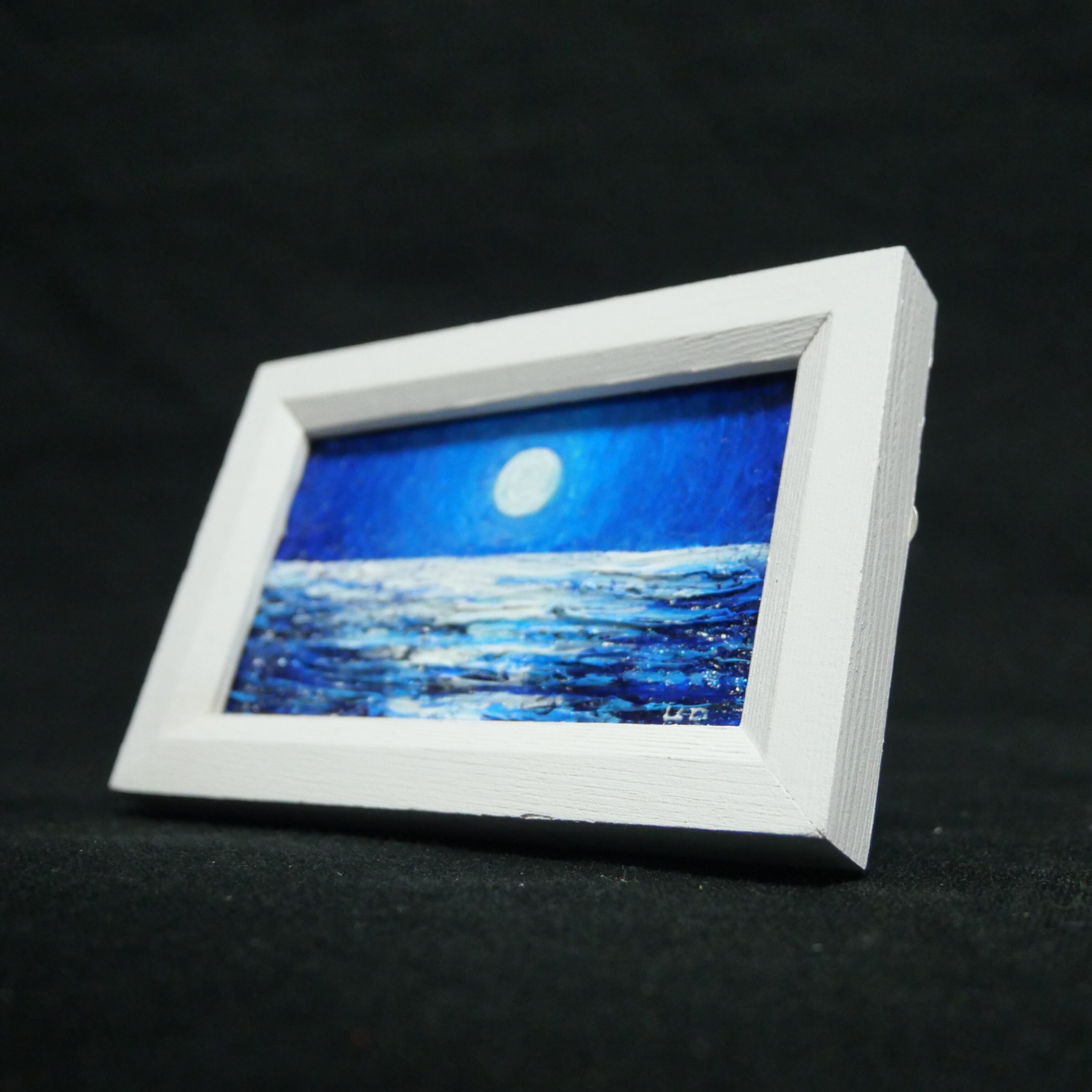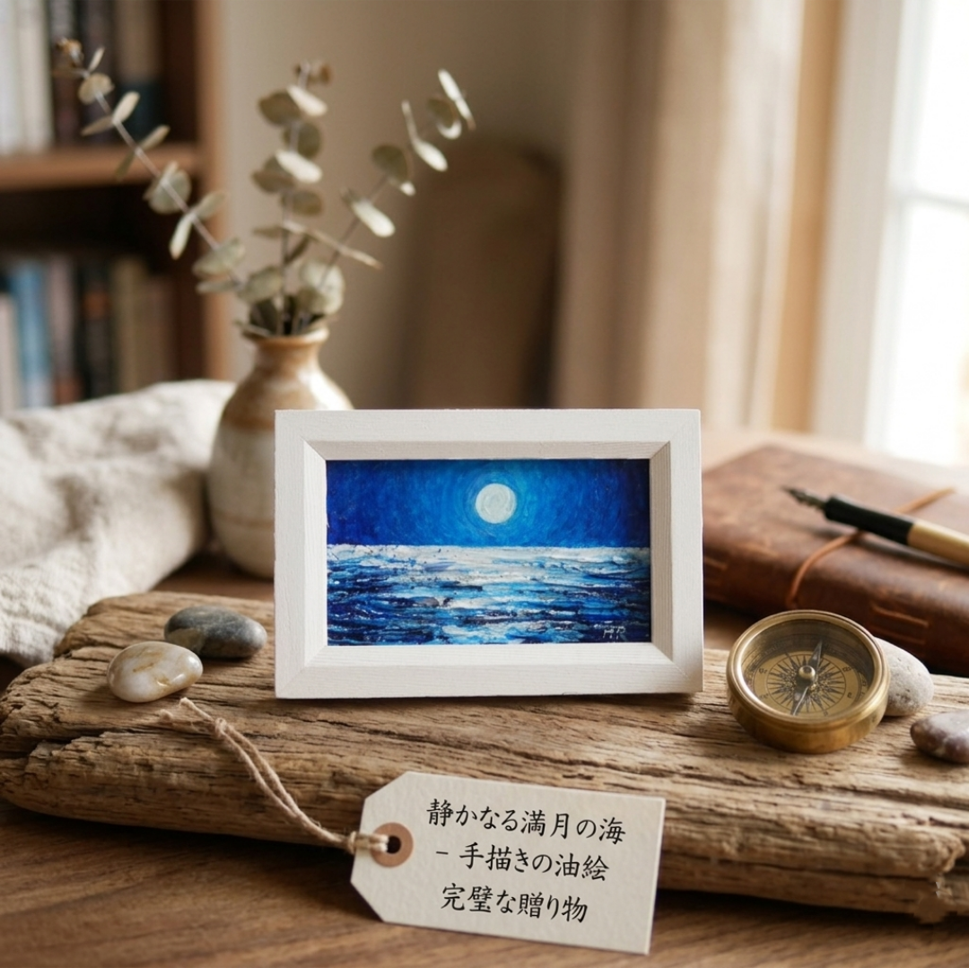 「手のひらの小宇宙:満月の夜海」は、深く澄んだ青の世界に満月が照らす静かな波を描いた特別な油絵作品です。このミニアートは、「お部屋に少しだけ、アートの彩りを。」というコンセプトのもと、白のフレームに映える鮮やかなブルーが、どんなインテリアにも素敵なアクセントとなるよう仕上げられています。
