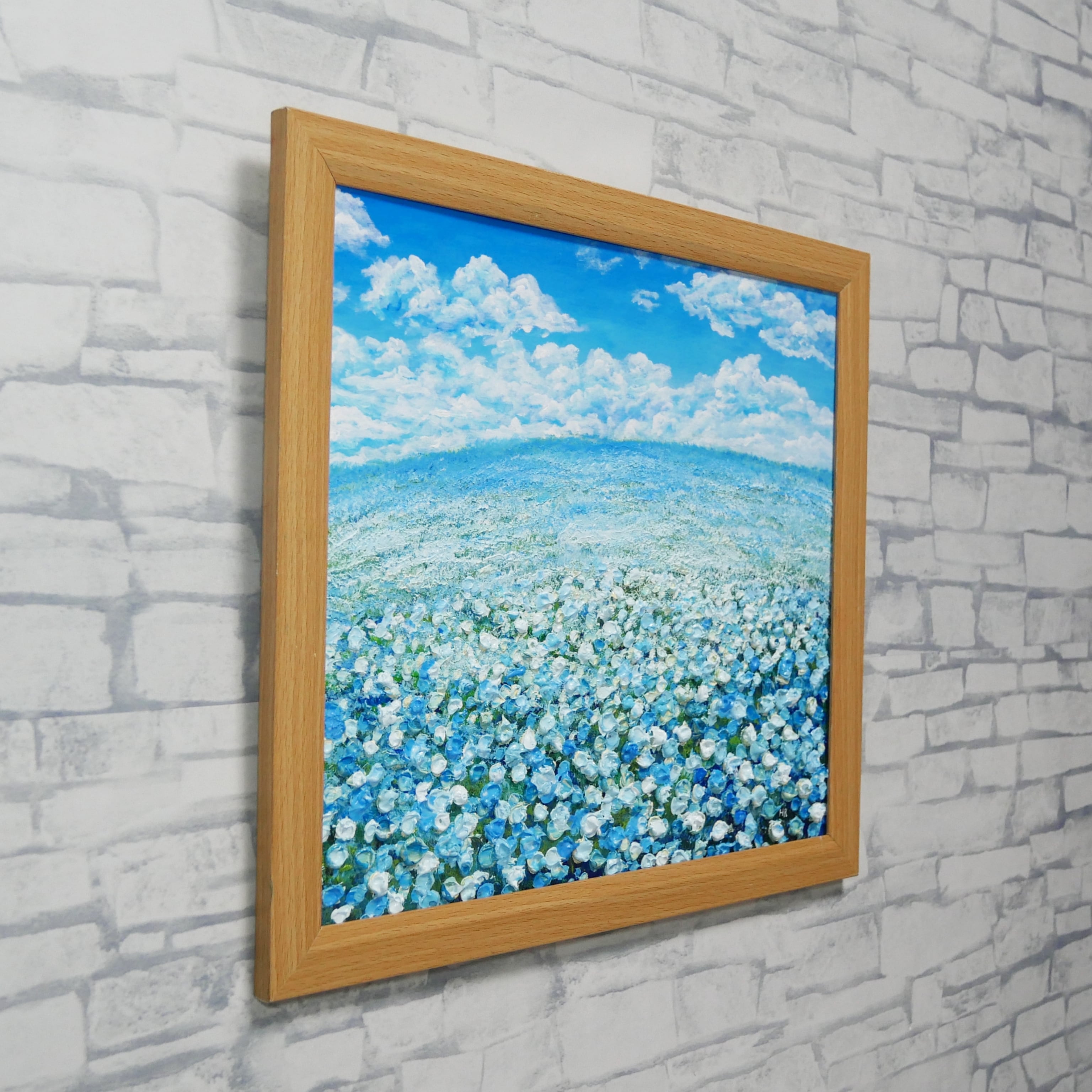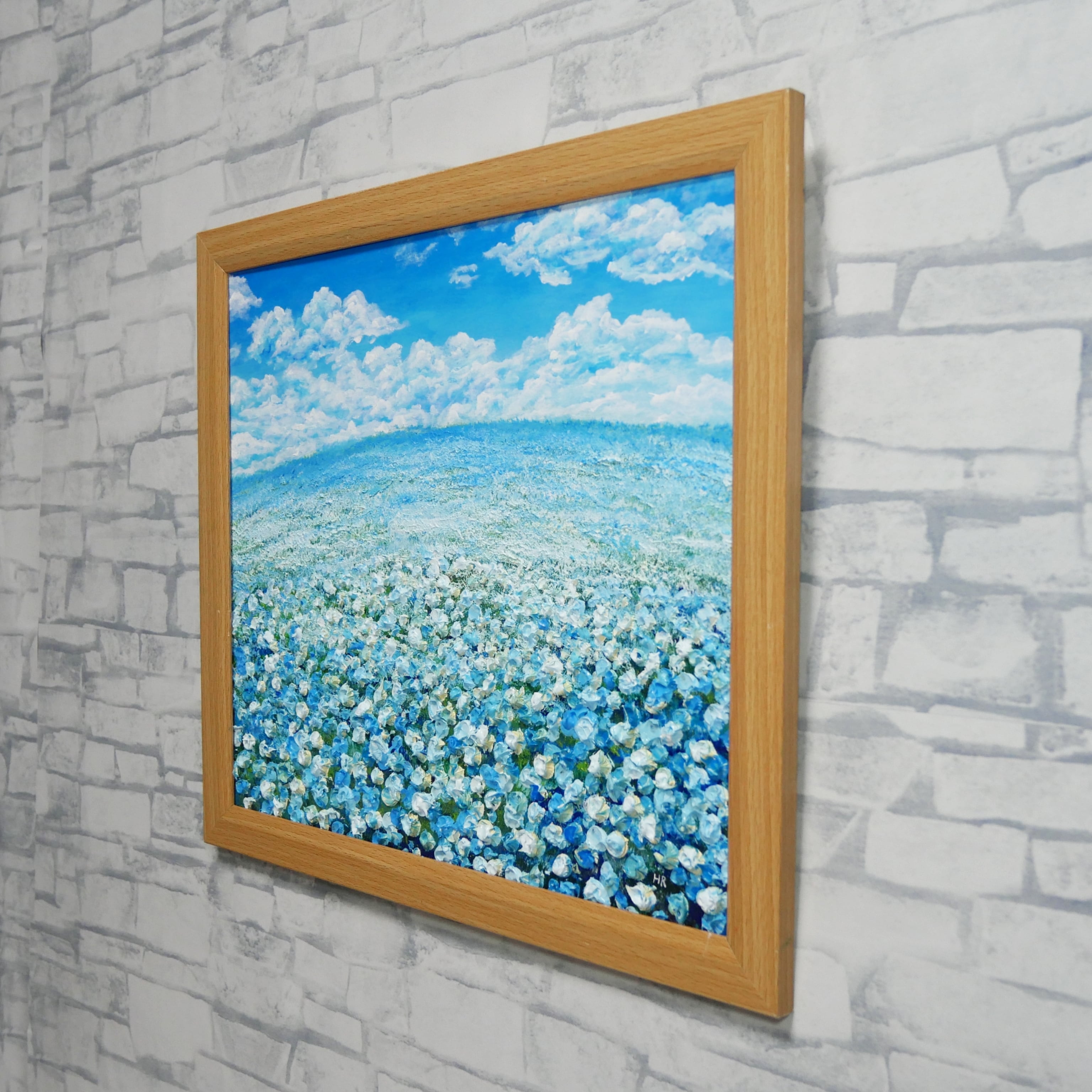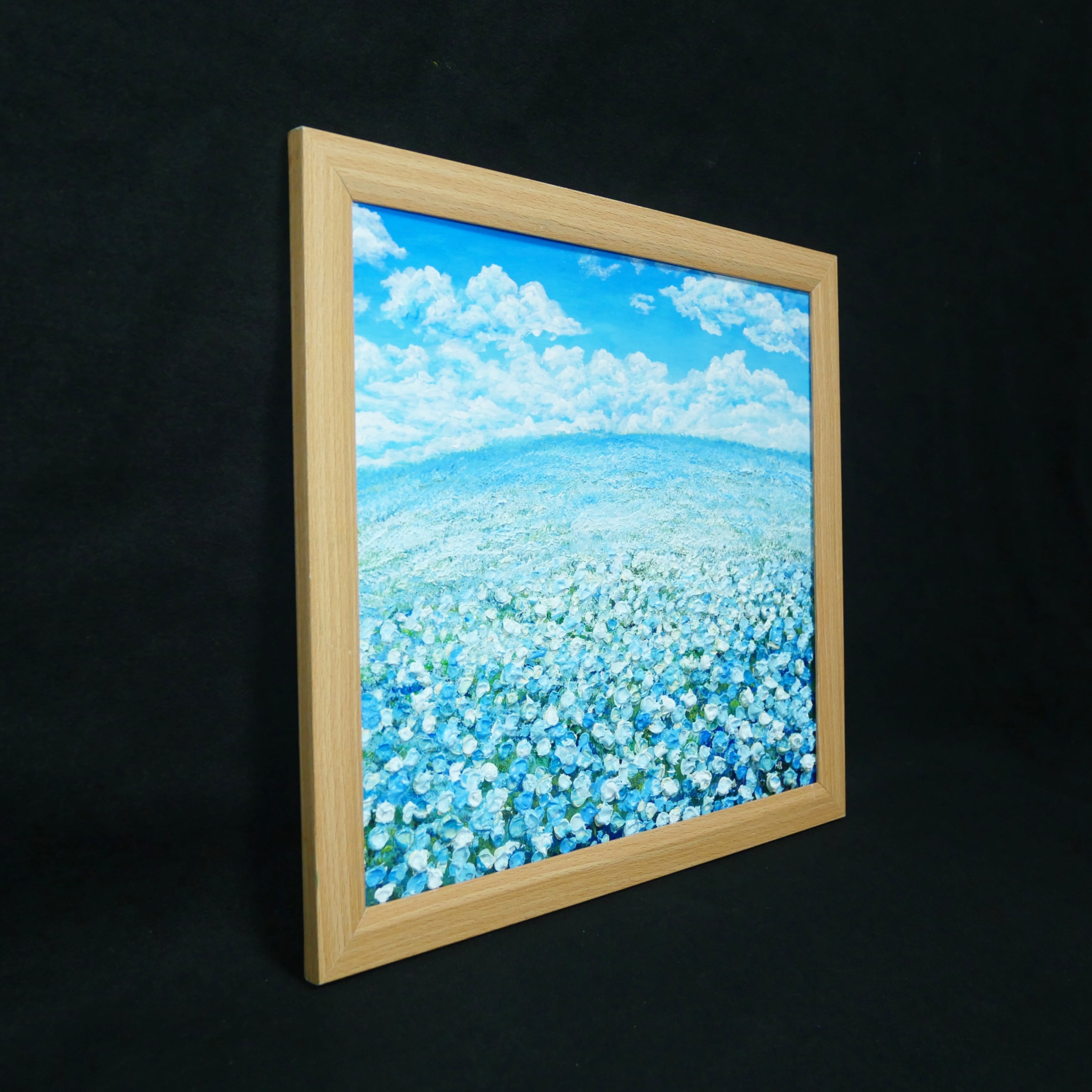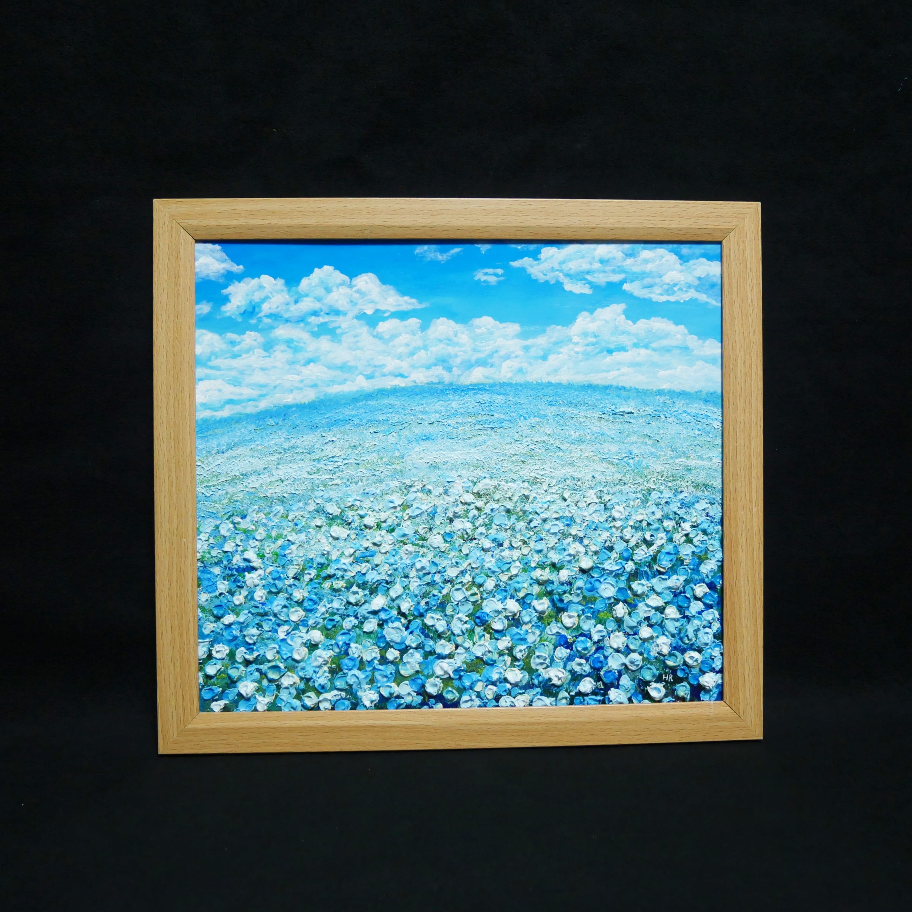 鮮やかな色彩:どこまでも続く青い空とふわりと浮かぶ雲、そしてネモフィラの花々が優美な青のグラデーションをもたらし、見る者をひきつけます。光の角度によって異なる表情を見せる油絵特有の質感は、一生もののアートとしての魅力を感じさせます。