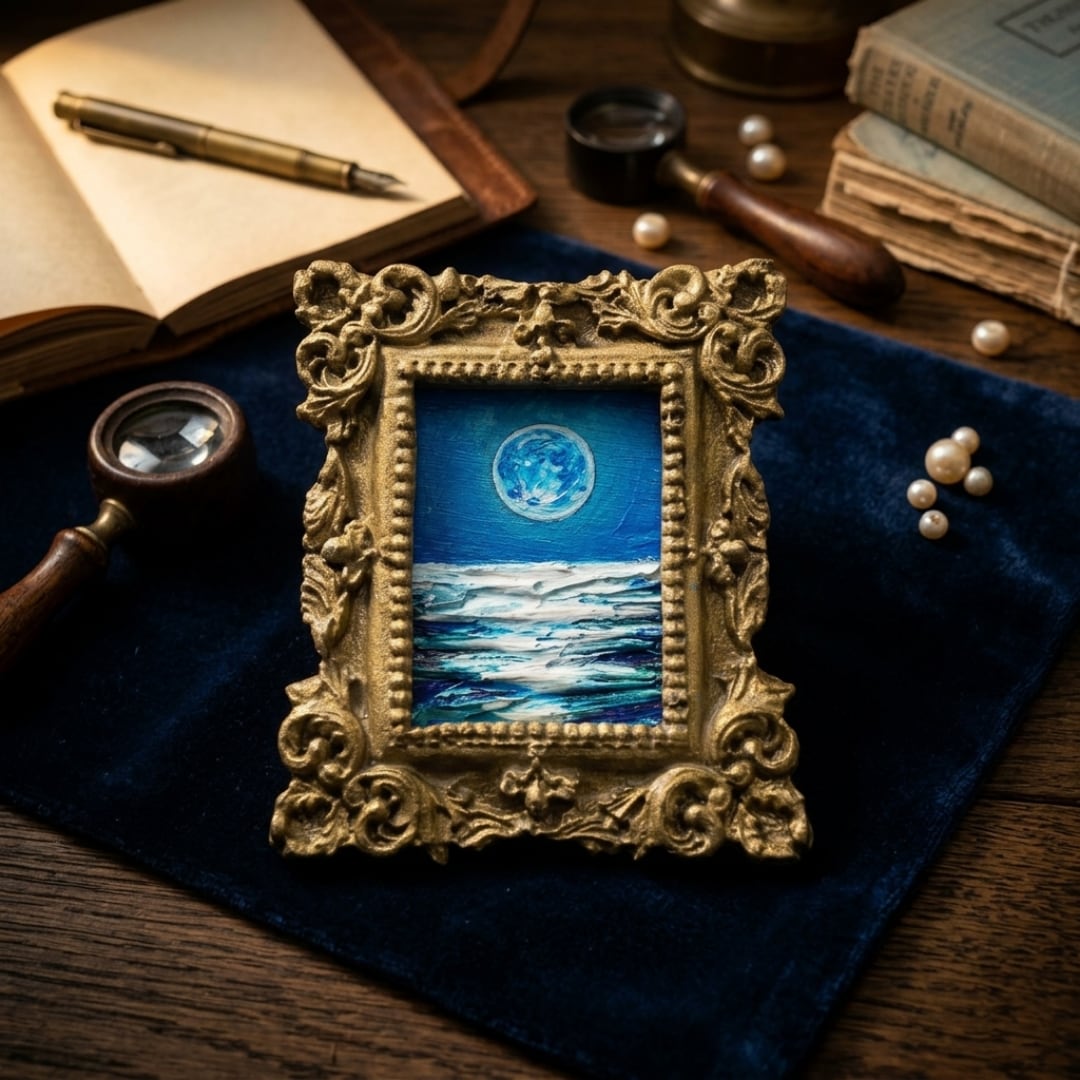 「Blue Moment 〜一生に一度の輝きをその手に〜」は、夢のような光景を手のひらサイズで楽しめる特別な油絵作品です。本物の質感を大切にした立体的な筆致(インパスト)が特徴で、光の当たり方で表情を変える海面は、まるで波が揺らめいているかのような臨場感を演出します。