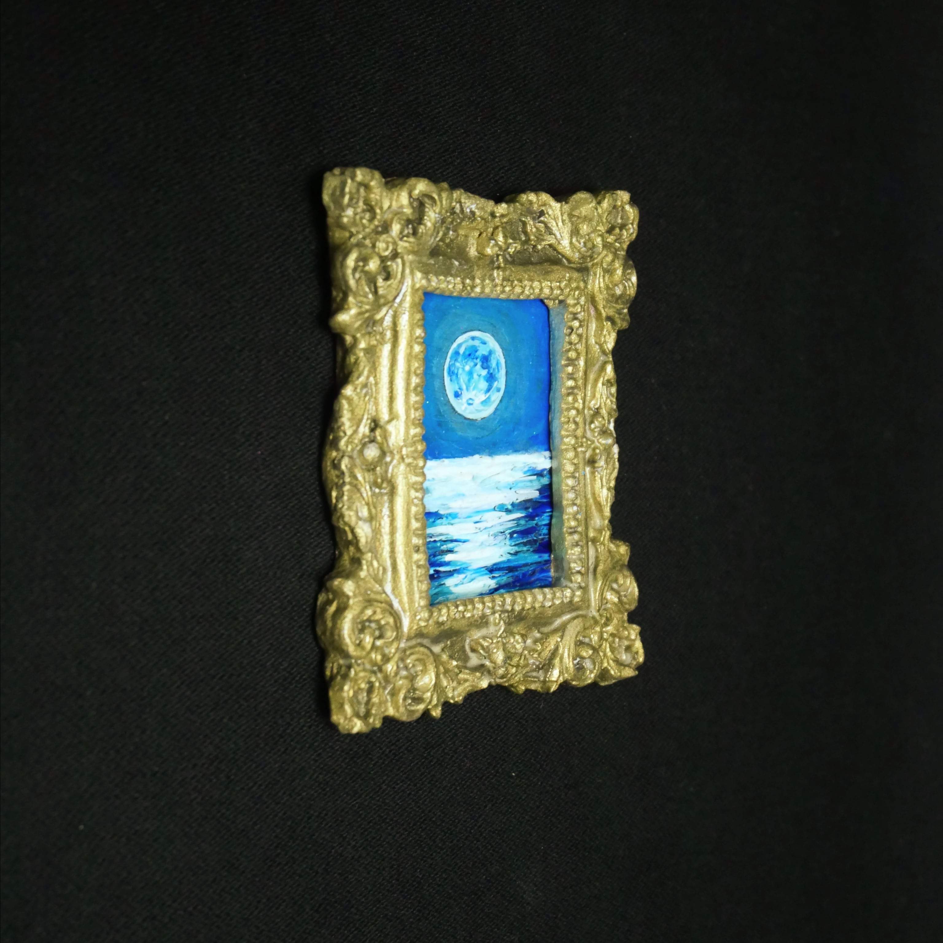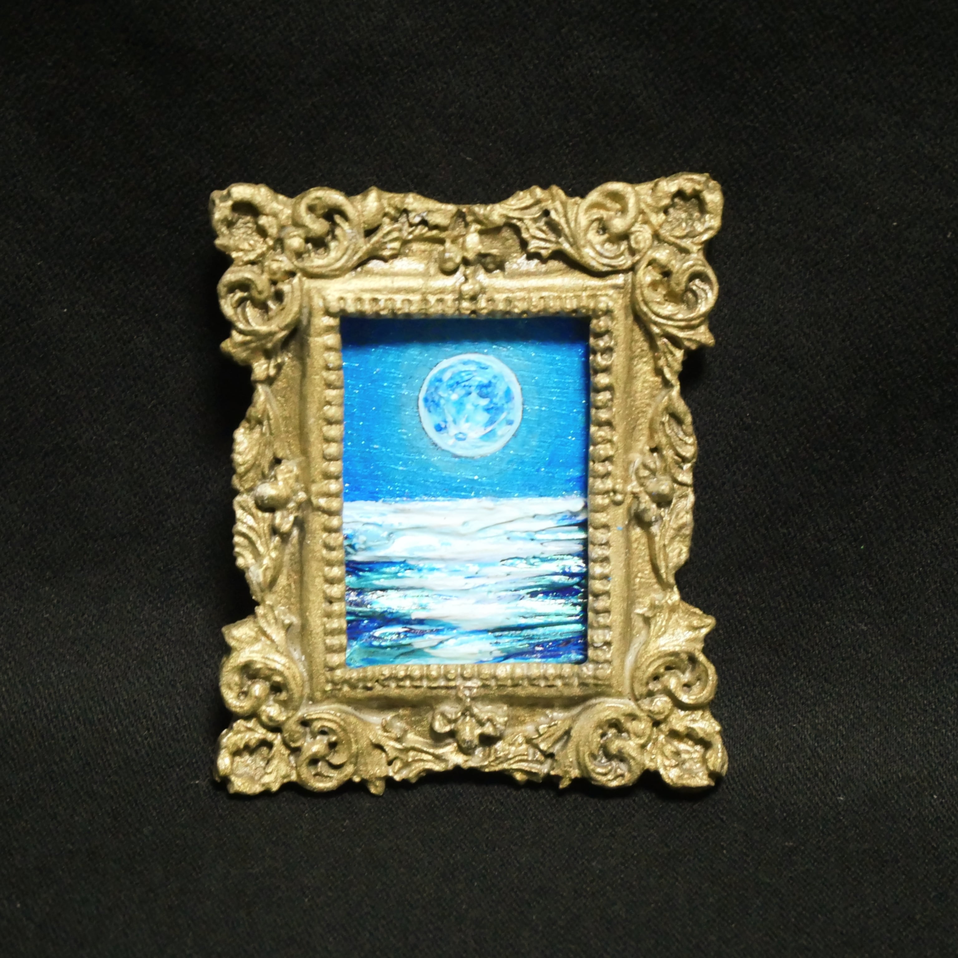 油絵 原画「Blue Moment」満月の夜空と青い海 ミニ絵画 額入り アートパネル 風水 癒し