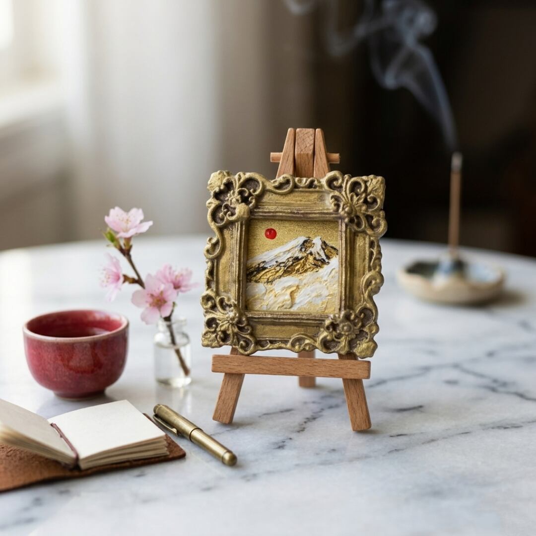「輝く富士と日輪」は、手のひらサイズの吉兆画であり、見る者すべての心を捉える特別な作品です。富士山と太陽、そして黄金という最強の組み合わせを、圧倒的な存在感で描き上げています。