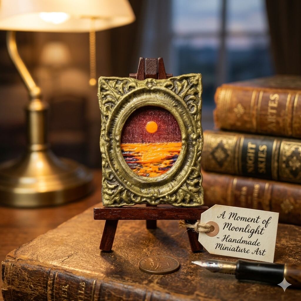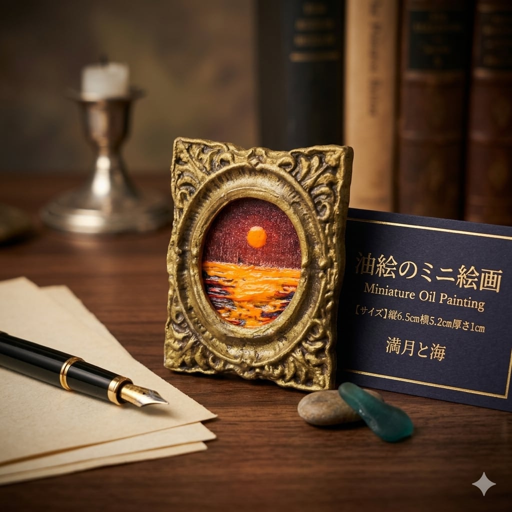 圧倒的な質感:インパスト技法による盛り上がった絵具の質感が、自然光によって変化し、見るたびに新しい表情を見せます。厚み1cmのミニチュアですが、本物の「絵画」としての存在感が際立ちます。