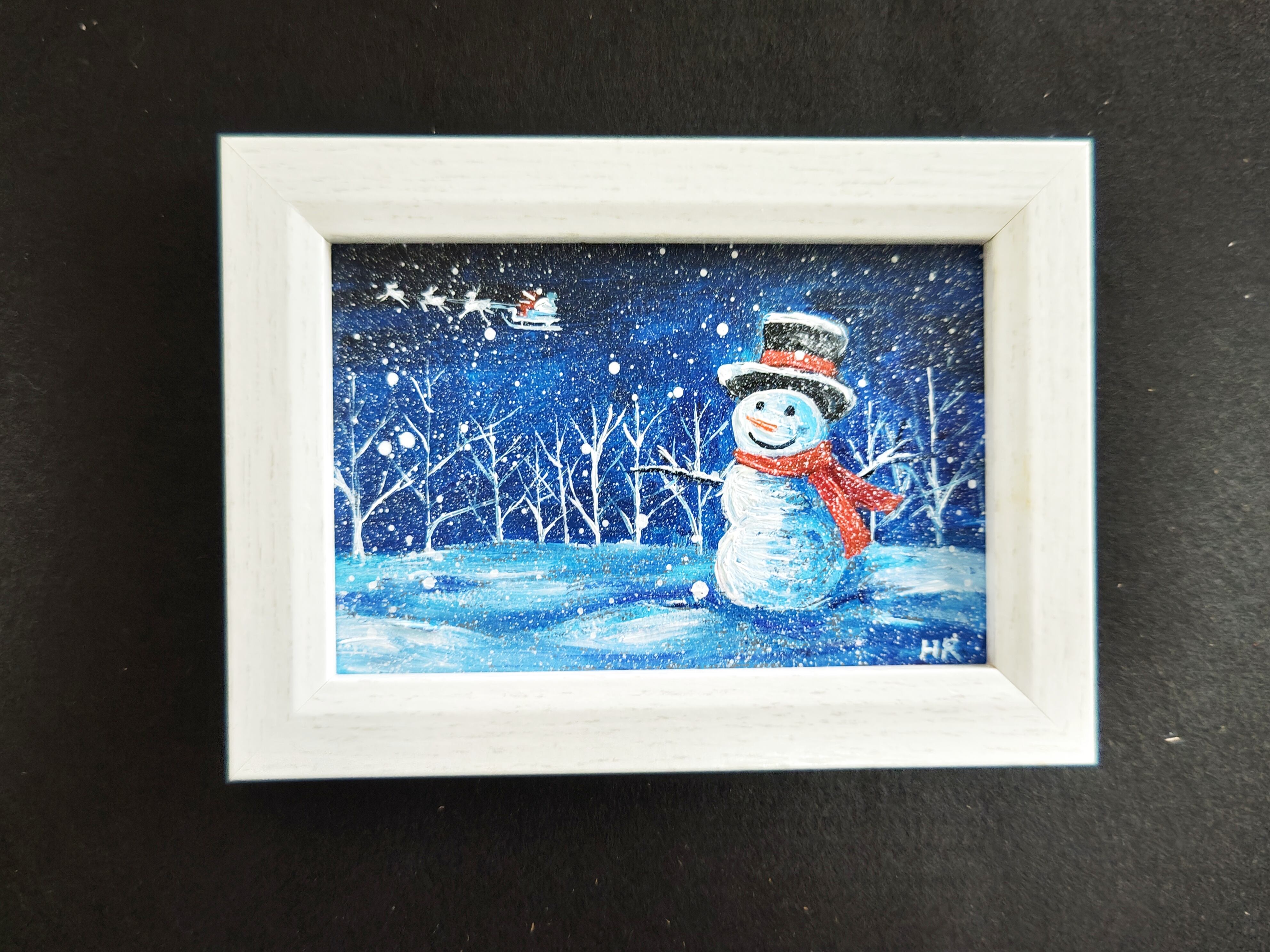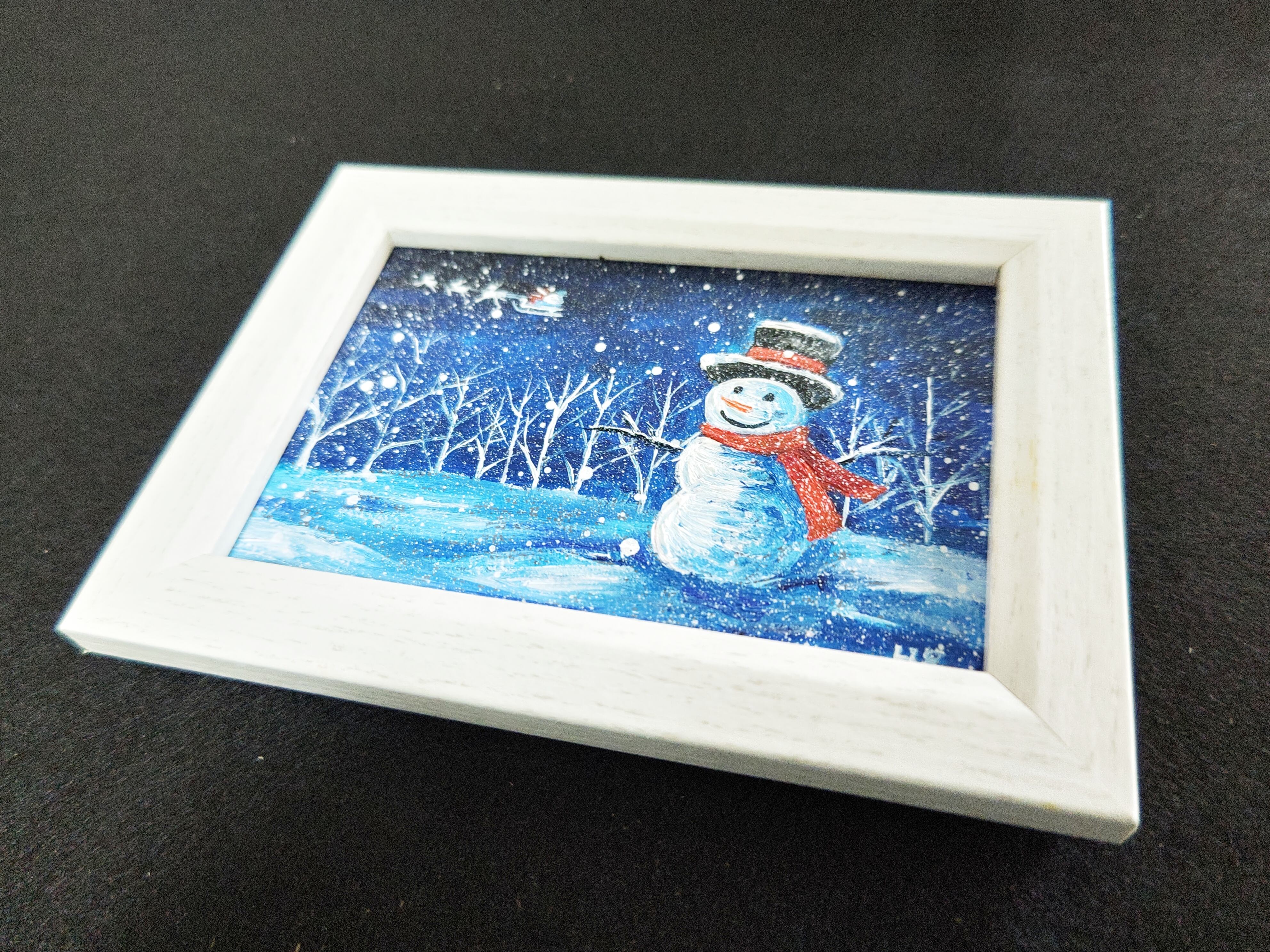 油絵 ミニ絵画【雪だるまとサンタクロース】