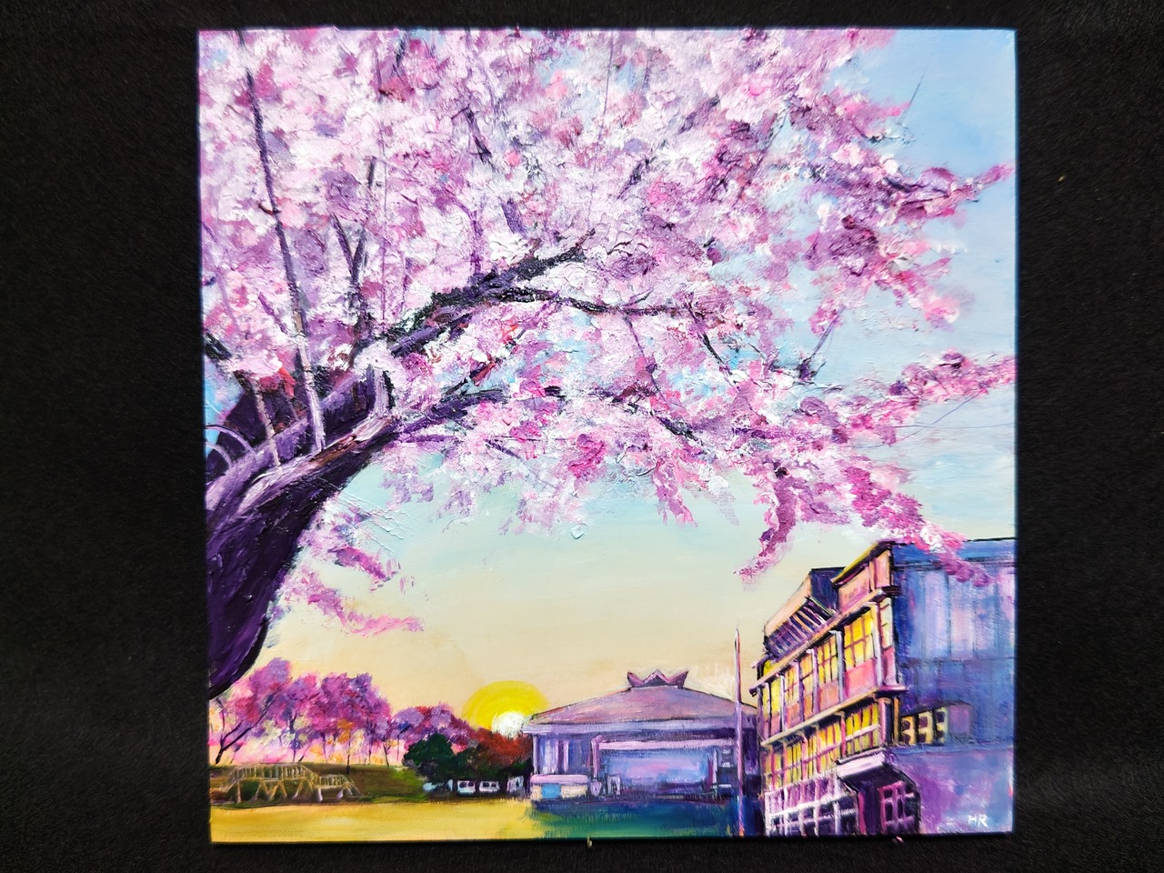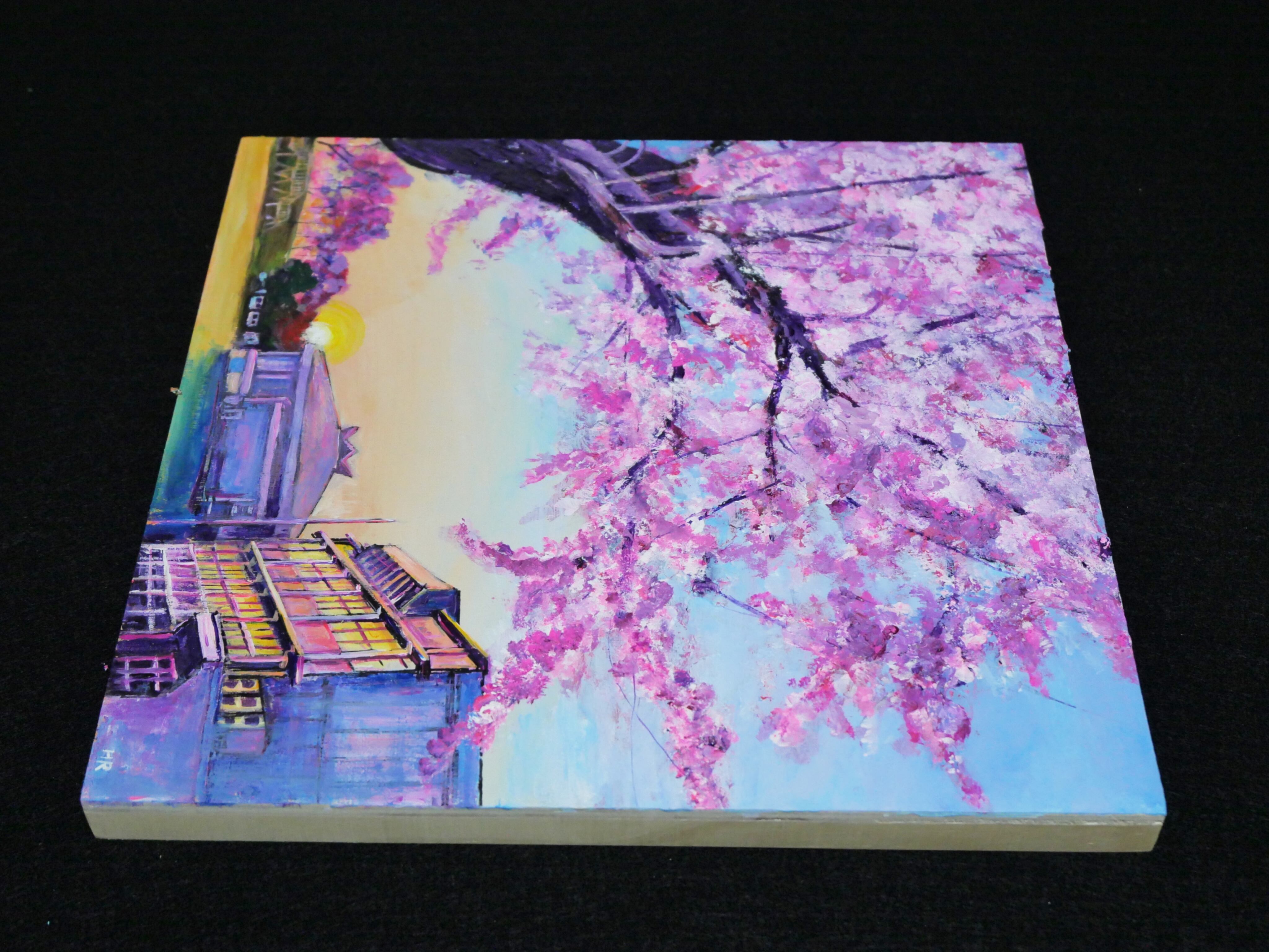ファブリックボード・パネル絵画【夕日に染まる学校の桜】