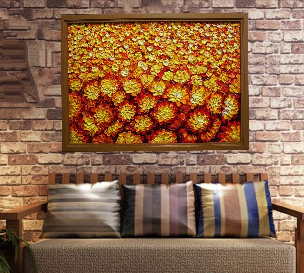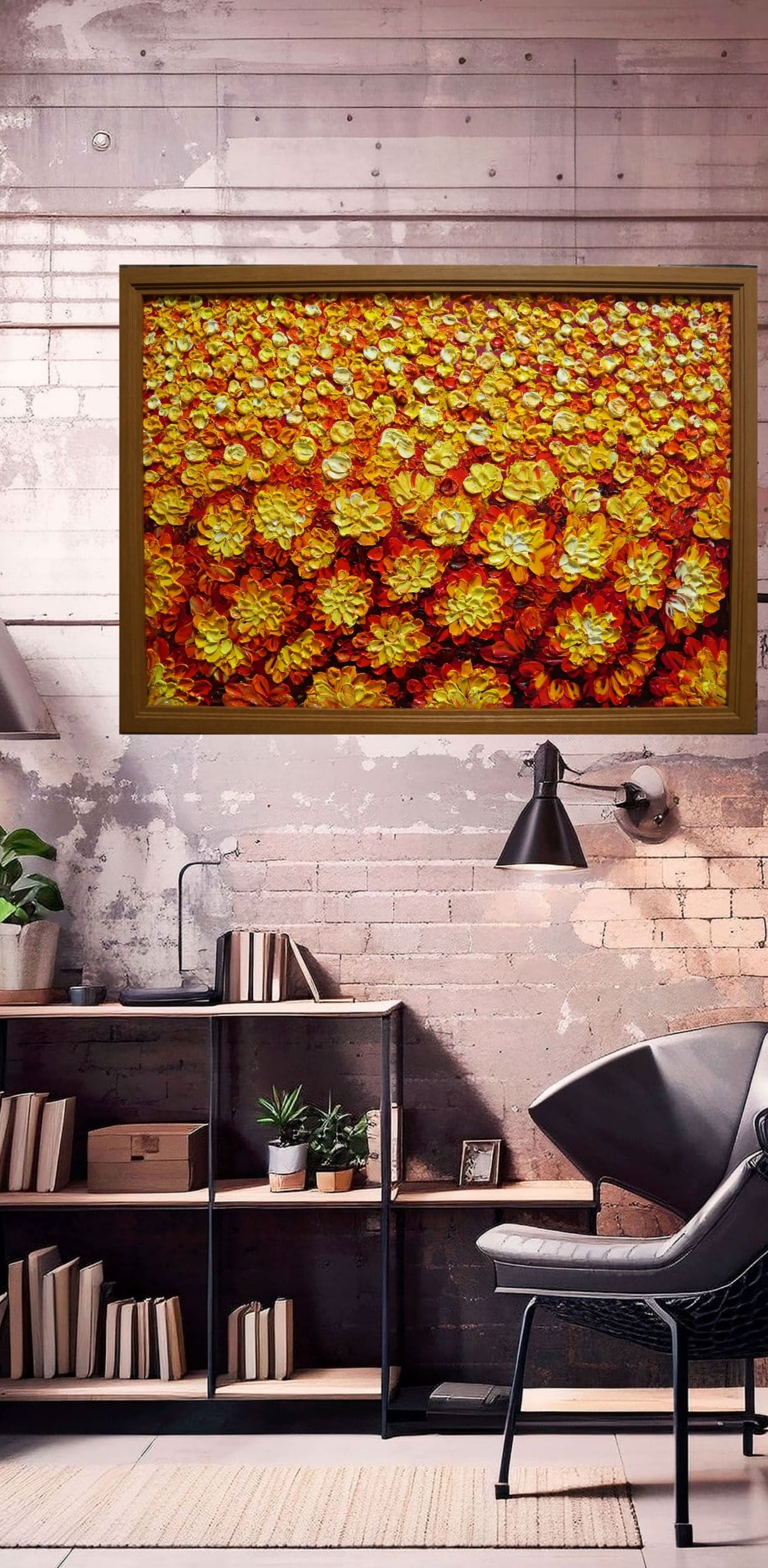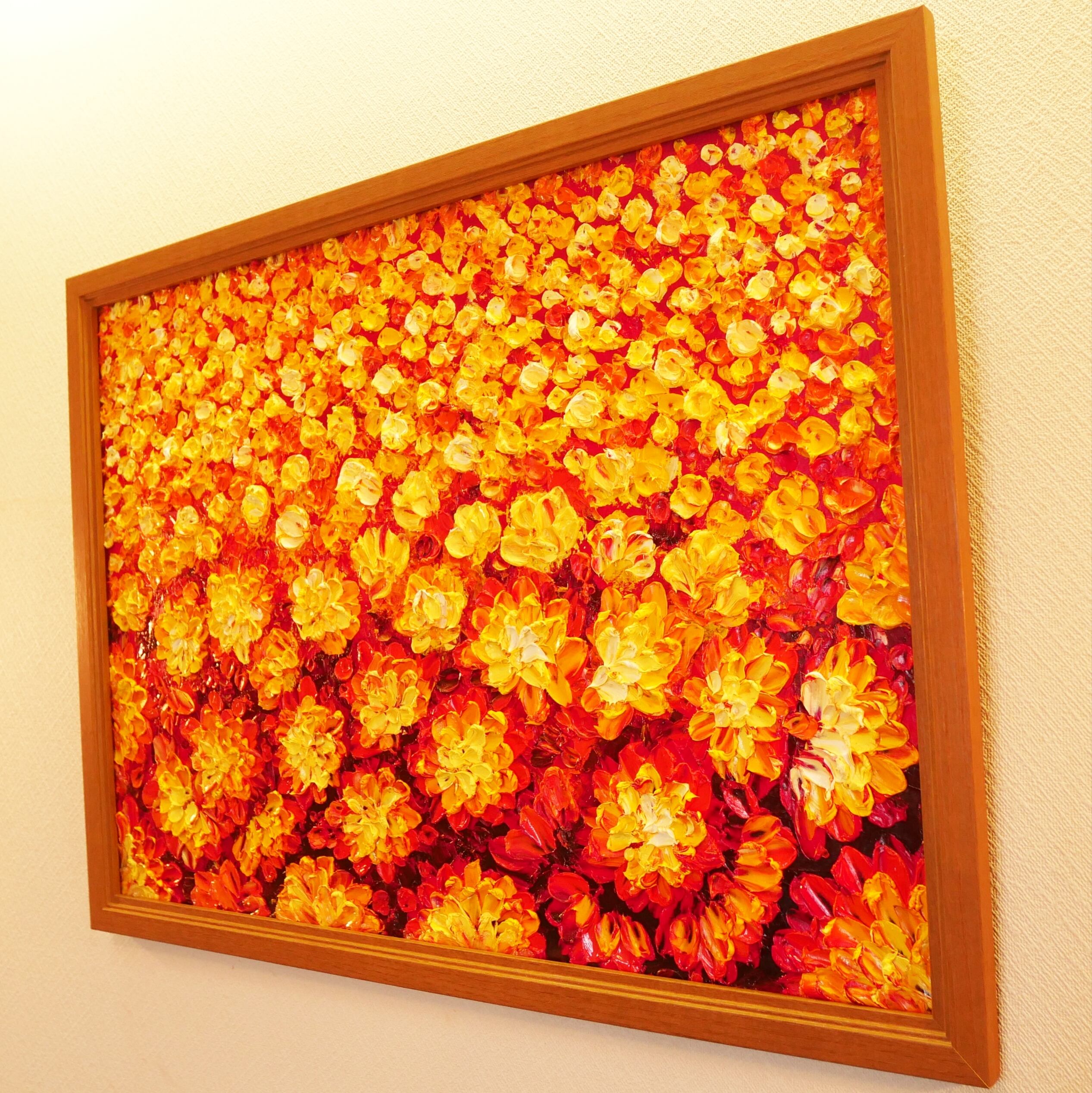 「マリーゴールド」は、色とりどりの花々が咲き誇る美しいマリーゴールド畑を描いた特別な油絵作品です。レモン色、黄色、オレンジ色、赤色の豊かな色合いが広がり、見る人に元気と温かさを届けることでしょう。この作品は、育まれた自然の美しさを表現し、インテリアに華やかな印象を与え、明るい空間を演出します。