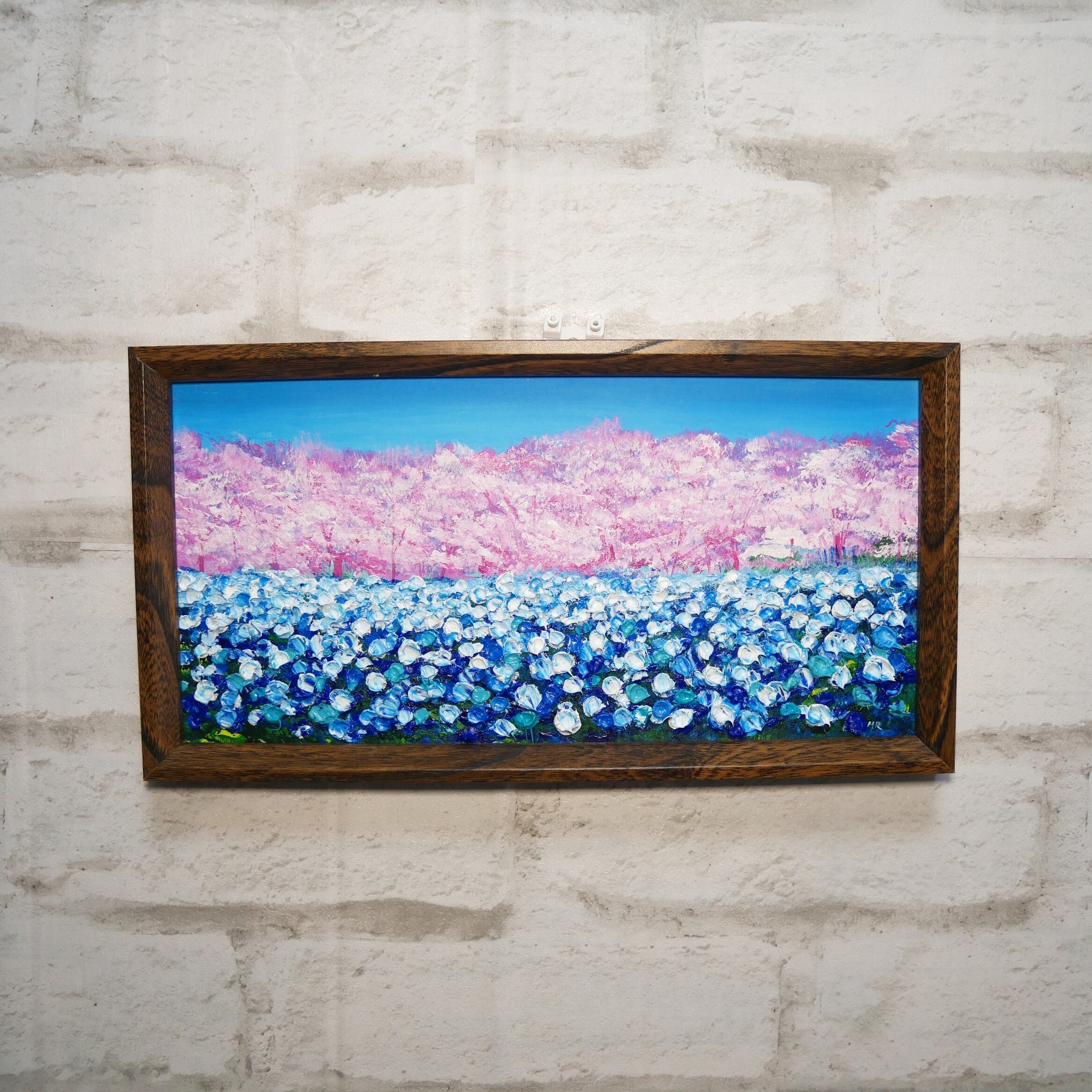 長方形ミニ絵画【ネモフィラとサクラ】は、美しい花々が描かれた油彩画です。繊細な筆致で表現されたネモフィラとサクラの花々が、どこか懐かしい幸せな気持ちを呼び起こします。小さなサイズなので、玄関やリビングなど、どんな場所にも飾りやすいアイテムです。