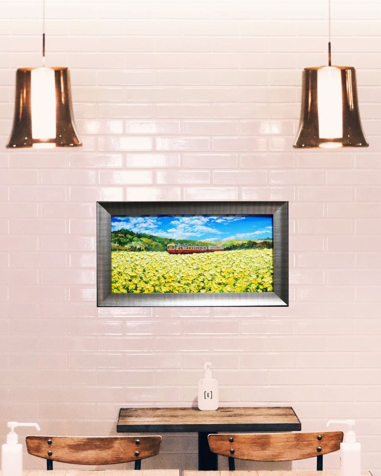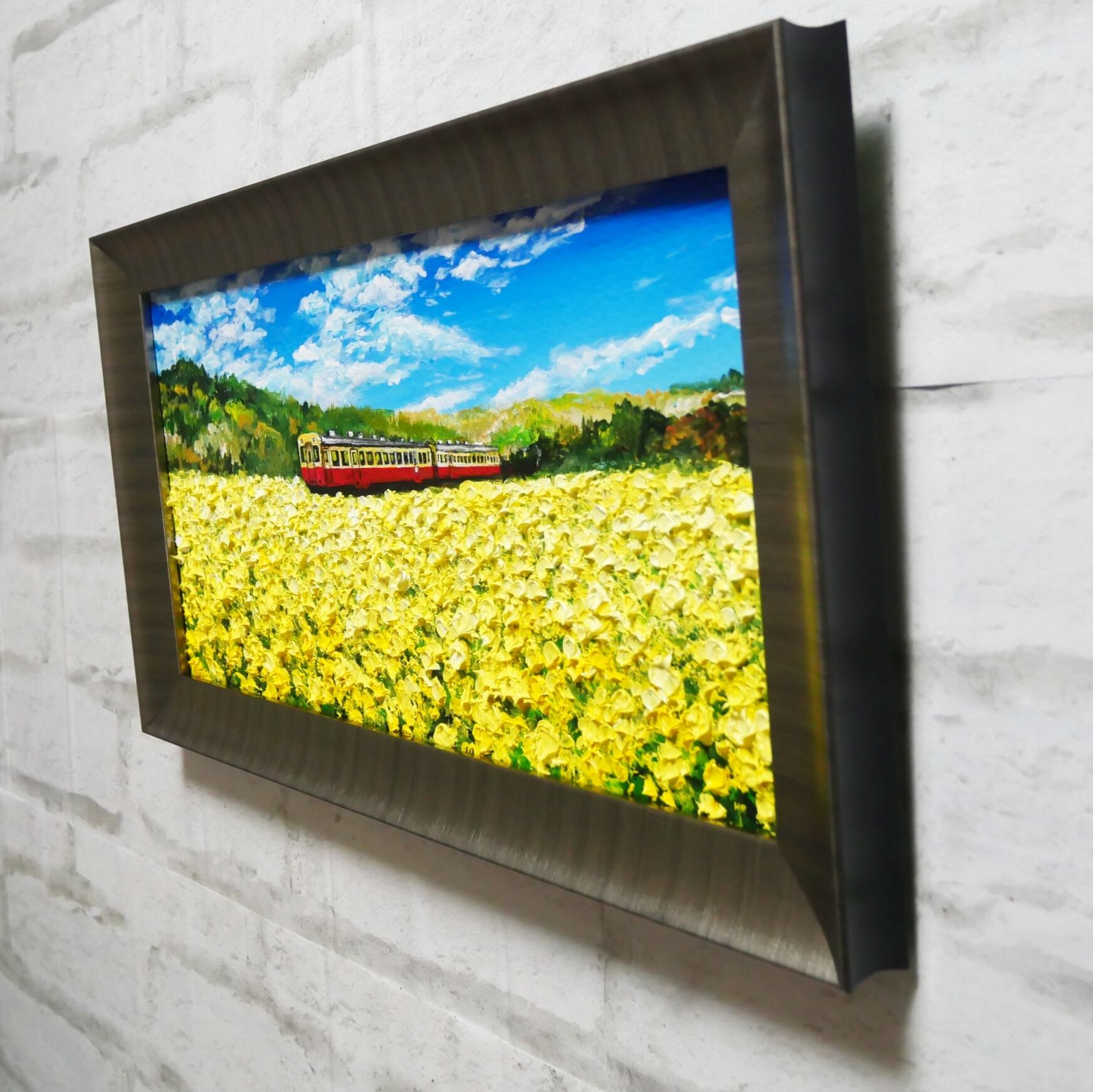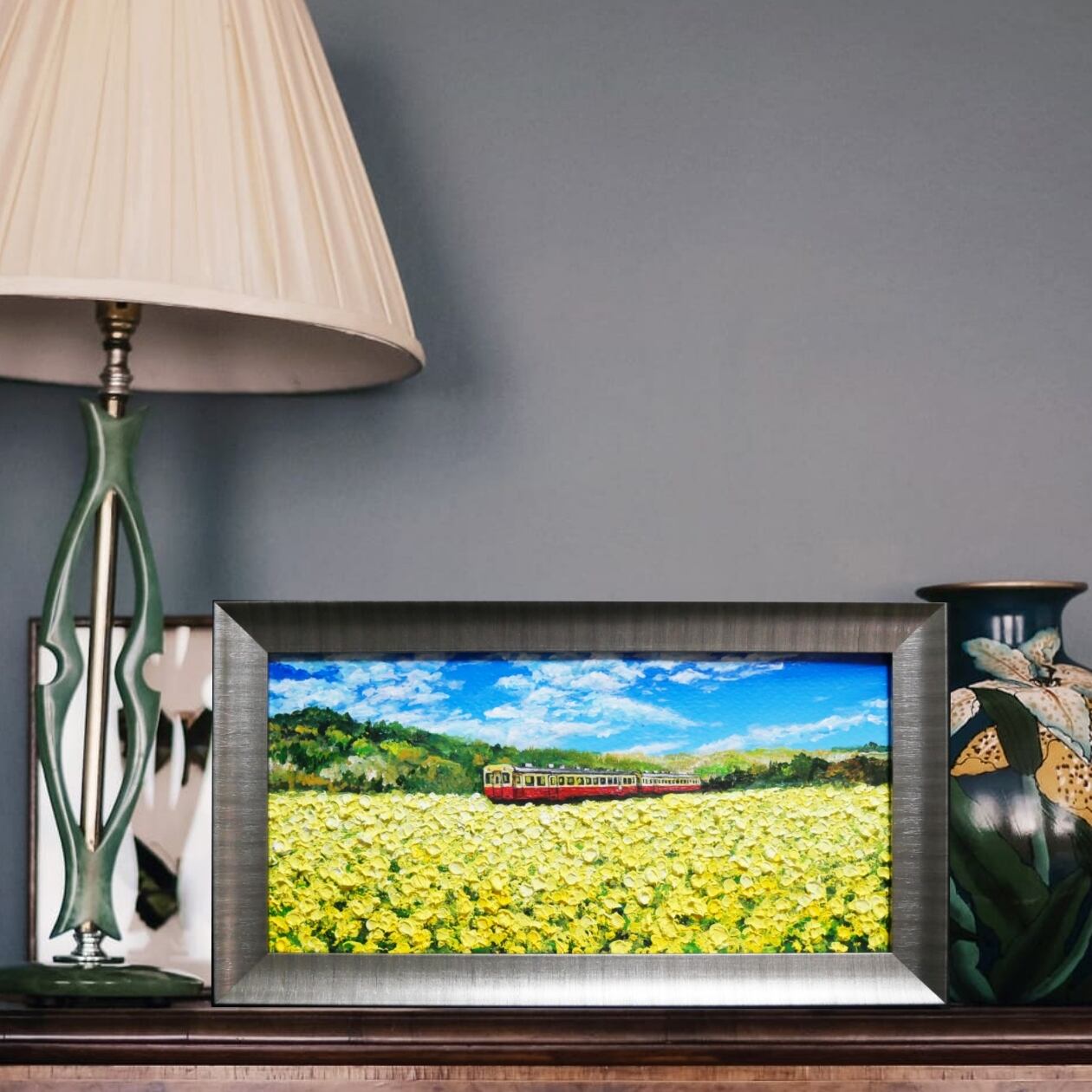 "菜の花畑を走る小湊鉄道"を描いた油彩画。豊かな色彩で描かれた風景は、まるでその場にいるかのような感覚を味わえる作品です。小湊鉄道が通る菜の花畑の美しさが、壁に飾られる度に気持ちを癒してくれることでしょう。絵の中に広がる景色は、日常の喧騒を忘れさせ、心に豊かな安らぎを運んでくれることでしょう。この美しい風景画で、日々の癒しをお届けいたします。