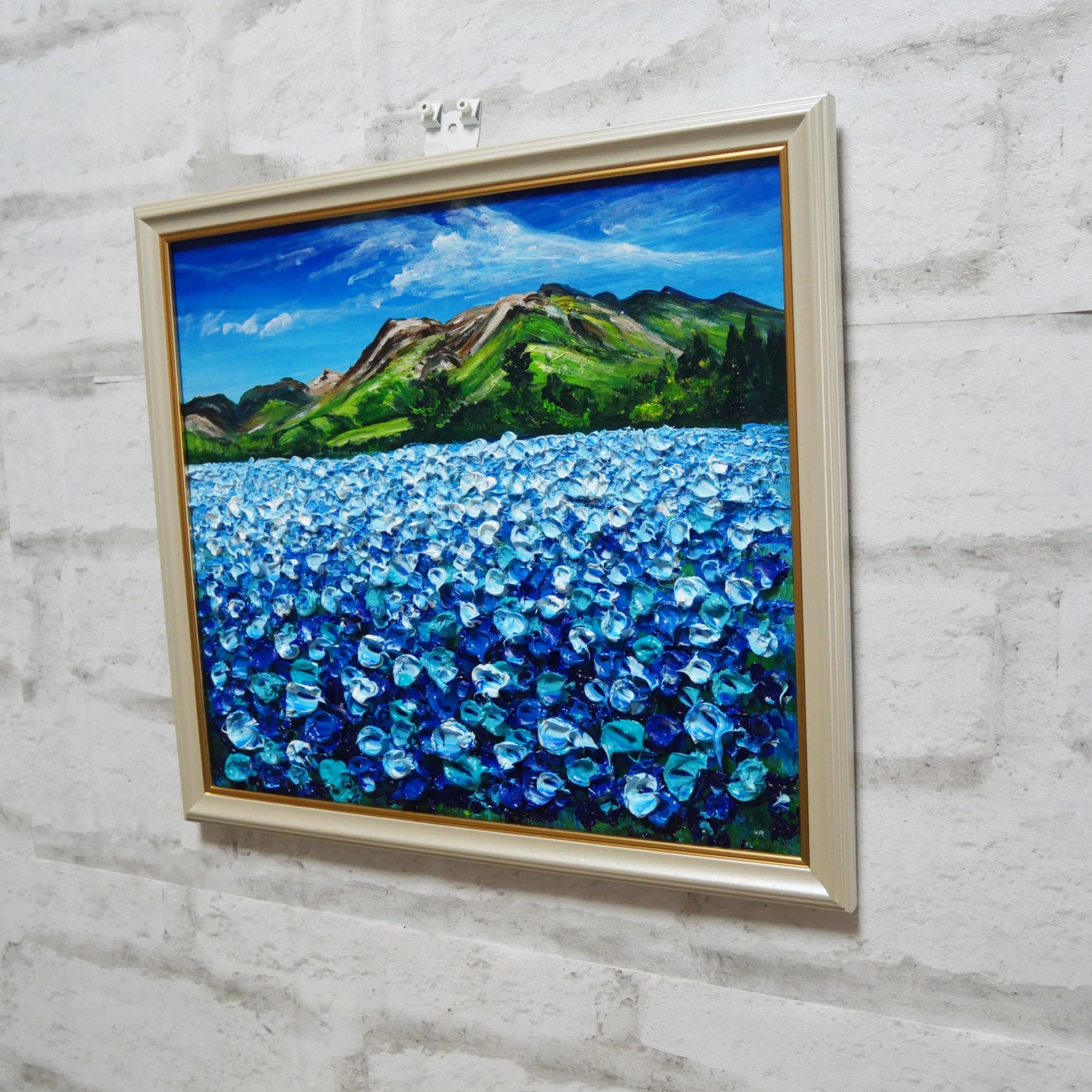 九重連山とネモフィラ畑の美しい風景を油絵に描いた作品です。久住花公園のネモフィラ畑と九重連山の絶景をお楽しみいただけます。丹念に描かれた花々の色彩と山々の迫力が、部屋を飾るだけでなく心を和ませてくれます。日本の美しい自然を描いたこの作品は、インテリアとしてだけでなく贈り物としても喜ばれること間違いなしです。