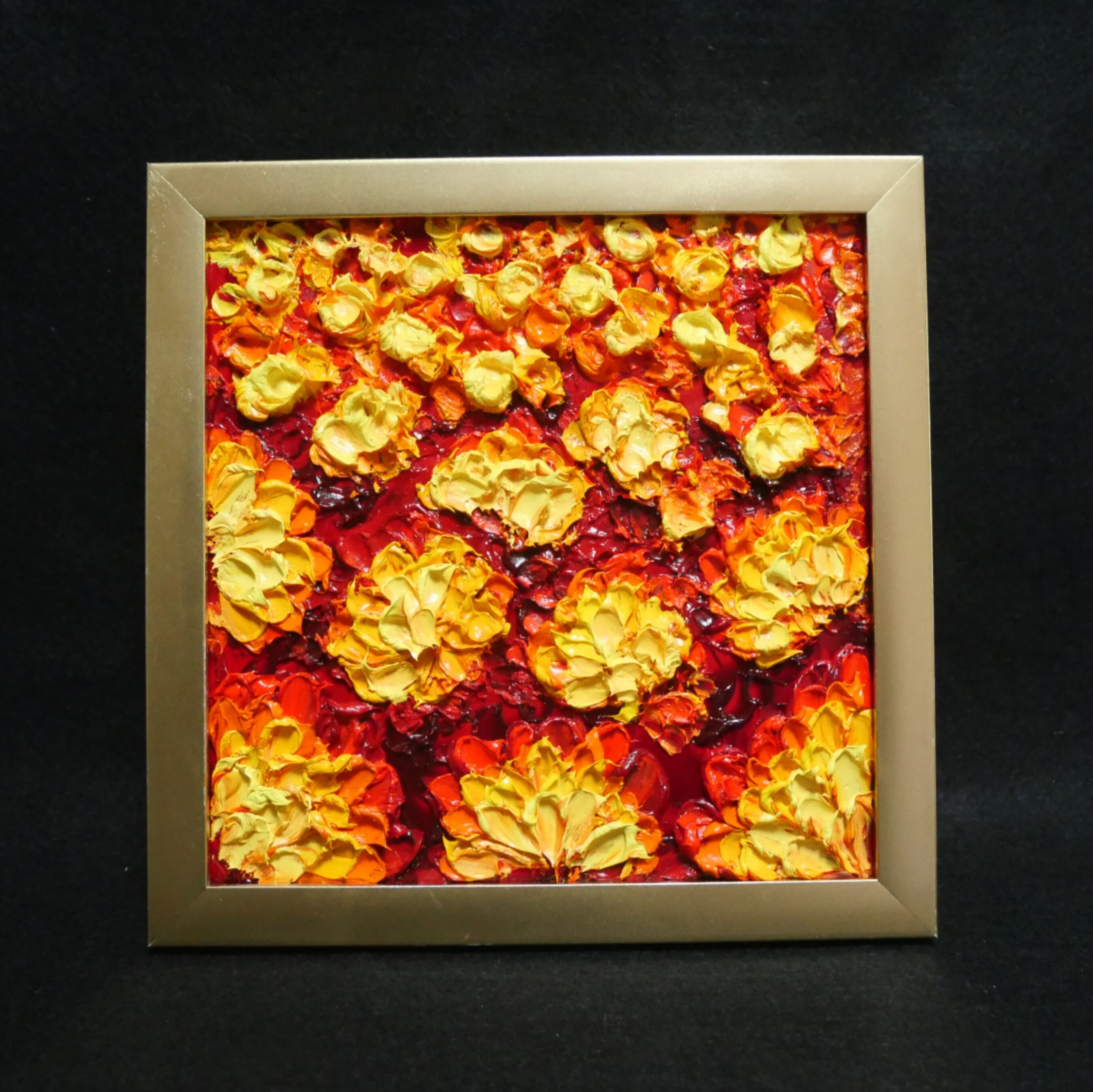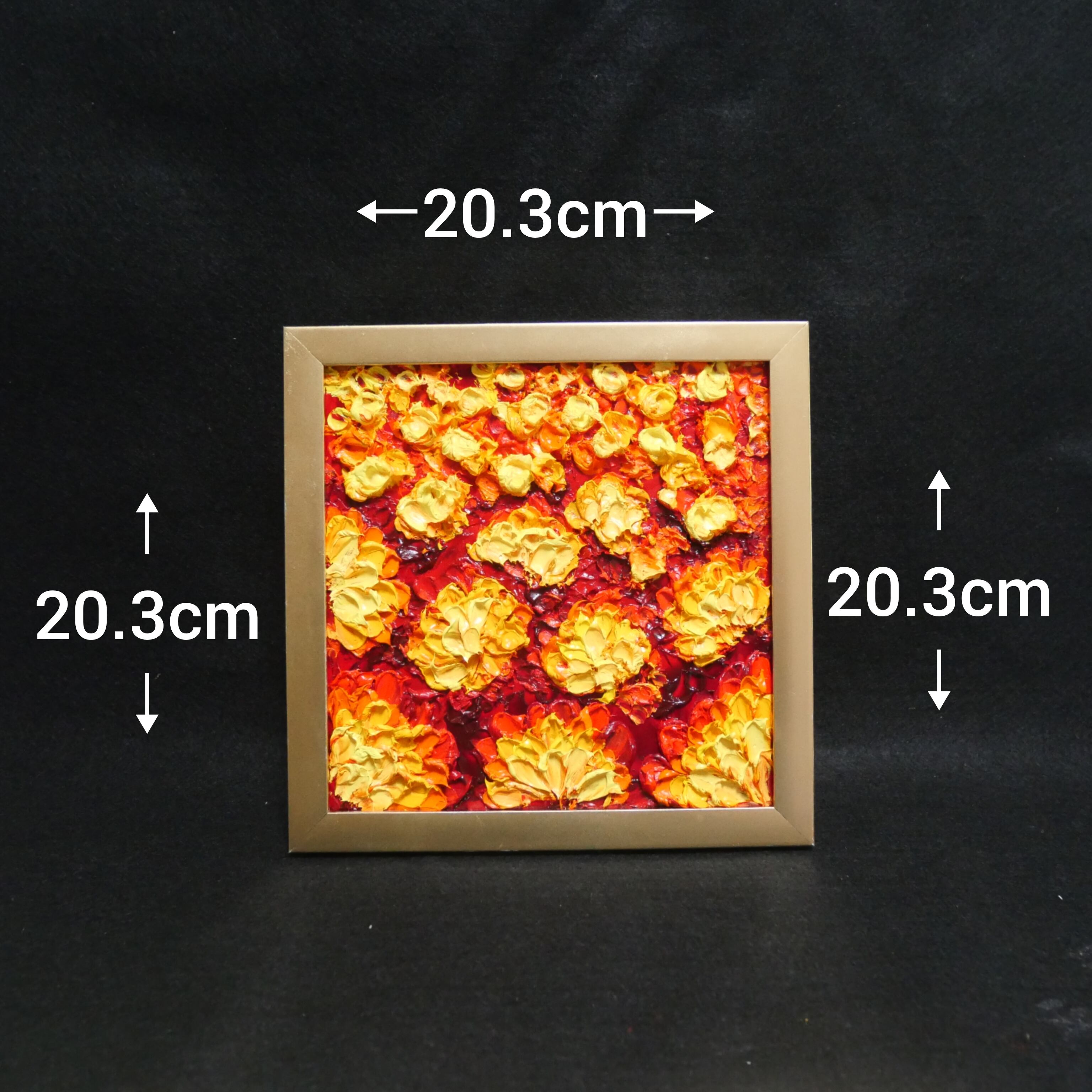 マリーゴールドの花々が描かれたミニ絵画です。お部屋を華やかに彩ります。