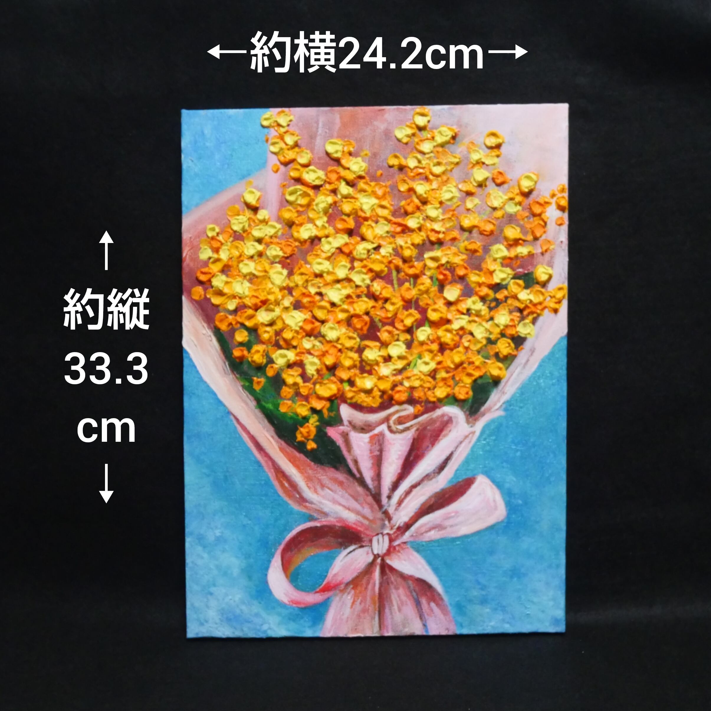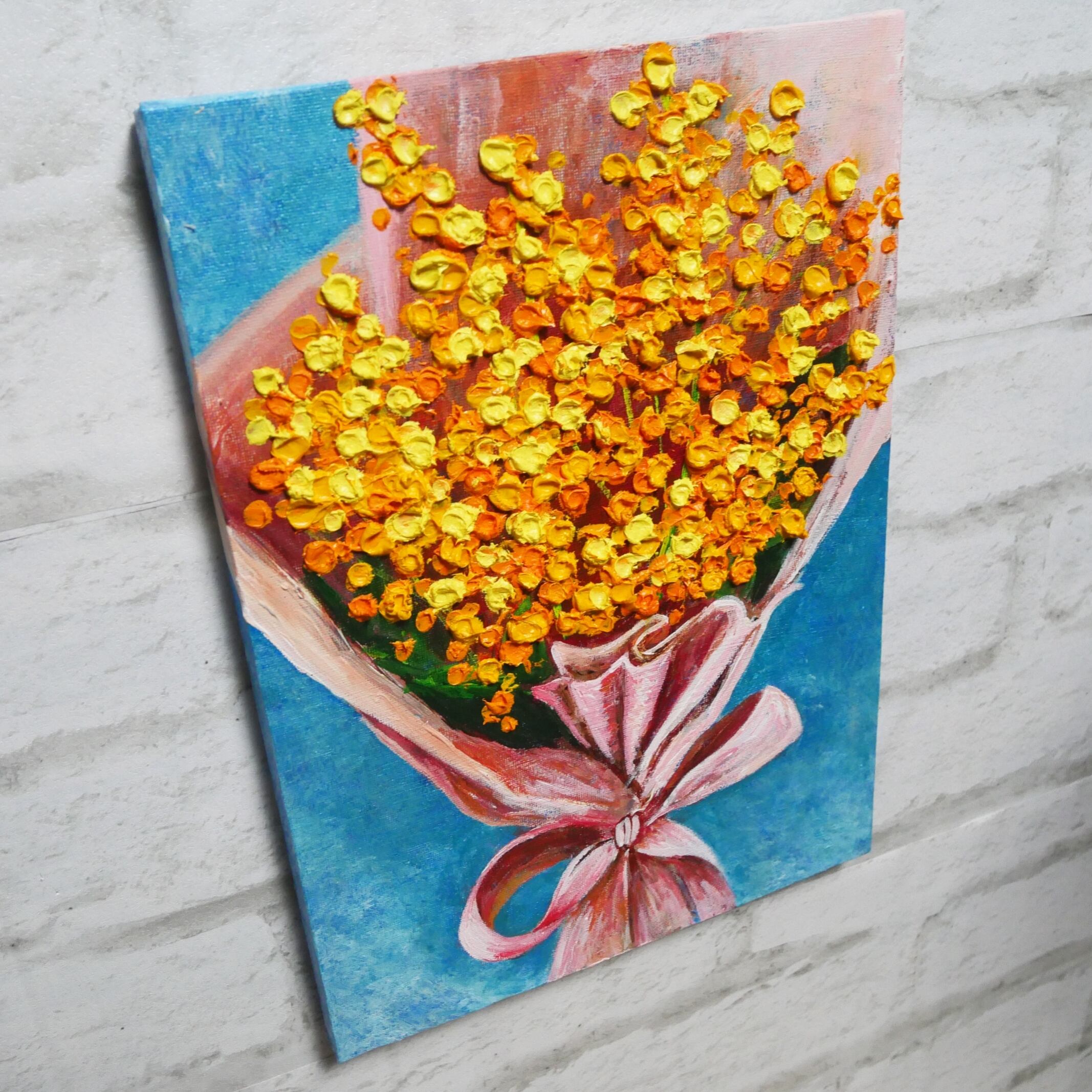 油彩画の美しさが光る、ミモザの花を描いた絵画です。柔らかな色合いが癒しを与え、お部屋を華やかに演出します。手描きによる丁寧な仕上がりで、リアルな花々が生き生きと厚塗りで描きました。。豊かな表現力で、花々の優美な姿を再現しています。