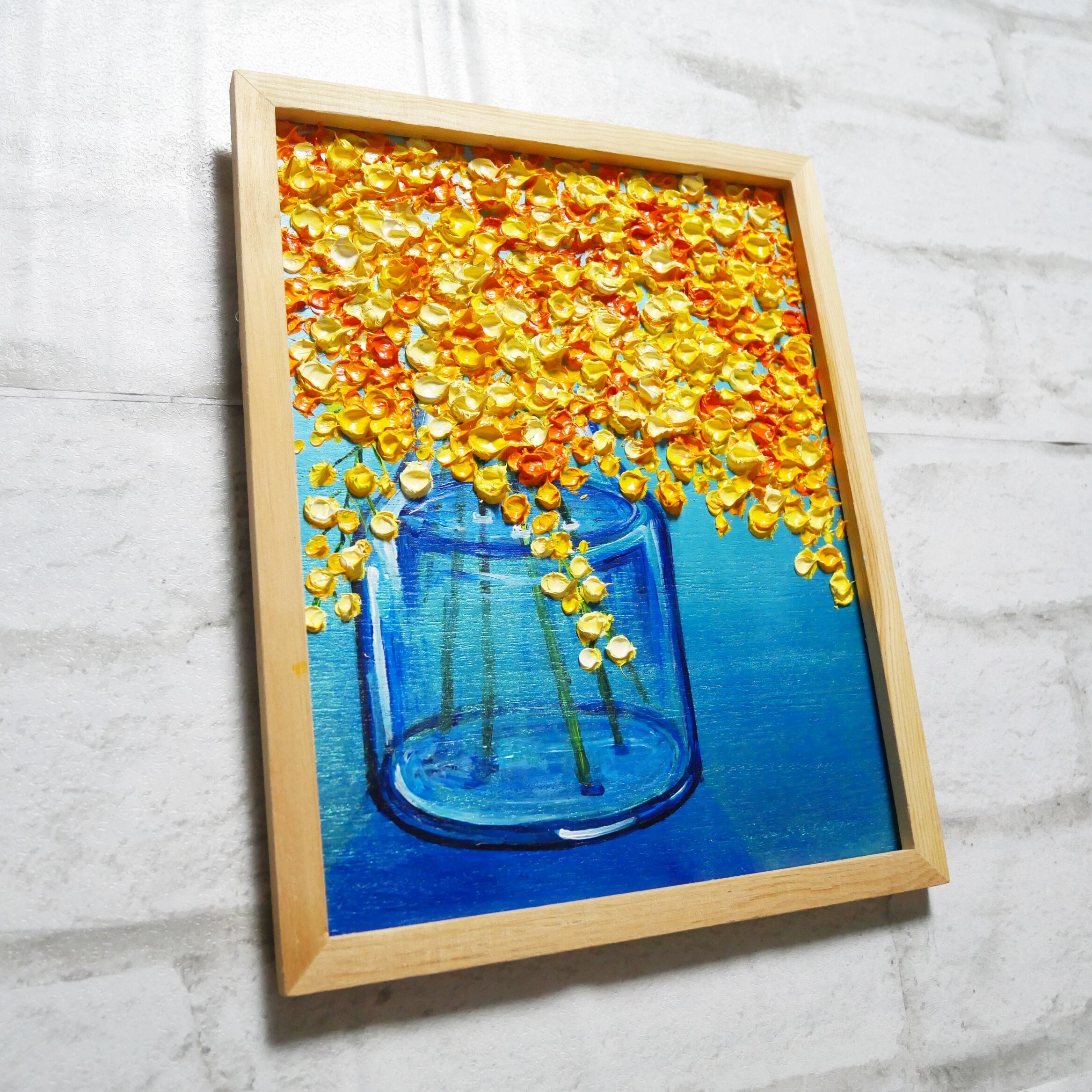 ミモザの花々が優しい色合いで描かれ、暖かい日差しを感じさせます。部屋のアクセントに最適で、癒しの空間を演出してくれる油絵作品です。