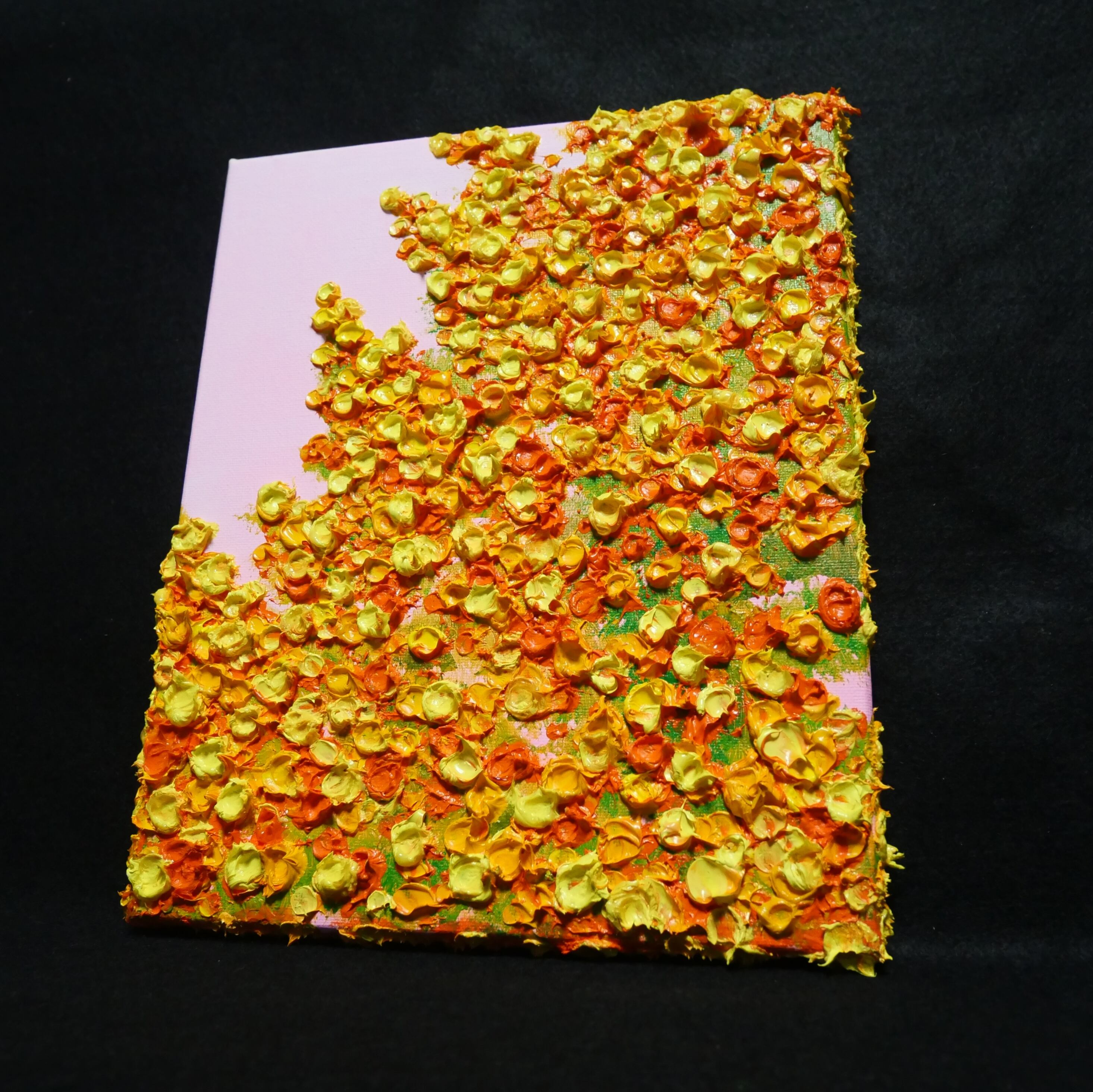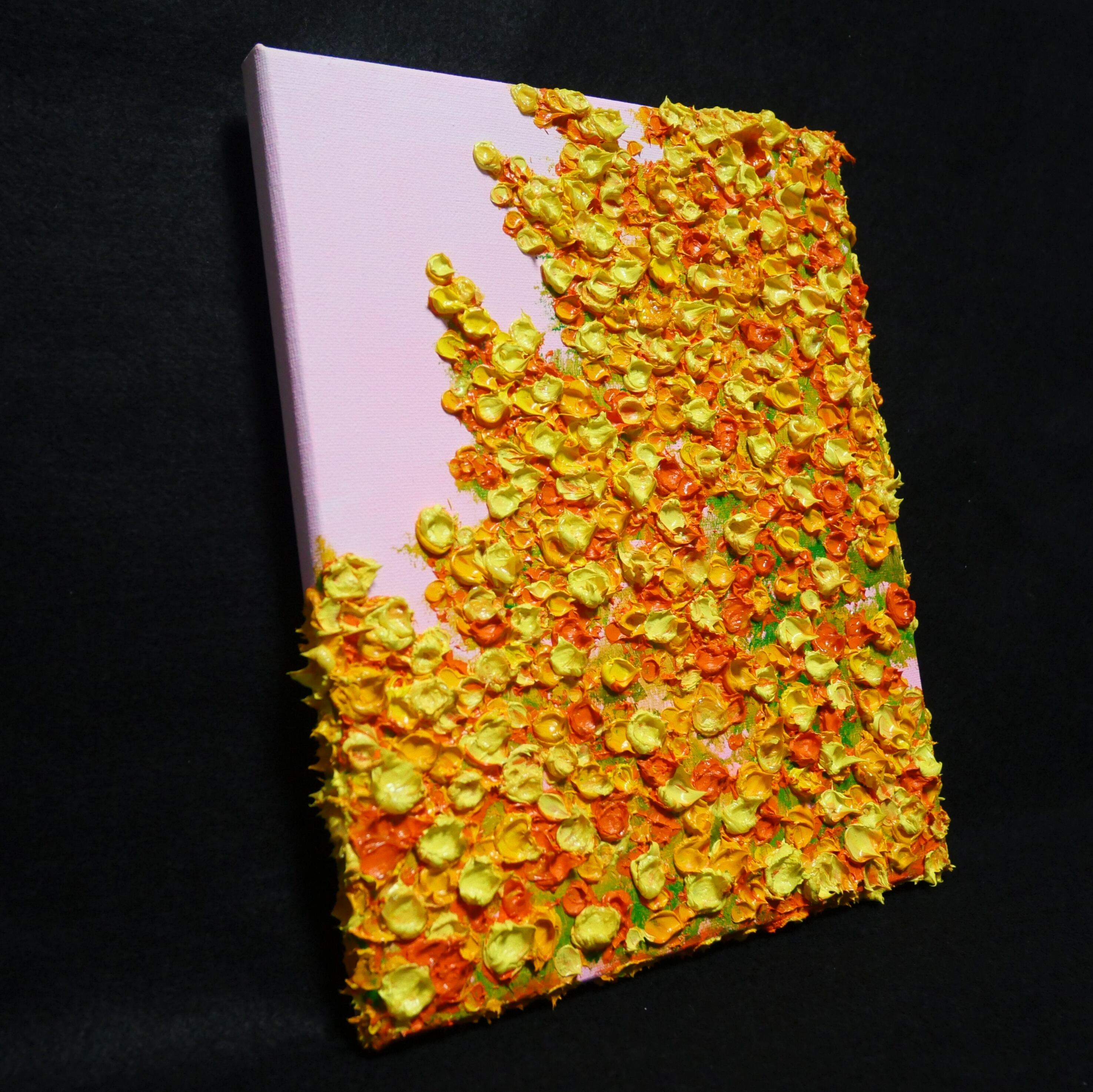 春を彩る美しいミモザの花々を描いた油絵です。ピンク色の背景が作り出す温かい雰囲気は、部屋を明るく華やかに演出してくれます