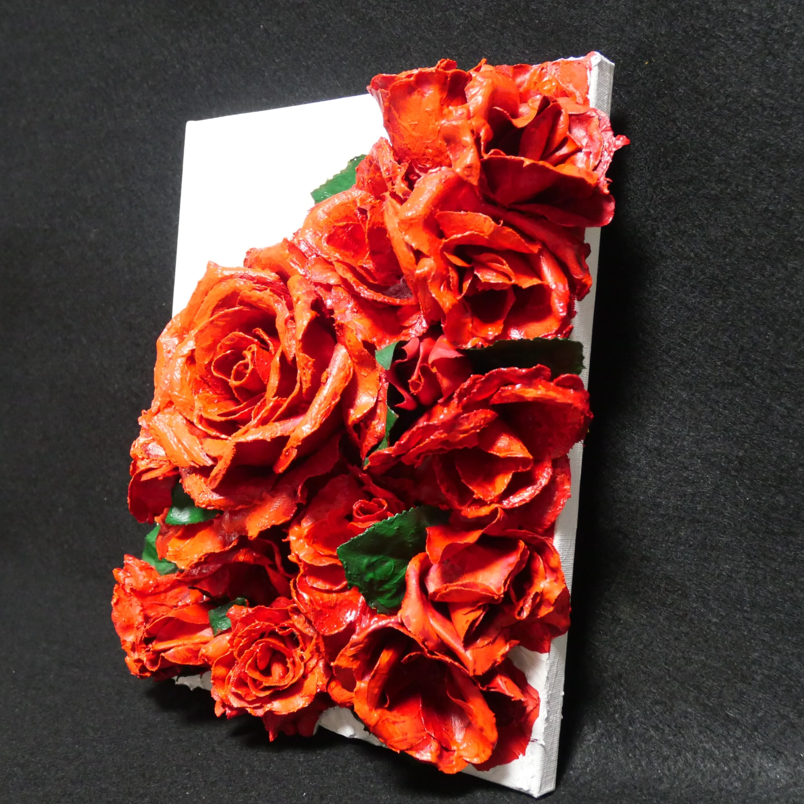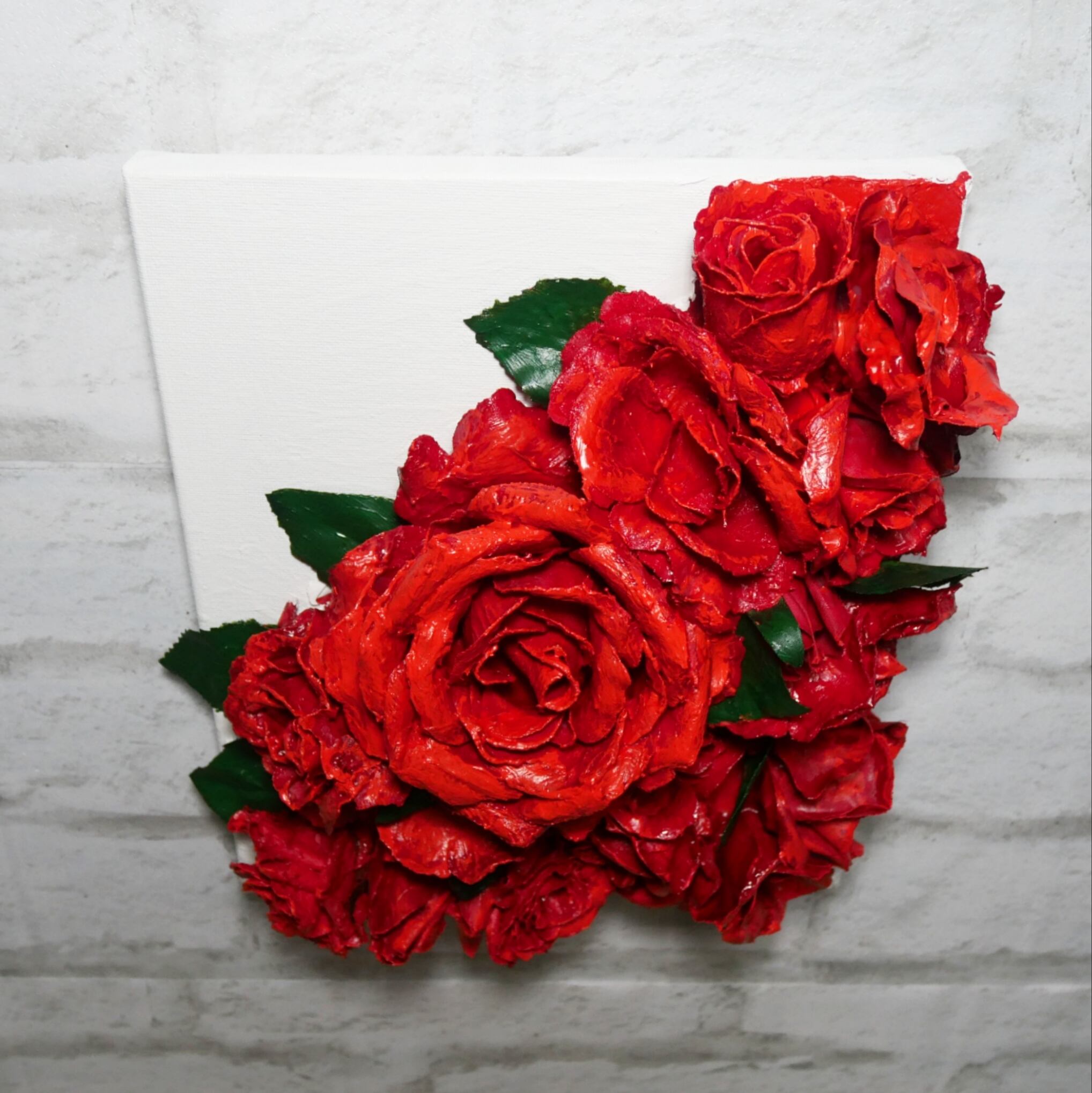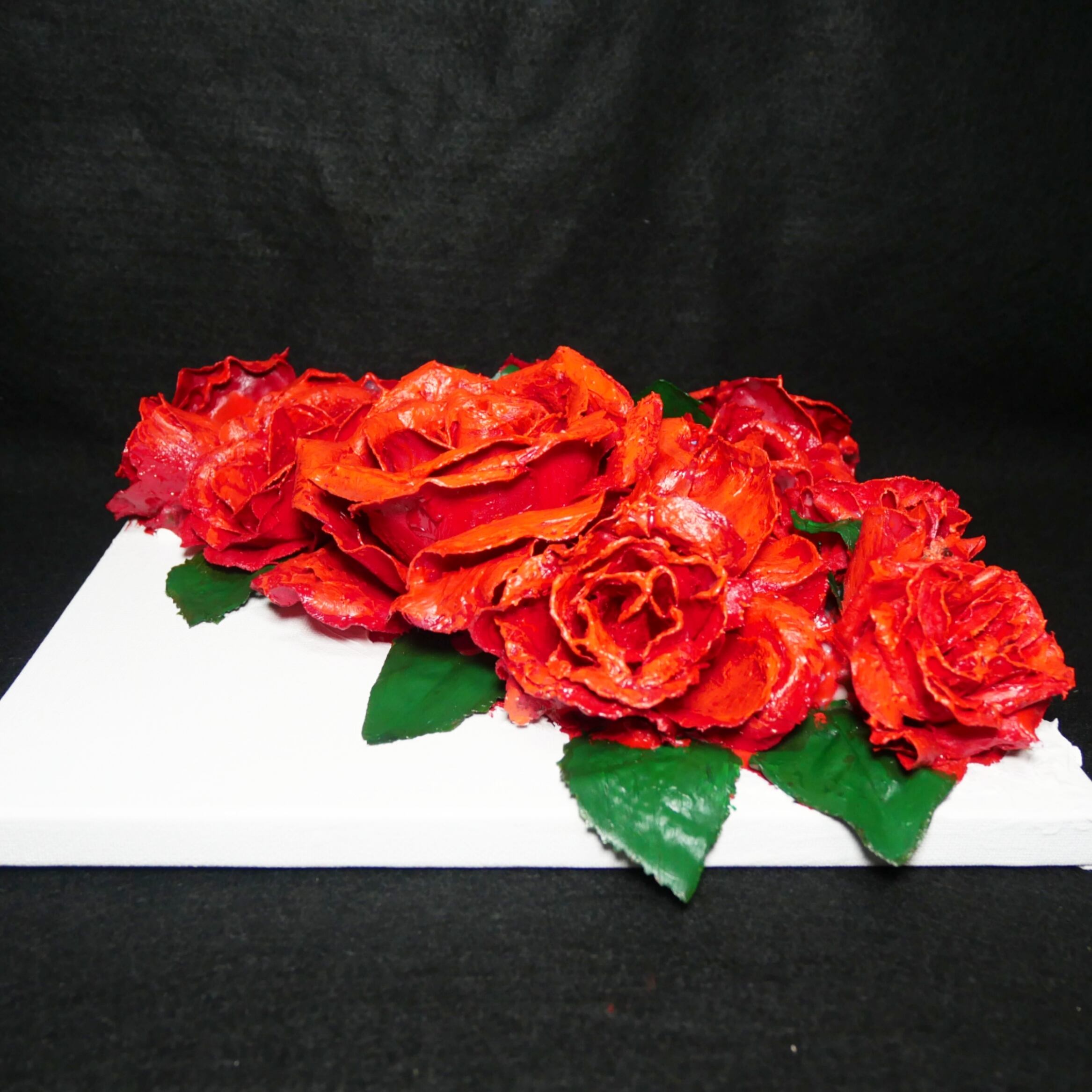 「枯れない薔薇」と題された油絵は、造花に油絵具を塗って作られています。そのため、10年後でも100年後でも色褪せず美しいまま保存することができる丈夫な作品です。永遠に枯れない薔薇をお客様の空間に飾って、美しい花々の姿を楽しんでください。
