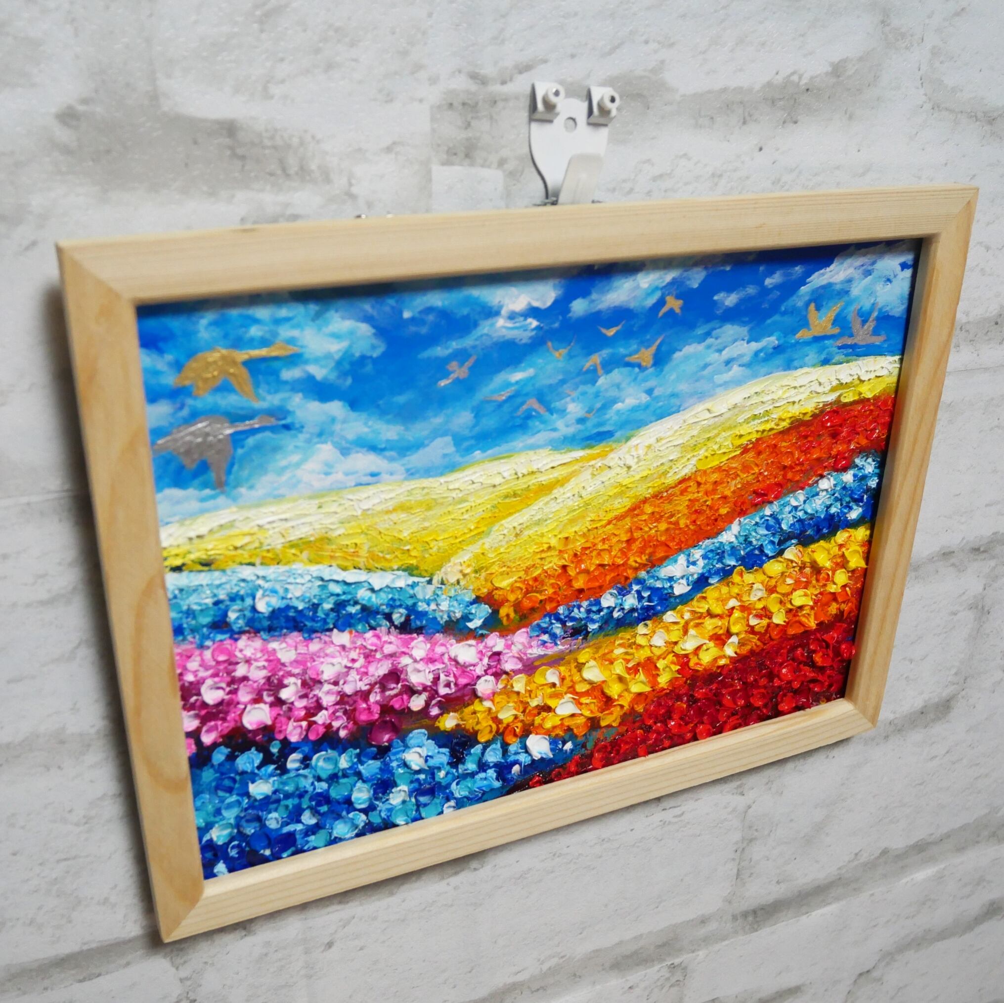 この鳥たちが舞う花畑の世界にどっぷりと浸り、幸せな気持ちで満たされてください。お客様の日常に幸せを運んでくれること間違いなしの一枚です。