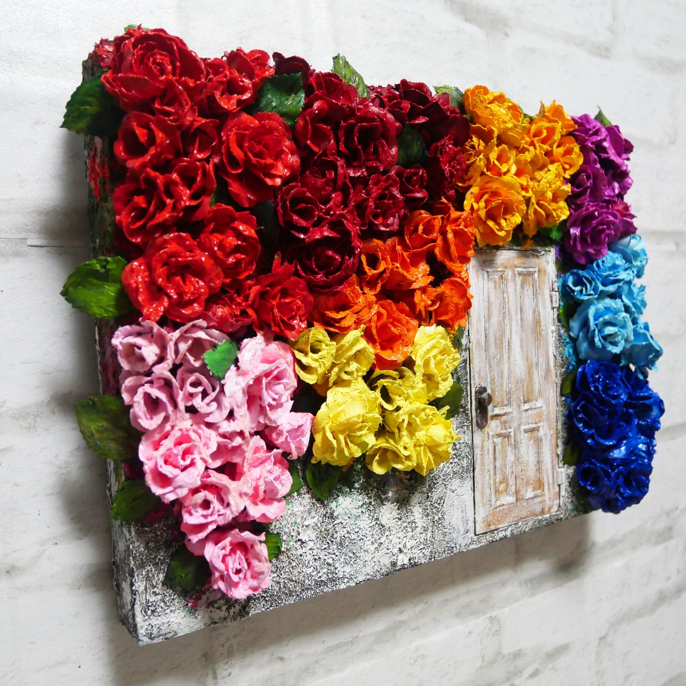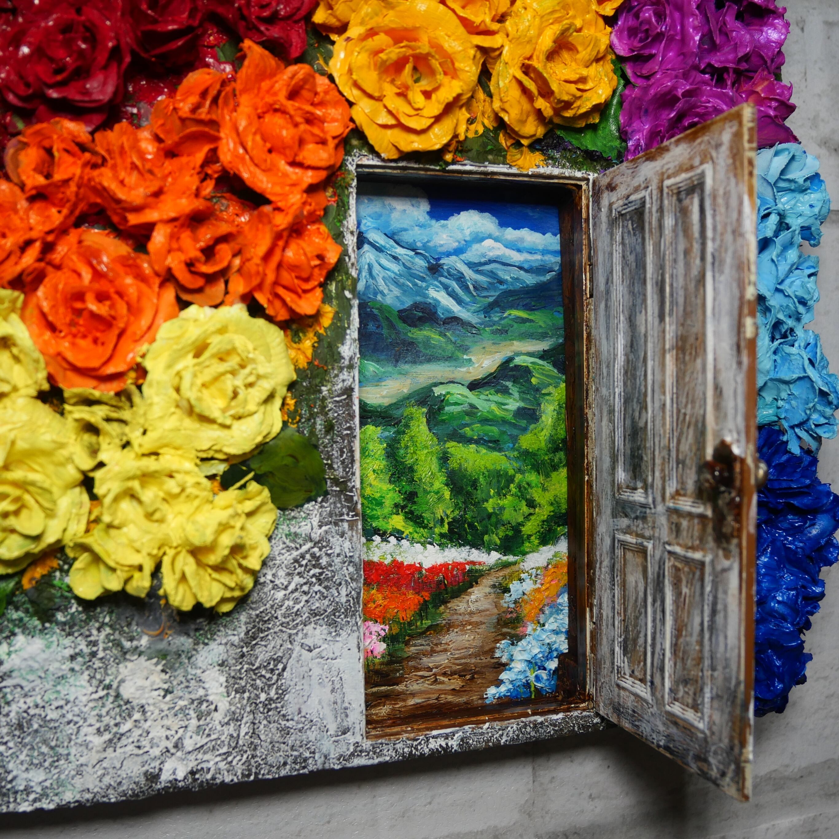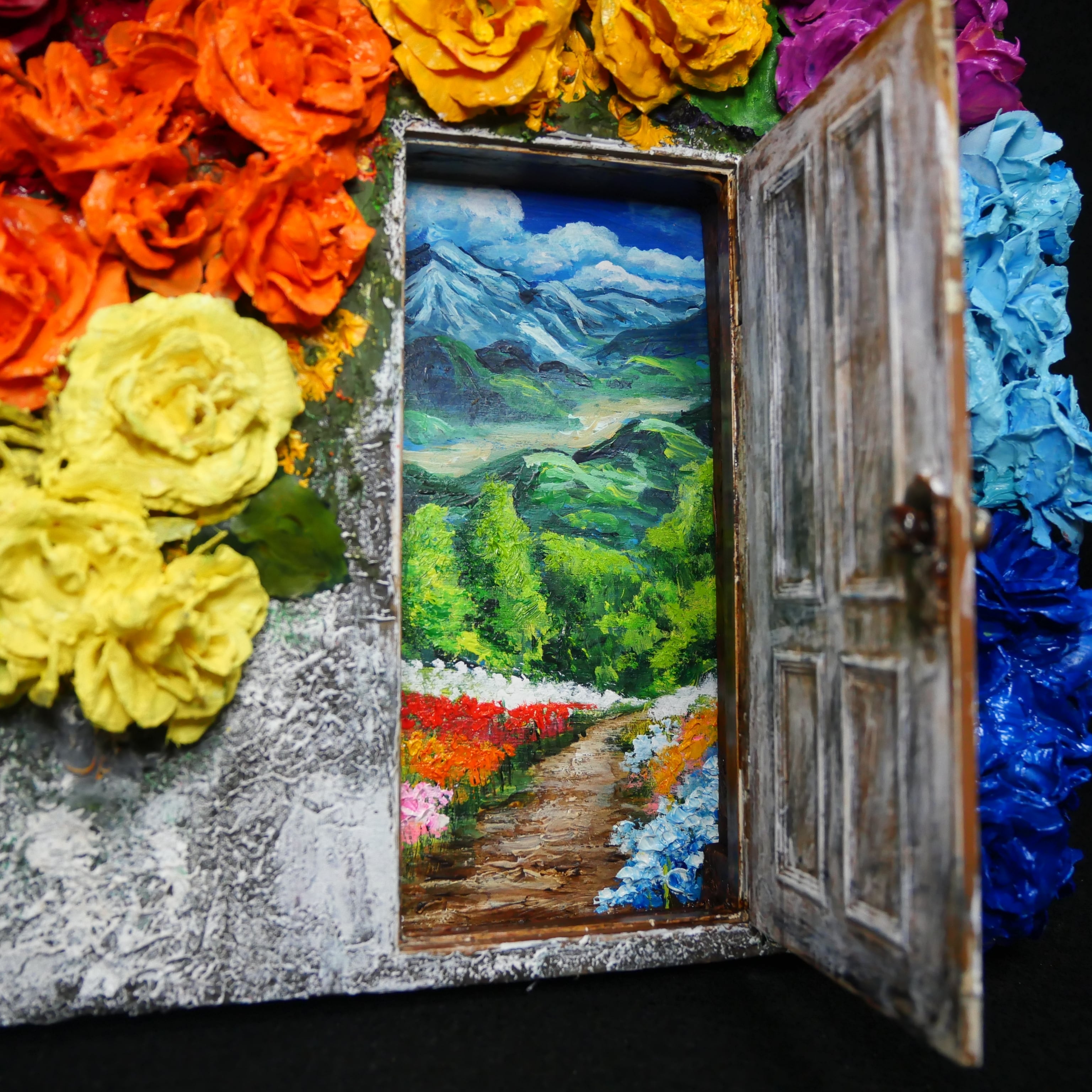 扉の先の世界を描いた油絵、【扉の先の世界】。造花の花を使用して描かれた美しい薔薇が特徴です。油絵具とミニチュアドアを巧みに使い、扉を開けることもできるリアルな風景が描かれています。この作品は、観賞だけでなく、自ら扉を開けてみる楽しみも提供してくれます。