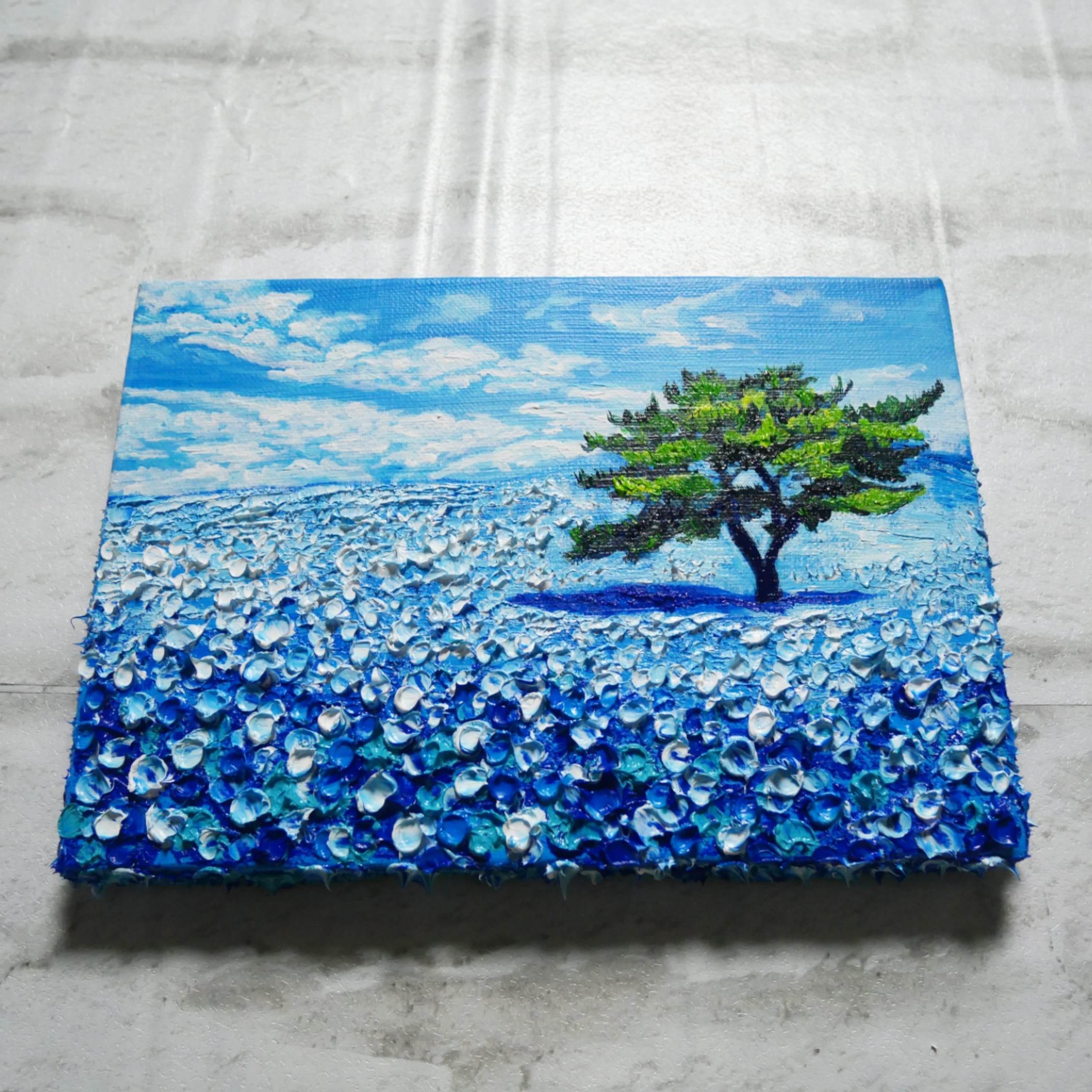 ネモフィラの丘を描いた油絵、油彩画の作品です。SM号のサイズで、壁掛け用の金具も付属しており、手軽にお好きな場所に飾ることができます。青と白の色合いが美しいネモフィラの丘を優しく表現した作品は、癒しと安らぎを感じさせてくれることでしょう。自然の美しさが詰まったこの作品は、お部屋に彩りを添えること間違いなしです。
