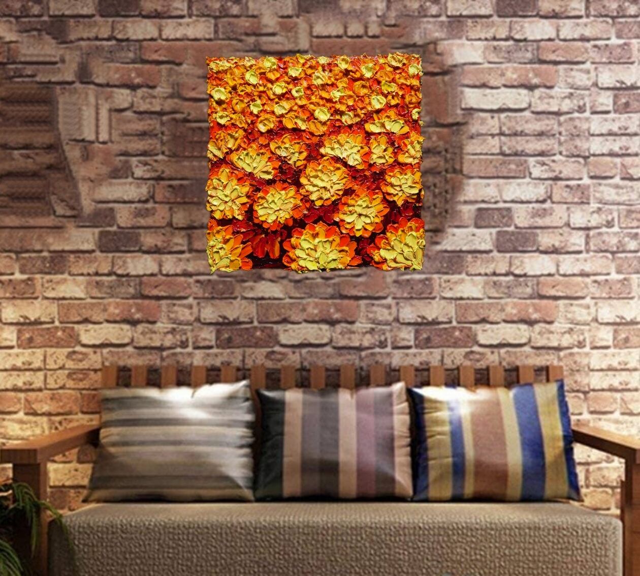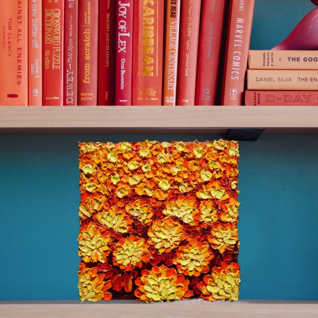 手描きの油絵アートパネル。鮮やかなマリーゴールドの花がリアルに描かれています。