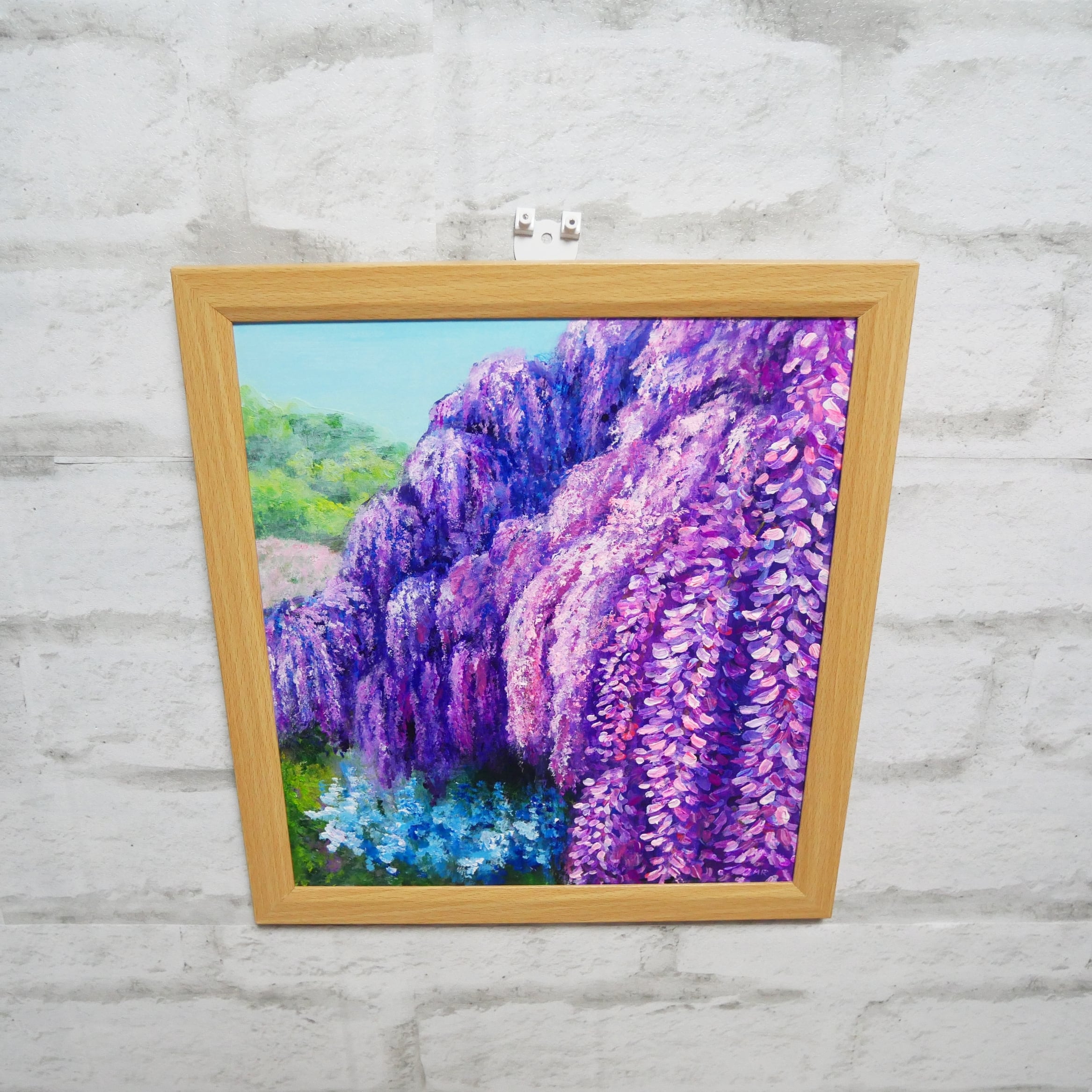 「流れ咲く藤の花」は、あしかがフラワーパークの藤をモチーフにした油彩画です。淡い色合いの花々が織り成す幻想的な風景は、まるで夢の中にいるかのような美しさを放っています。この作品は、お部屋のインテリアに華やかさと和の雰囲気をプラスしてくれること間違いなしです。