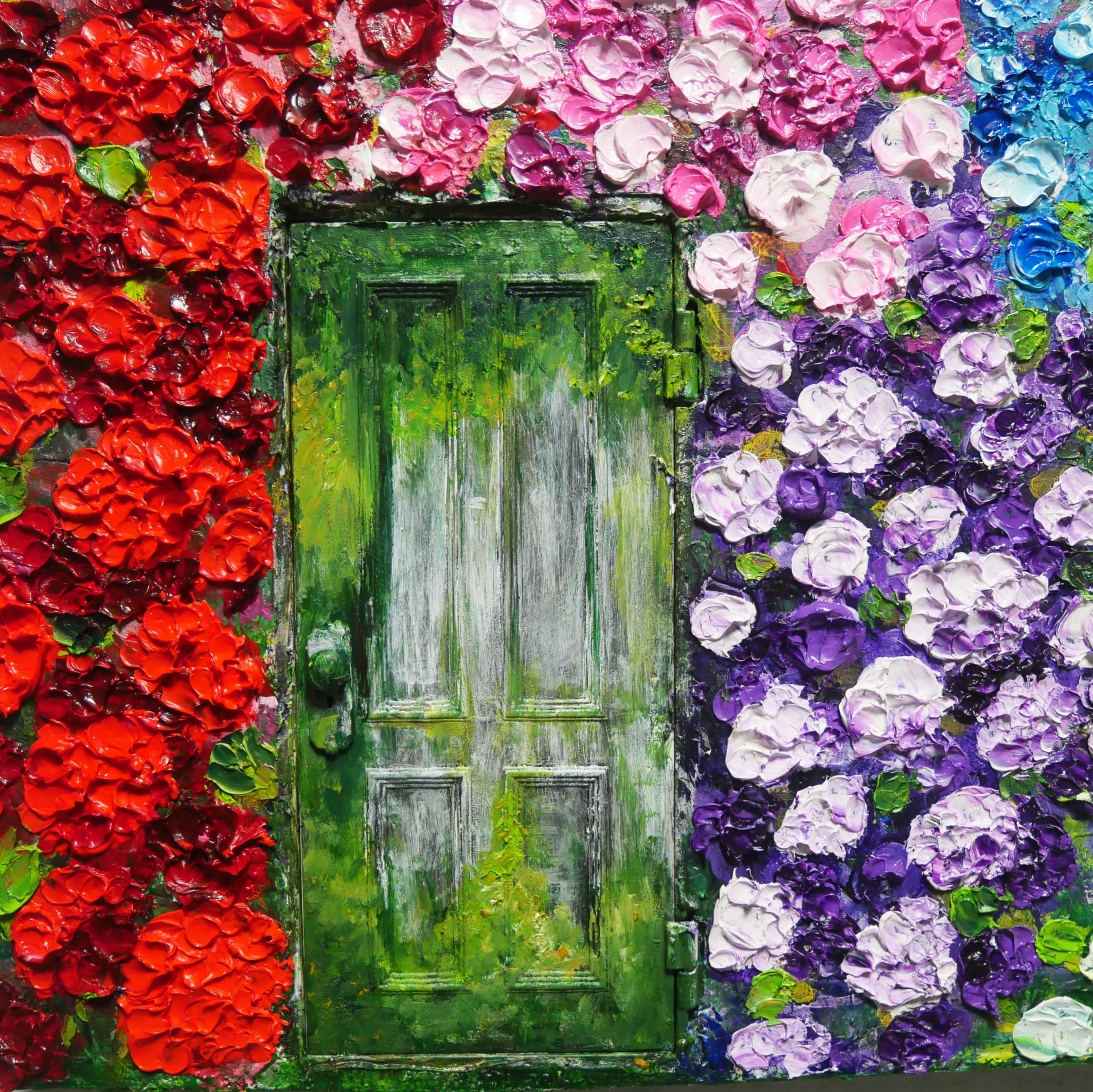 扉の先に広がる紫陽花の花畑を描いた油絵『扉の先の紫陽花の階段』。モチーフとなった紫陽花・あじさい寺・明月院・鎌倉が織り成す幻想的な景色は、まるで異世界への扉を開いたような神秘的な魅力があります。木製パネルF4とミニチュアドアを用いた立体感あふれる作品は、絵画好きな方々だけでなく、インテリアにも一層華やかさをプラスすること間違いなしです。