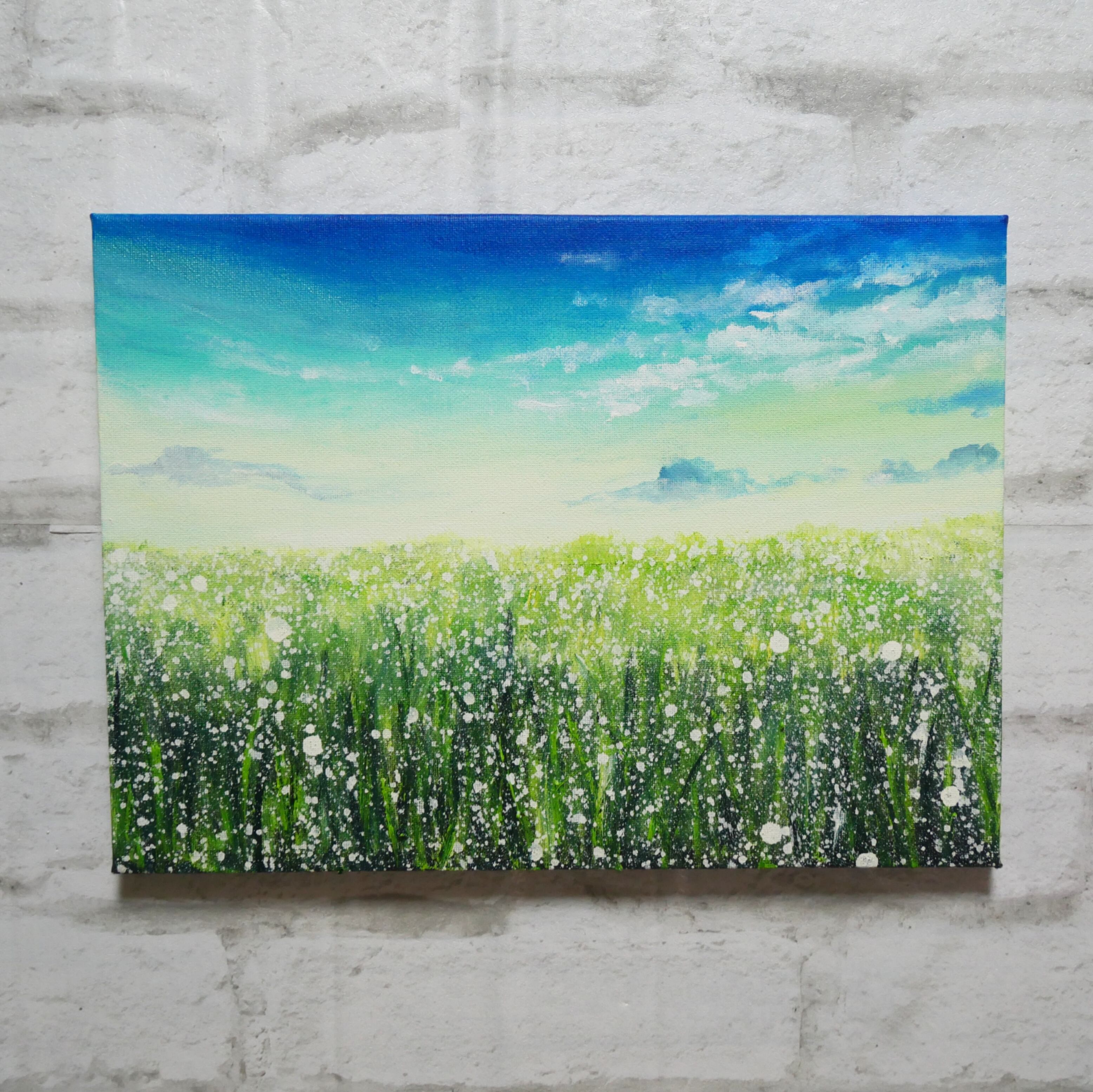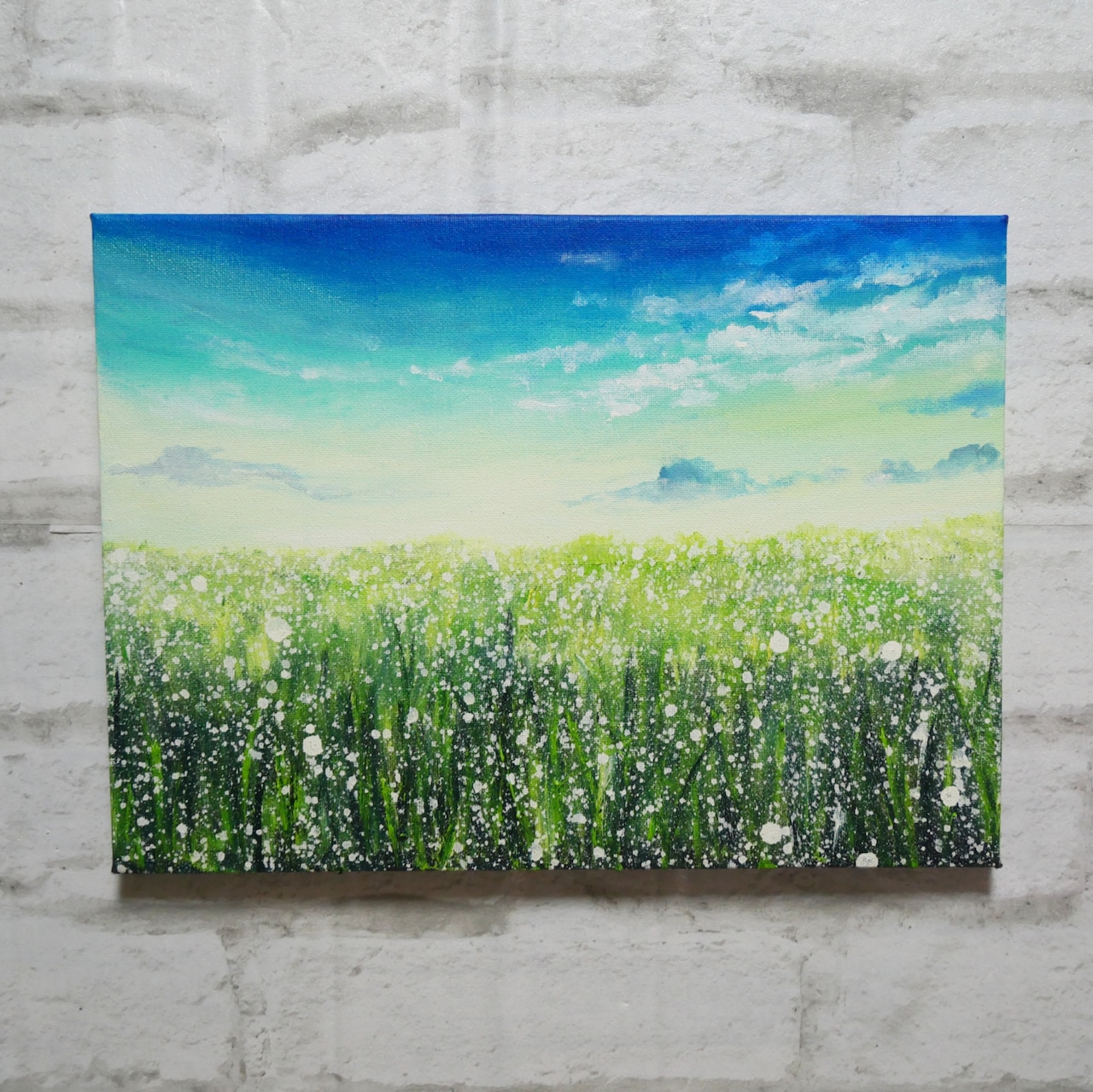 【草原に咲く白い花と朝日】は、美しい自然の風景を描いた素敵なアート作品です。草原に広がる白い花が朝日に照らされる光景は、心を和ませてくれる優しい空気感が漂っています。この作品は、リビングや寝室などのインテリアに飾ると、癒やしと温かさを提供してくれること間違いなしです。