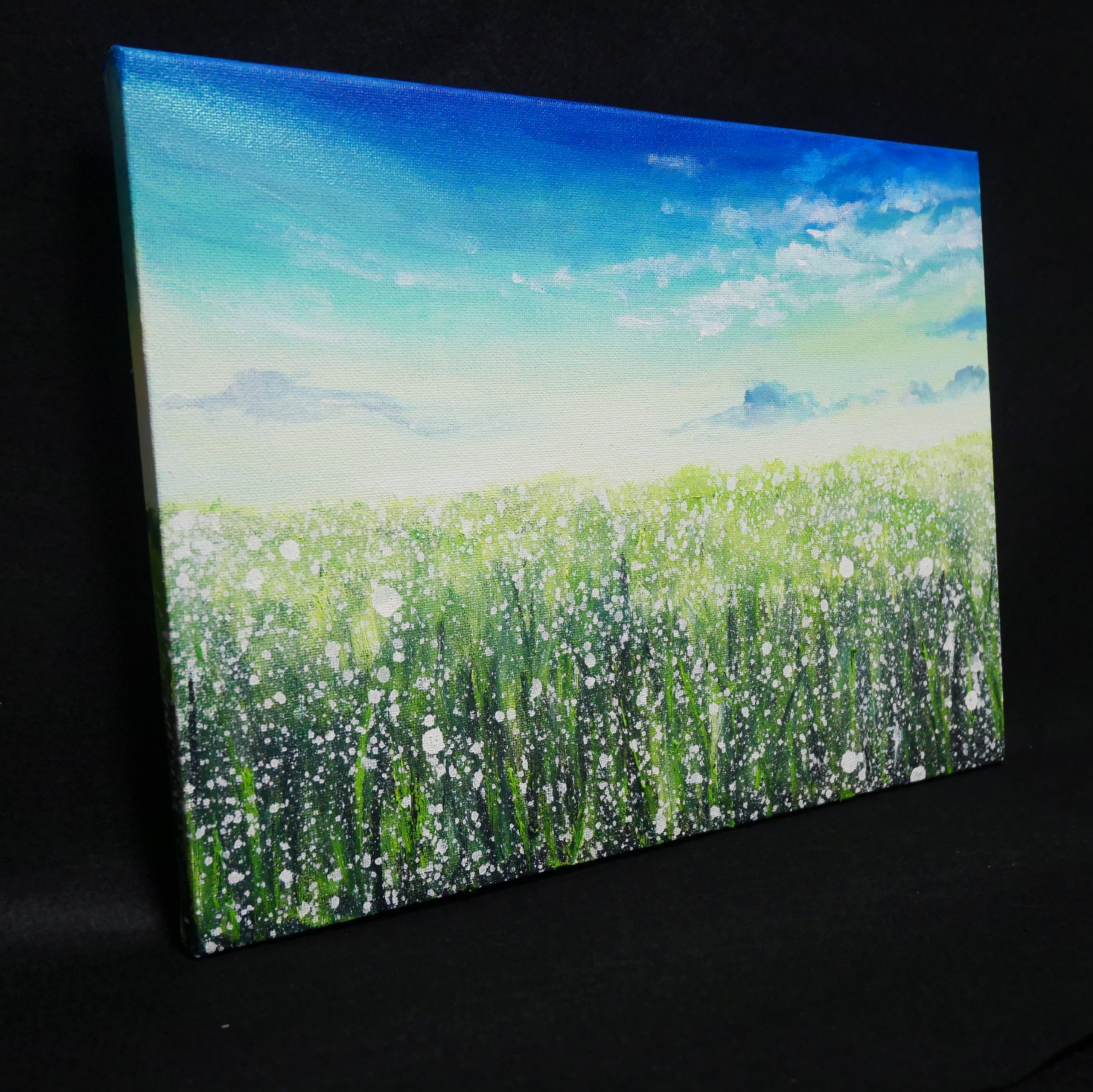幻想的な景色が描かれた油絵「草原に咲く白い花と朝日」。穏やかな朝日の光に照らされた草原に咲く白い花が描かれた美しい作品です。絵画の中にもう一度自然へと誘われ、心が豊かなひとときを過ごせることでしょう。