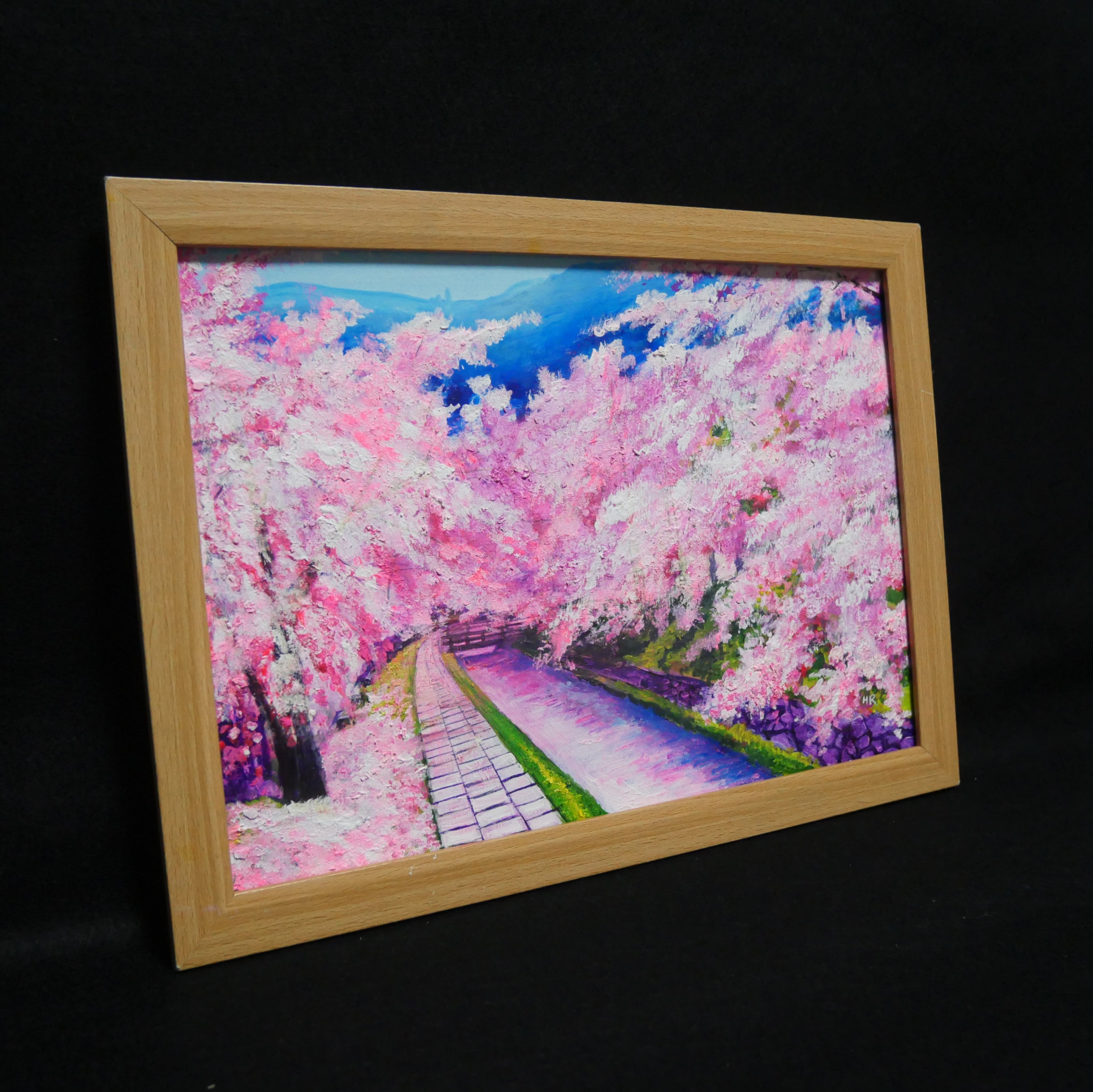 桜と京都の美しい風景を描いた作品です。油絵具やアクリル絵具を使用し、手作りのA4サイズ厚紙に描かれた作品は、細部までこだわりが感じられます。壁掛け用の金具も付属しており、お部屋のインテリアに華やかさと温かさをプラスしてくれます。