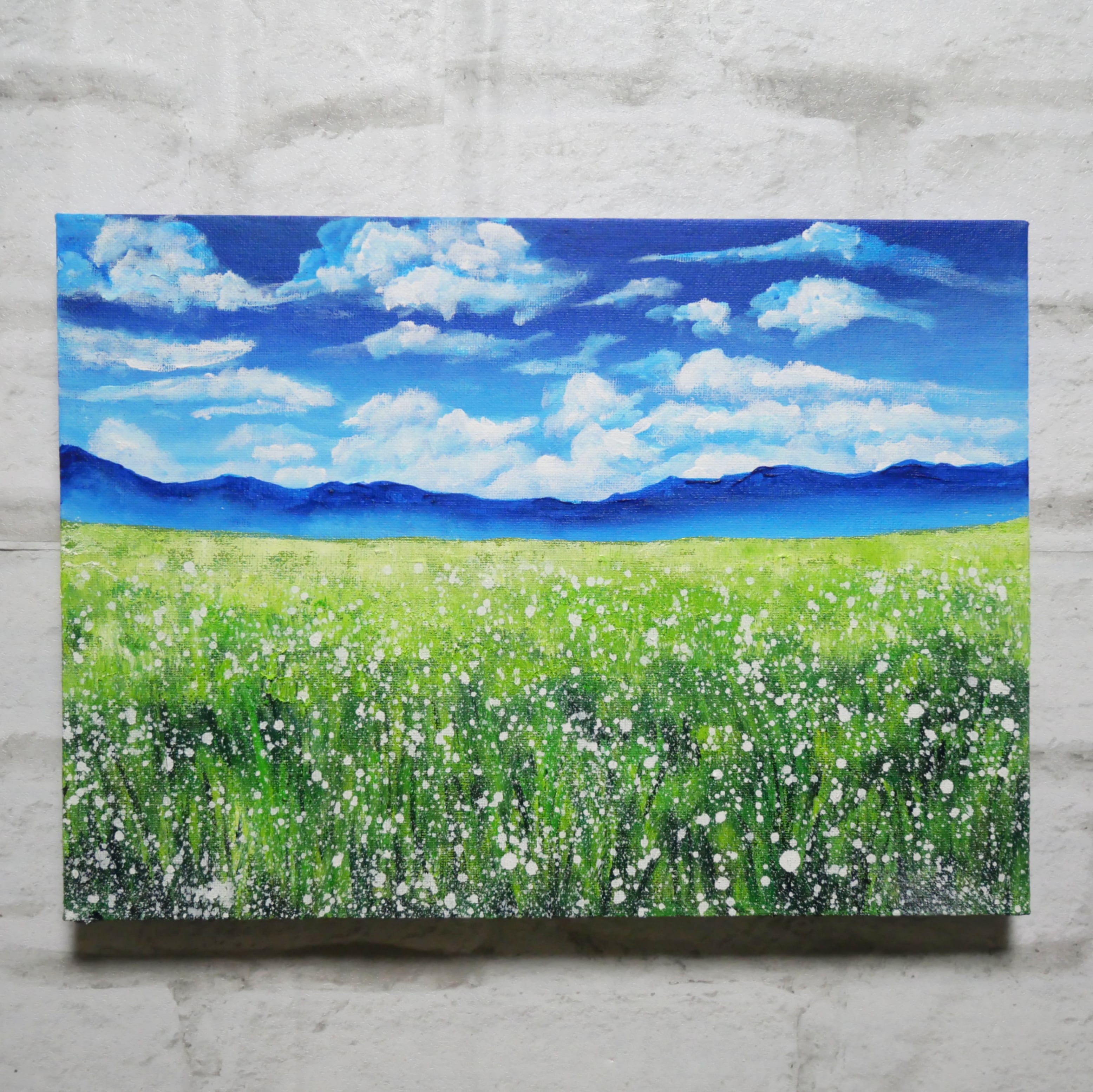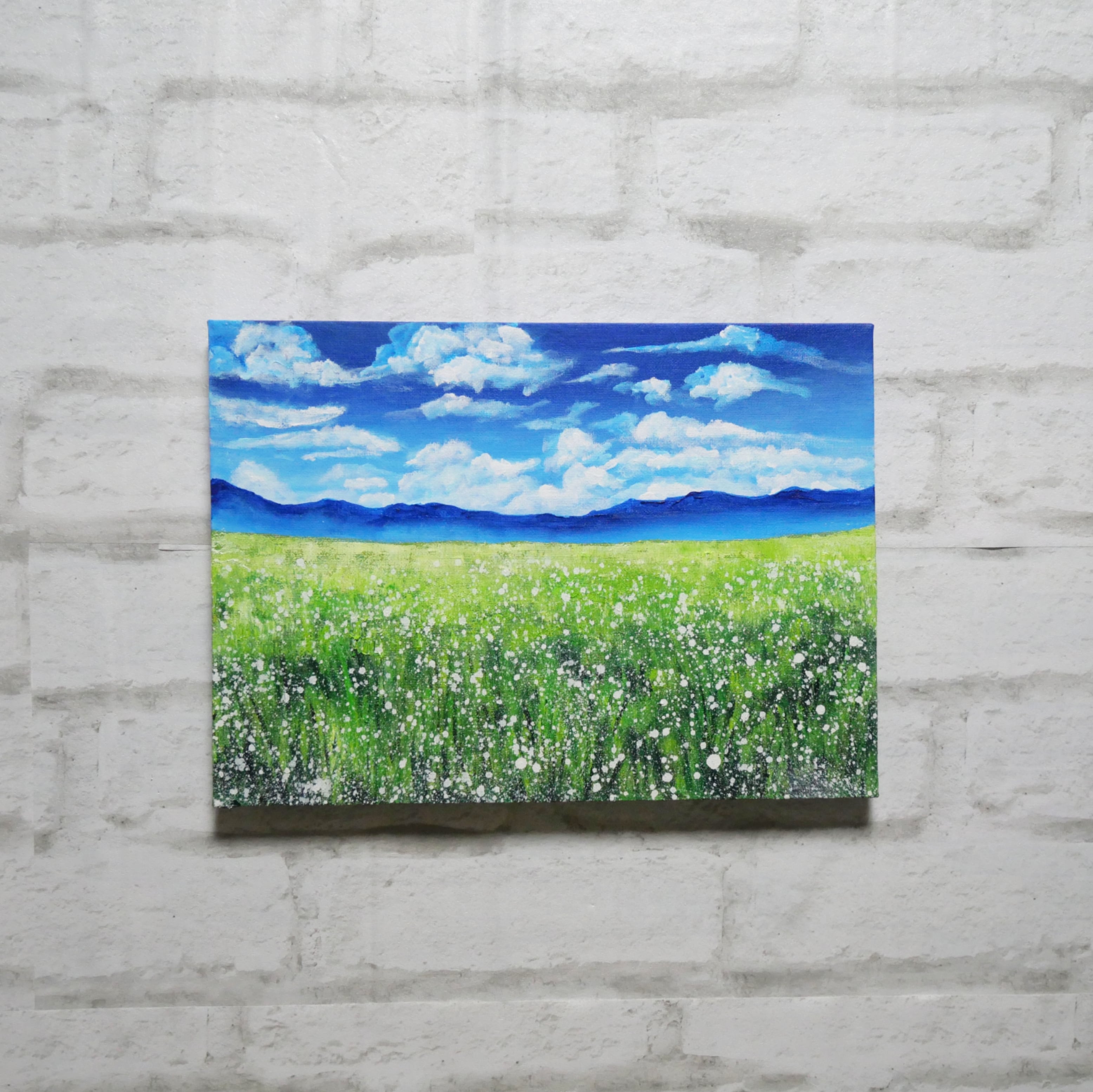 草原に広がる白い花々を描いた油彩画。空と雲が織り成す青空と、草原に広がる花々の美しさが、心を和ませます。この作品は、贈り物としても最適です。ラッピング付きでお届けいたしますので、大切な方へのプレゼントにもおすすめです。