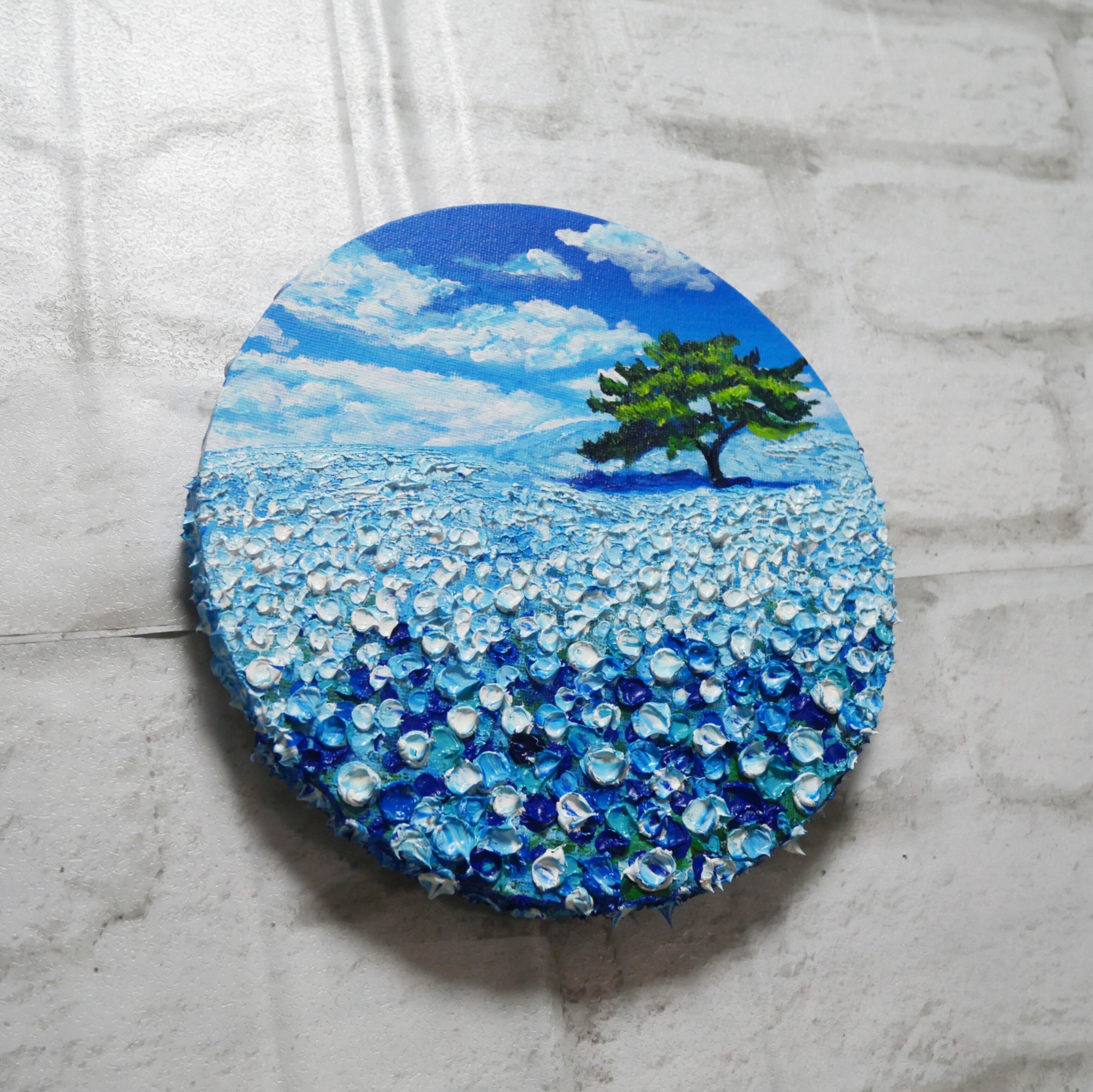 美しいネモフィラ畑をモチーフにした油絵、ネモフィラの丘。青い空と鮮やかなお花畑が描かれたこの作品は、心を癒してくれる風景です。国営ひたち海浜公園のみはらしの丘で一年に一度咲く美しいネモフィラを、いつでもお部屋に飾って楽しめます。 丸型の張りキャンバスに20cmのサイズで描かれたこの油絵は、癒しを求める方や美しい風景を愛でる方にぴったり。茨城県の自然を感じるネモフィラの丘を、日常の中に取り入れてみませんか。気分が明るくなる、心休まる一枚です。 絵画は直射日光を避け、湿気の少ない場所で保管ください。また、絵画の特性上、実物と写真との間に色味の違いが生じる