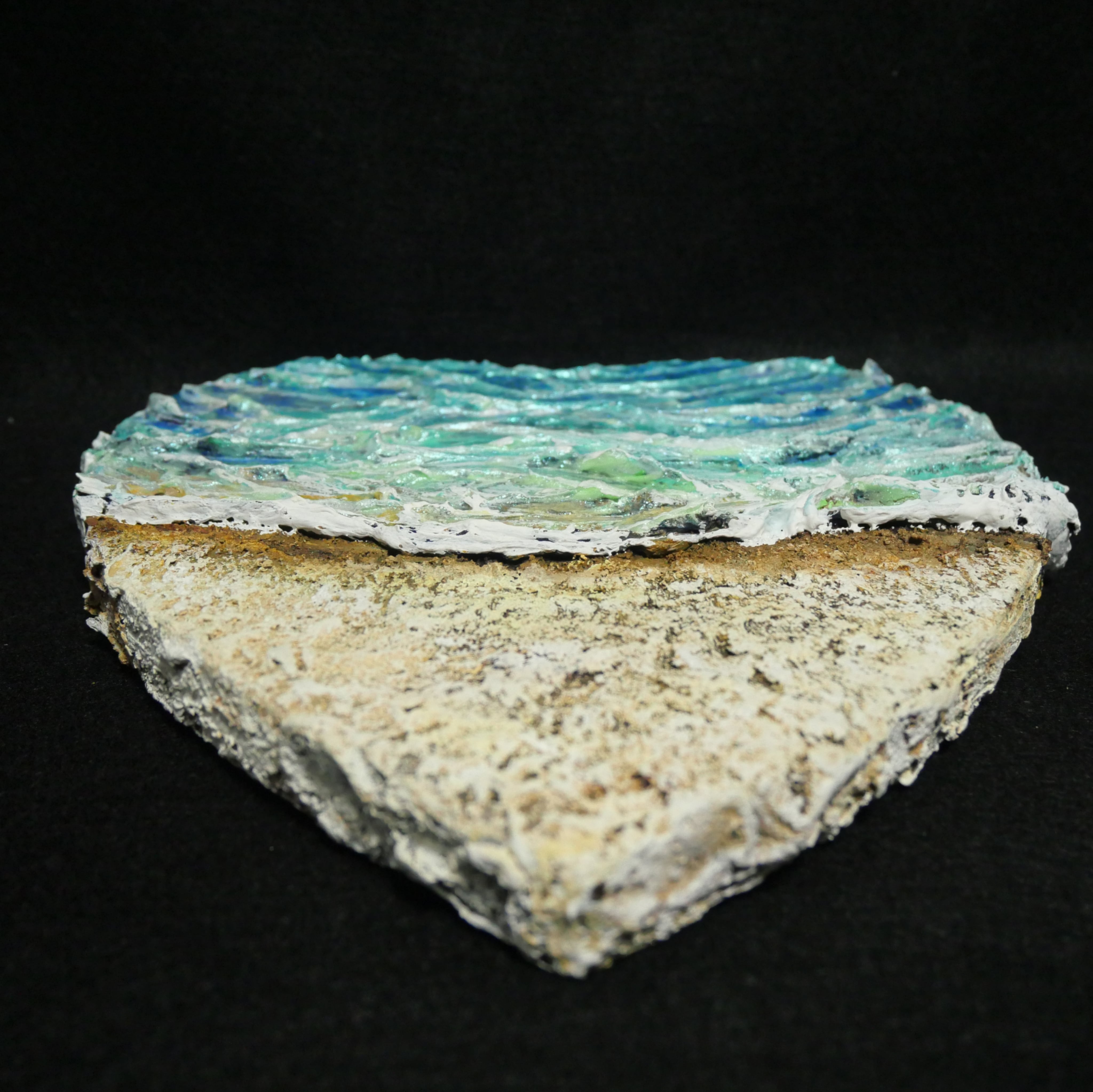 ハート型のキャンバスに描かれた、夏の海辺をイメージさせる油絵『ハートの海』。青い海と砂浜、波の音が聞こえてきそうな風景が描かれたこの作品は、見る者の心を癒すこと間違いなしです。