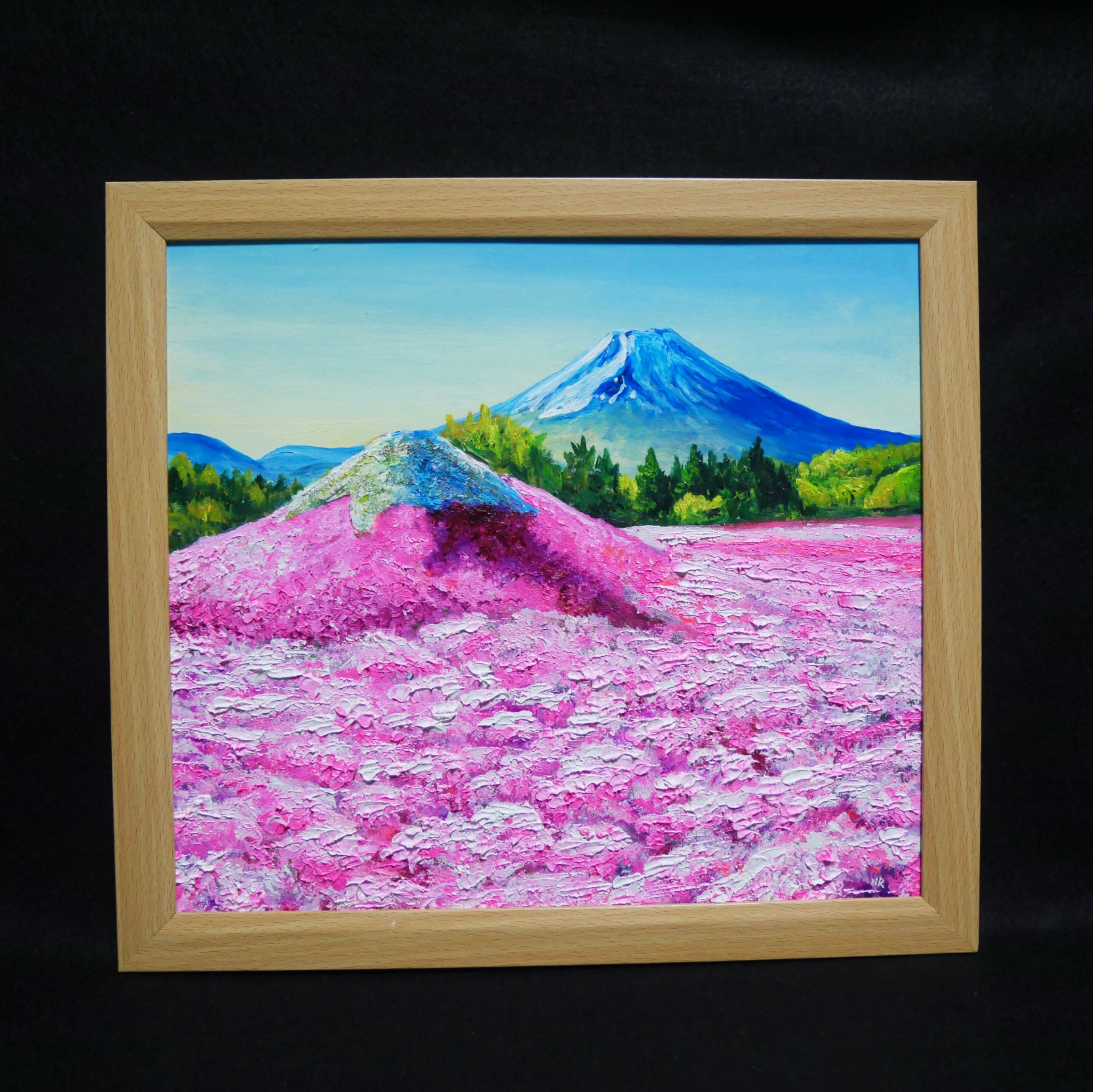 油絵【富士山とミニ芝桜富士山】は、富士芝桜まつりで咲く美しい芝桜とミニ富士山が描かれた絵画です。優雅な色合いと繊細なタッチで表現されたこの作品は、山梨の美しい風景を感じさせてくれます。富士山と芝桜の組み合わせは、日本の美しい風景を象徴するモチーフとして親しまれており、贈り物やインテリアとしても最適です。