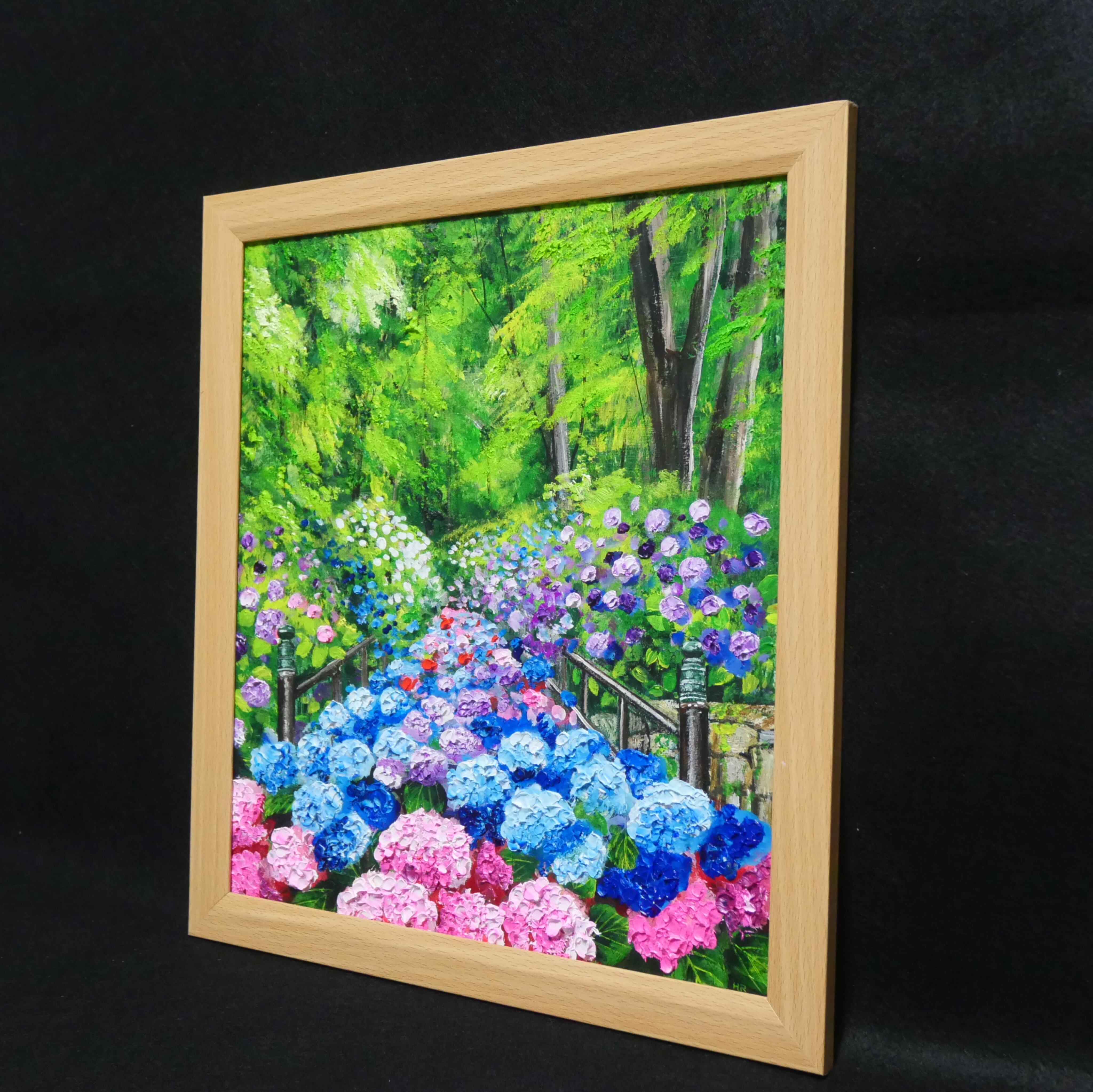 この油絵のサイズは横242mm × 縦272mmで、エレガントな額縁(サイズ:横27.4cm × 縦30.4cm × 厚さ0.9cm)に収められています。壁掛け用の金具も付属しているため、お好きな場所に手軽に飾ることができます。「紫陽花の階段」は、大切な人への贈り物や特別な瞬間を彩るアートとして、自信を持ってお勧めいたします。