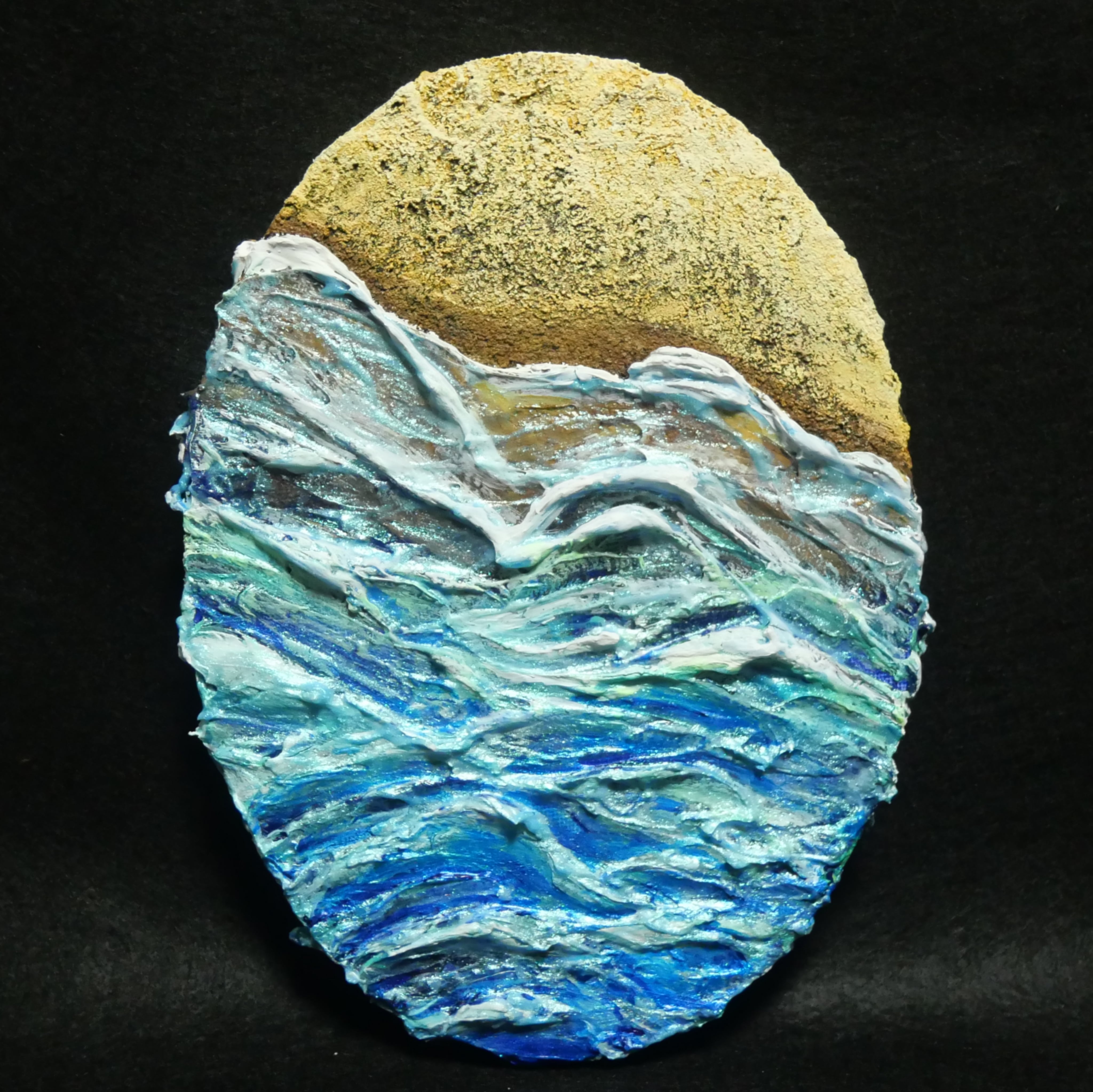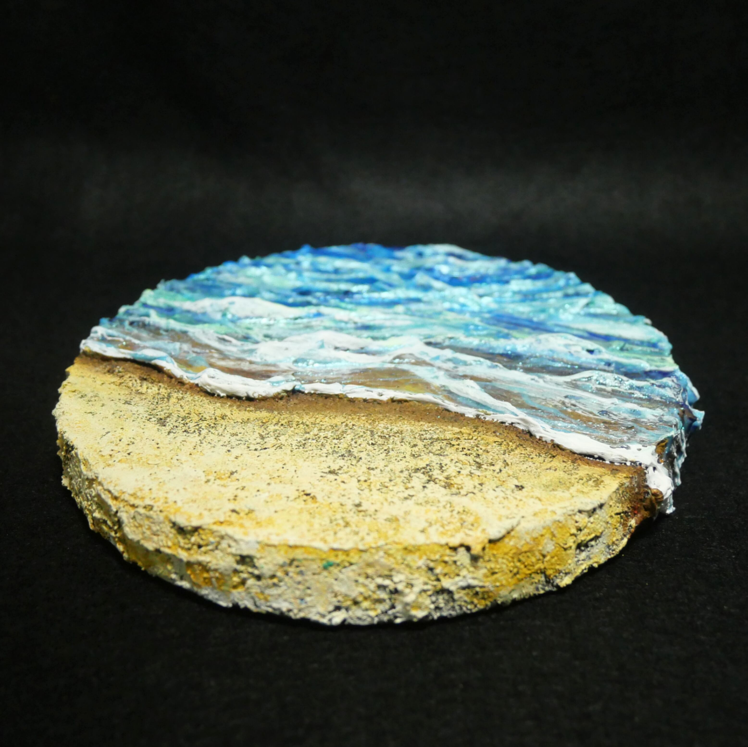砂浜の波が揺れる情景を、独特のタッチで表現しています。作品のサイズは16cm×22cmで、豊かな色彩と繊細なタッチで仕上げられています。壁掛け用の金具も付属しており、お部屋のアクセントとしてお楽しみいただけます。