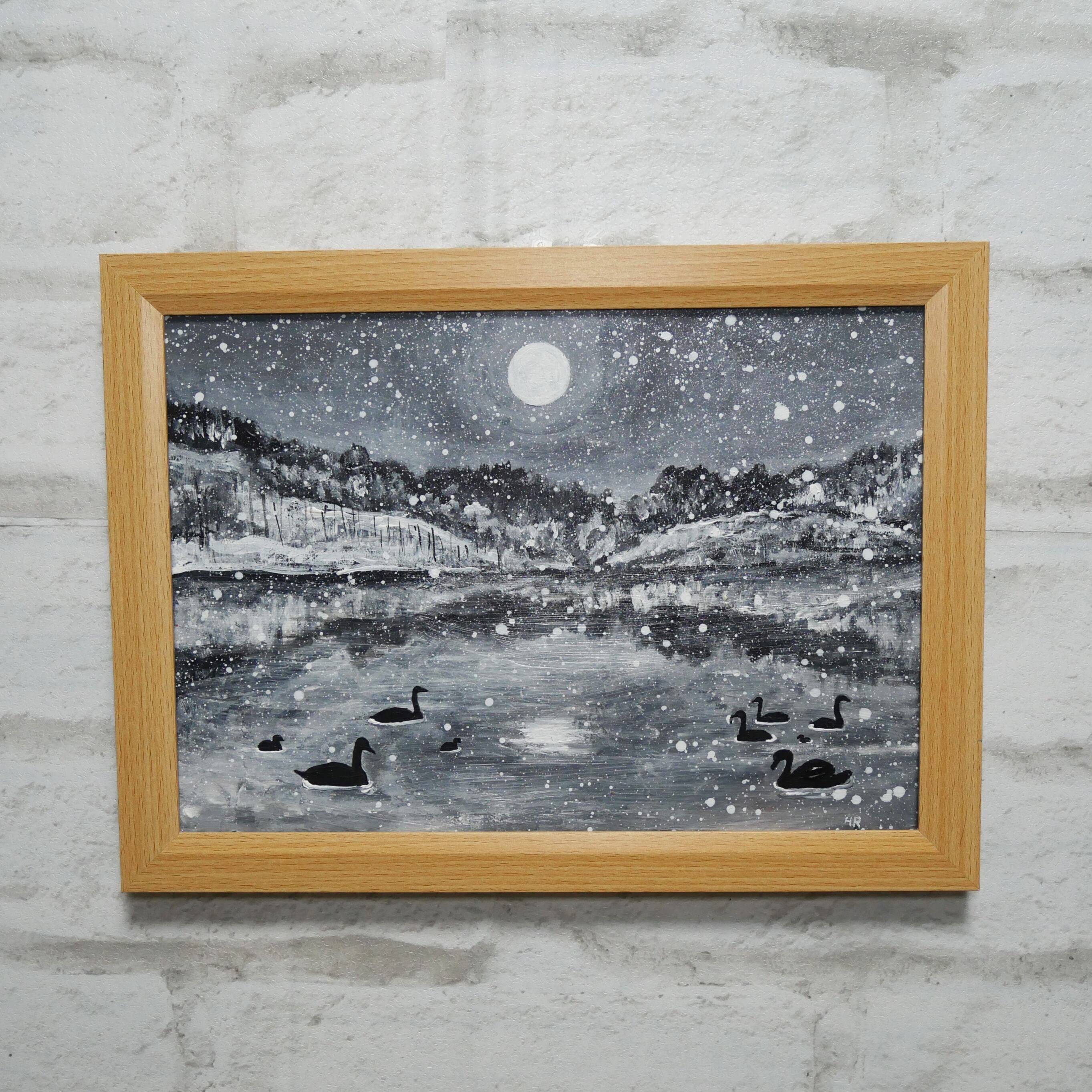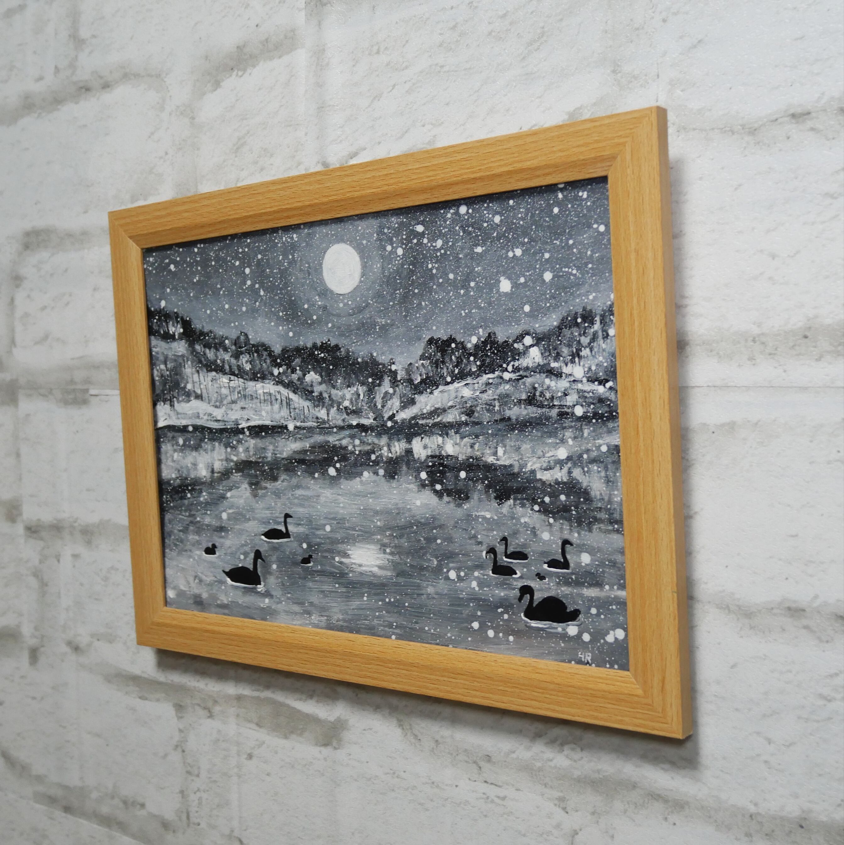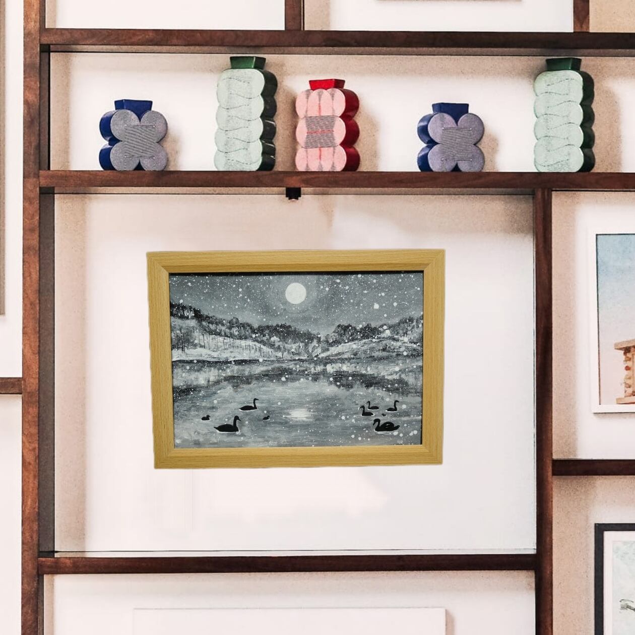 冬の静寂の中に佇むハクチョウ池の美しい風景を、白黒のコントラストで表現した油彩作品「白黒風景のハクチョウ池」。このアートは、見る人に心の安らぎと深い感動を与え、特別な雰囲気を醸し出します。雪景色の中で優雅に泳ぐハクチョウたちが、落ち着いた色合いのインテリアにしっかりと溶け込むことでしょう。