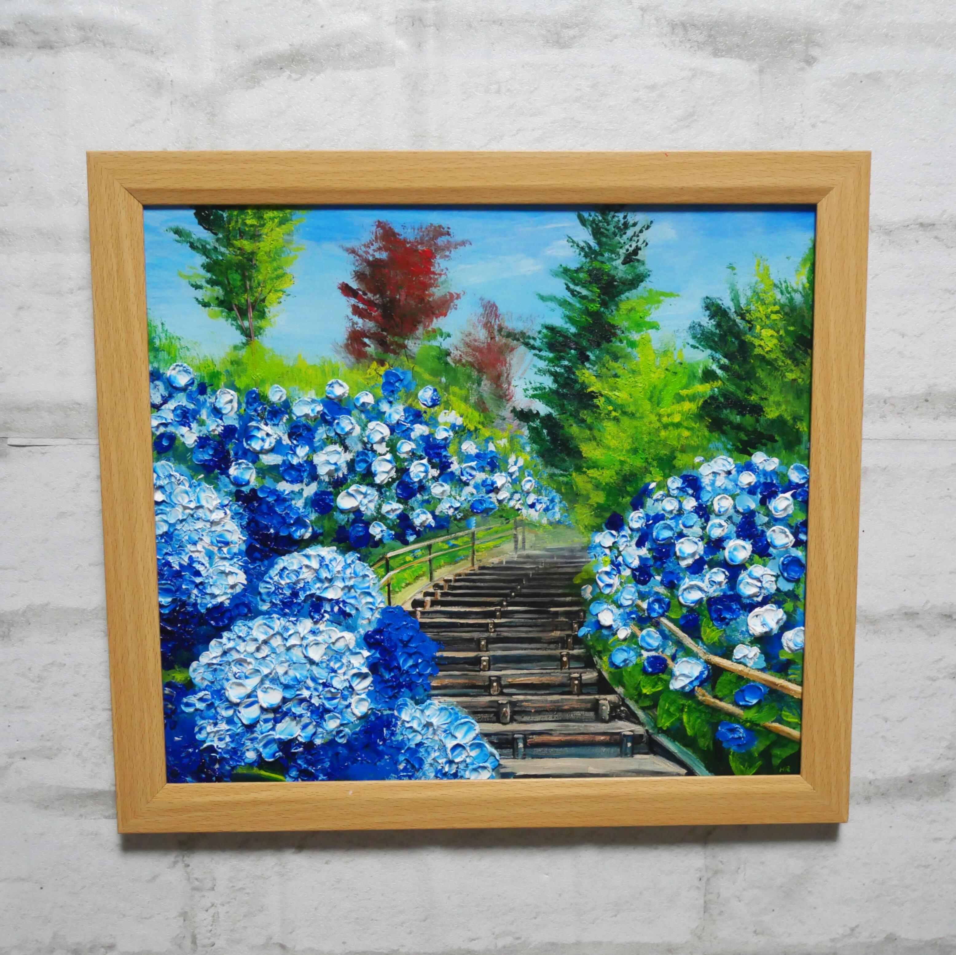 荘厳な紫陽花ロードを描いたこの油彩画は、階段を上がる先に広がる花々の美しさが、まるで別世界への入り口を開くかのようです。青い空と緑の木々とのコントラストが、ロマンチックな雰囲気を演出しています。梅雨の季節に満開の紫陽花を楽しむような気持ちにさせてくれる、一生ものの絵画です。