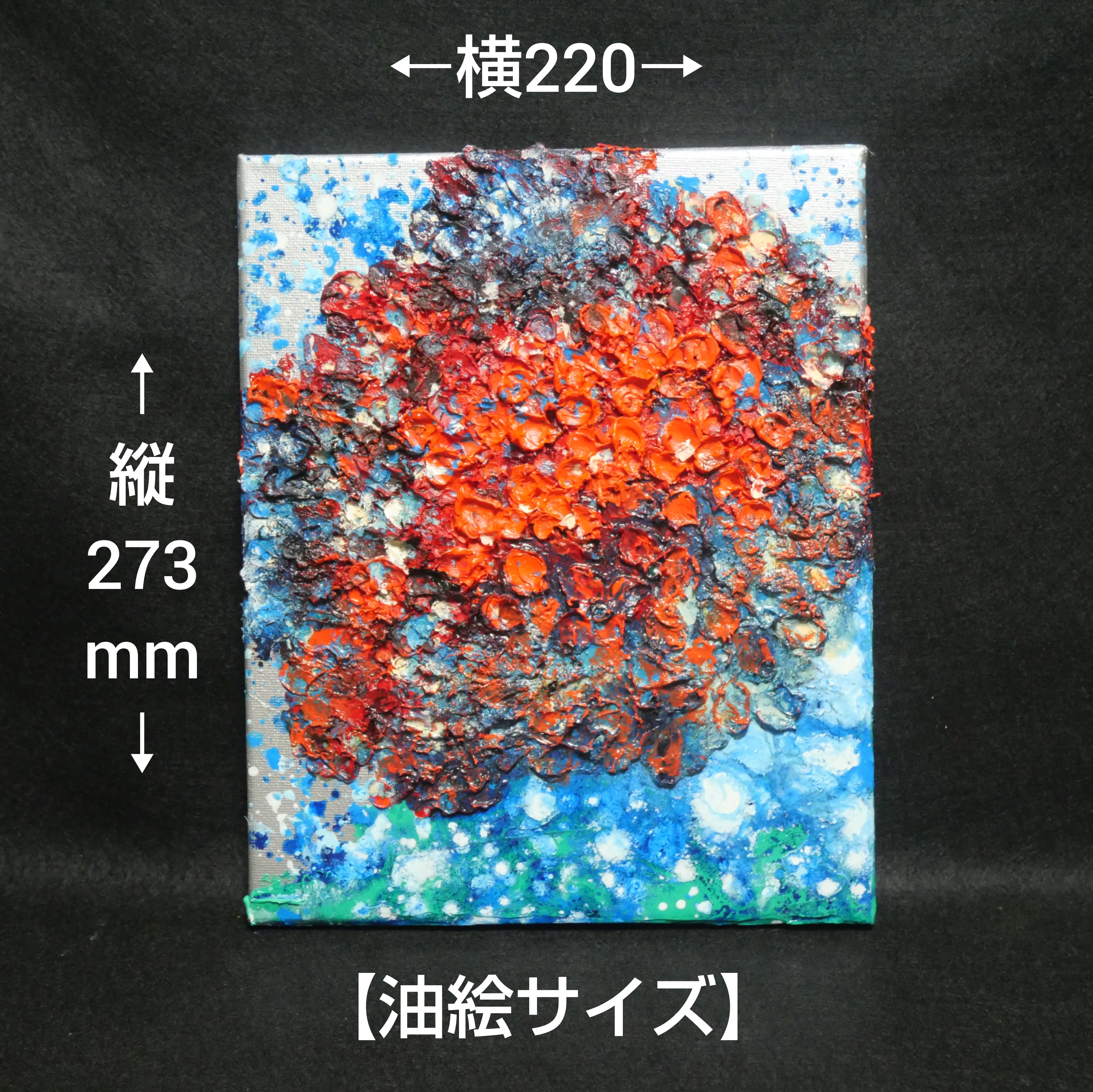 この油絵のサイズは273mm × 220mmで、壁掛け用の金具が付属していますので、お好きな場所に手軽に飾ることができます。「梅雨に咲く赤い紫陽花」は、特にリビングや寝室などのスペースで楽しんでいただきたい素敵なアートです。