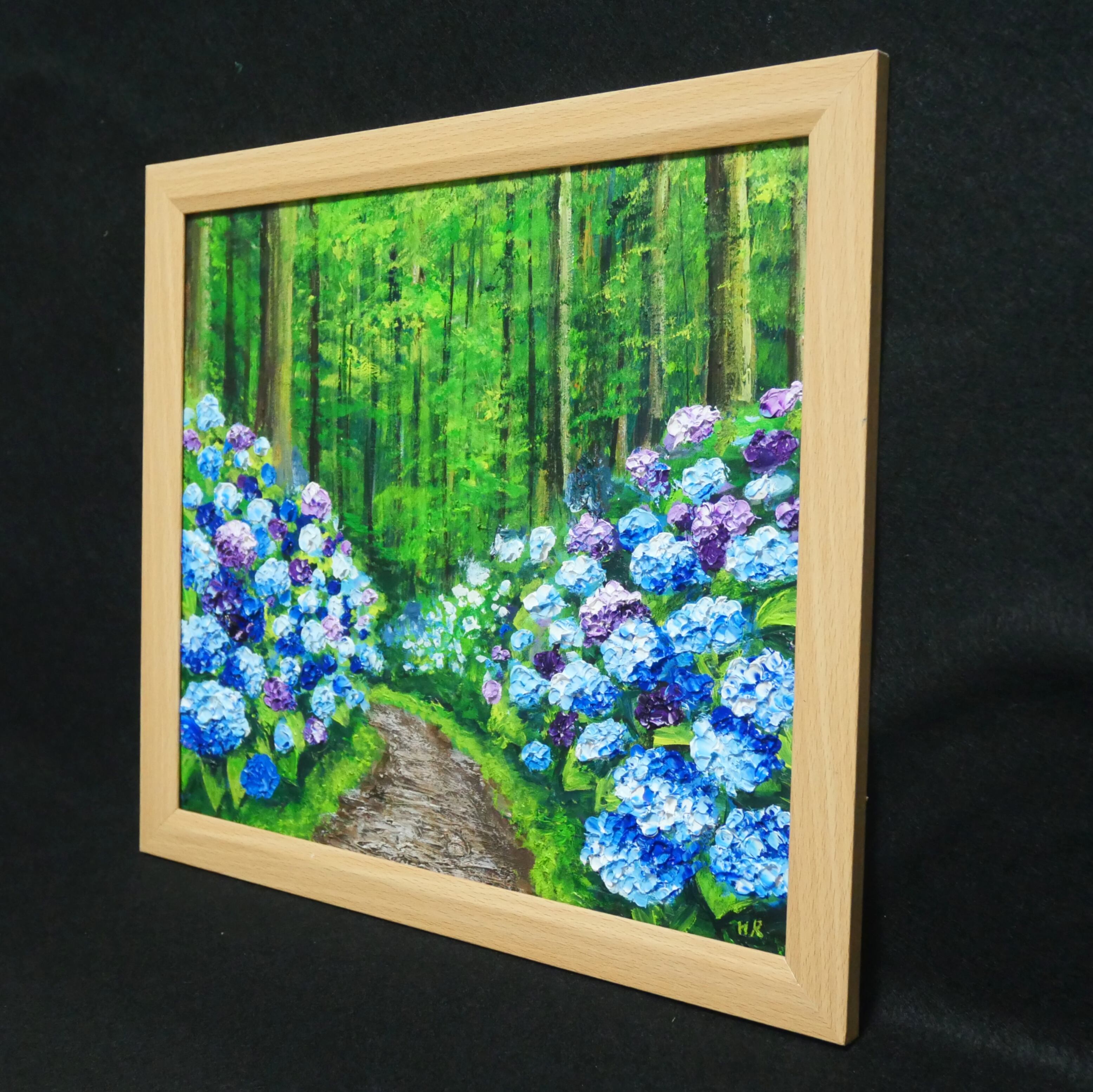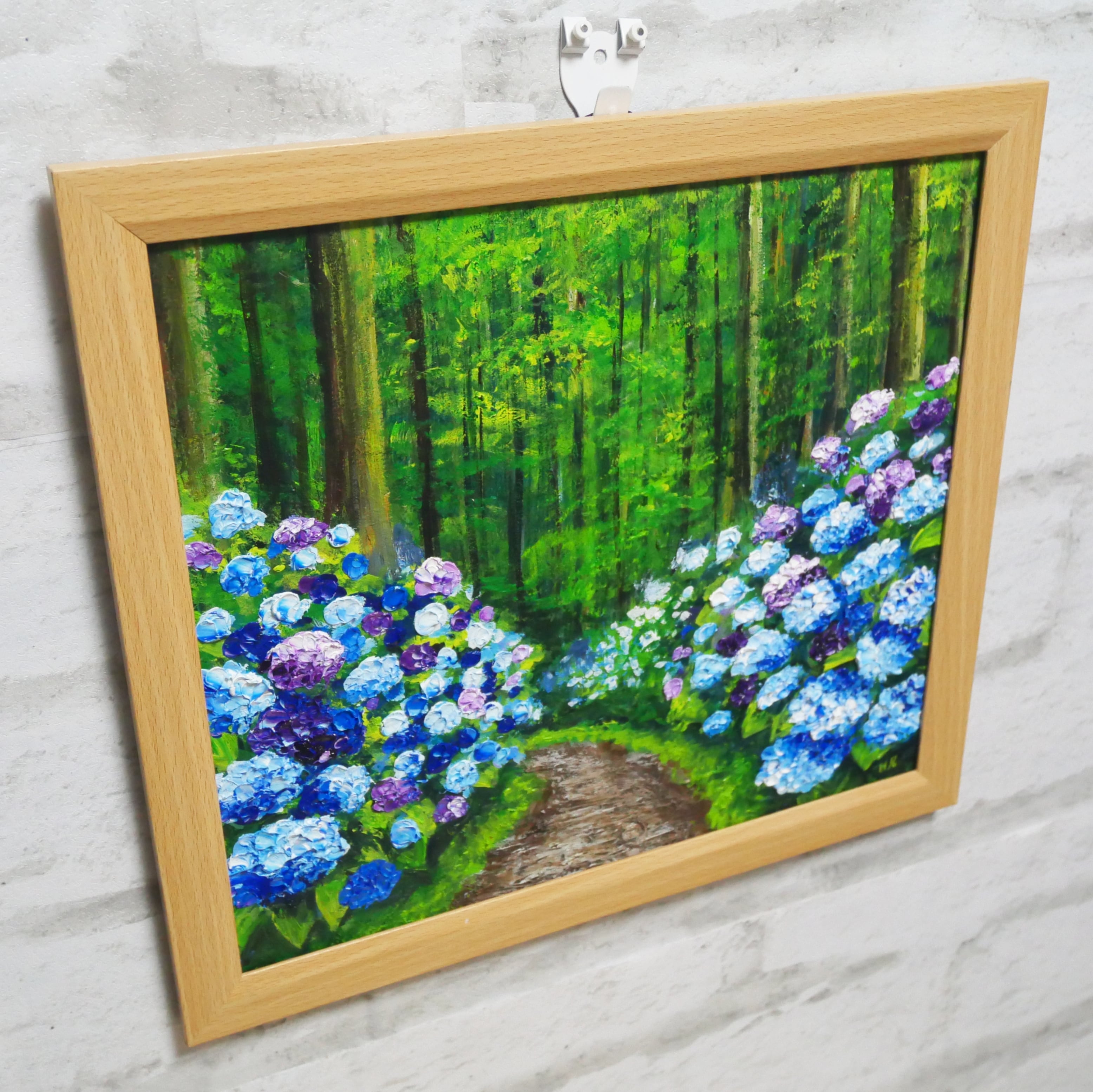 豊かな自然の中に広がる「梅雨の紫陽花の道」を描いた油絵。岩手県のみちのくあじさい園からインスピレーションを受け、紫陽花や緑が美しく描かれています。梅雨の季節にぴったりの幻想的な雰囲気をお楽しみください。絵画を通じて、自然の恵みと美しさを感じさせる一枚です。