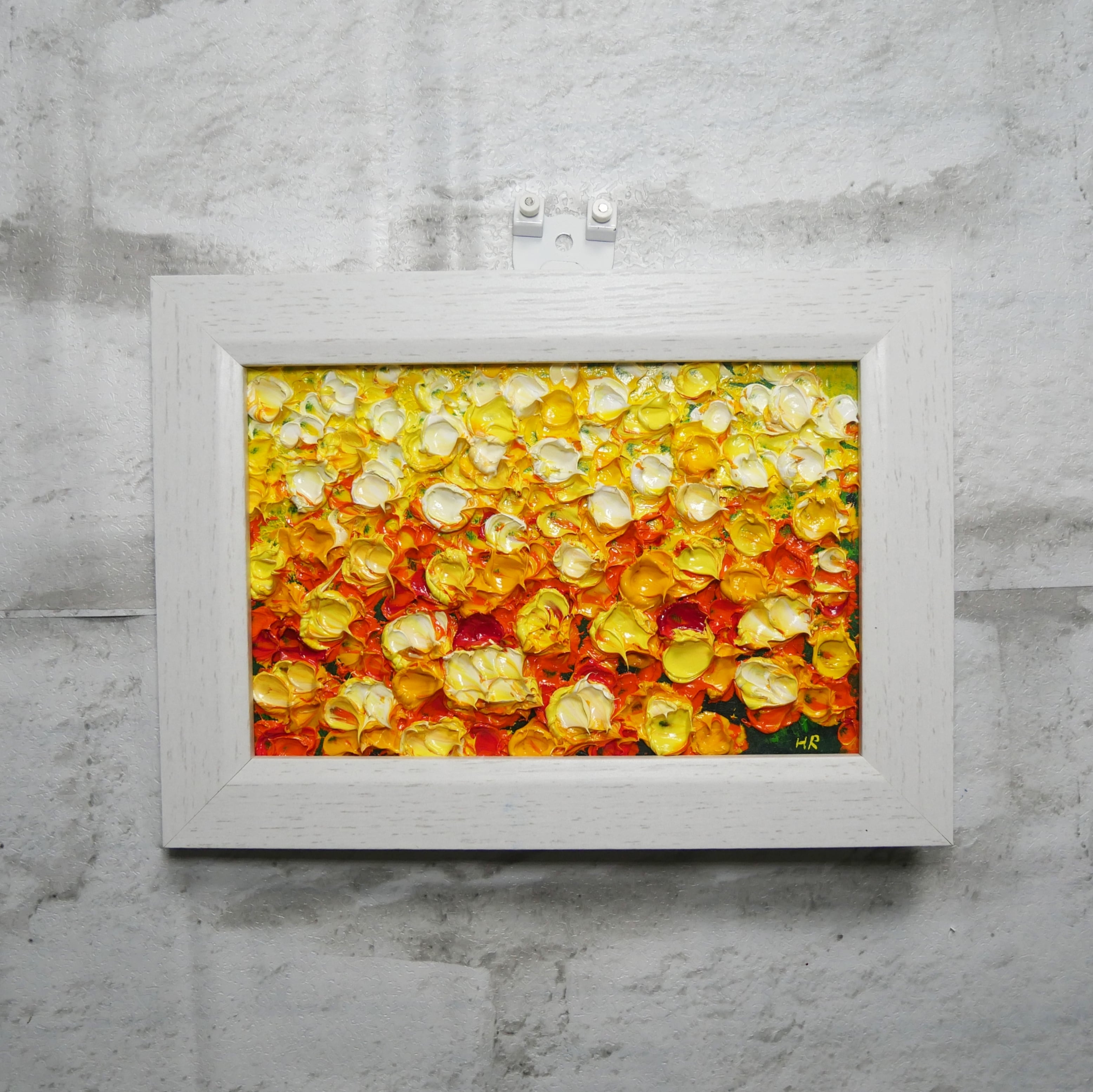 マリーゴールドやマリーゴールド畑をモチーフにした美しい作品です。フレームサイズは横18.2cm×縦13.2cmで、油絵サイズは100×148mm。豊富な油絵具を使用して描かれたマリーゴールドの絵画は、色彩豊かで花の美しさが存分に表現されています。