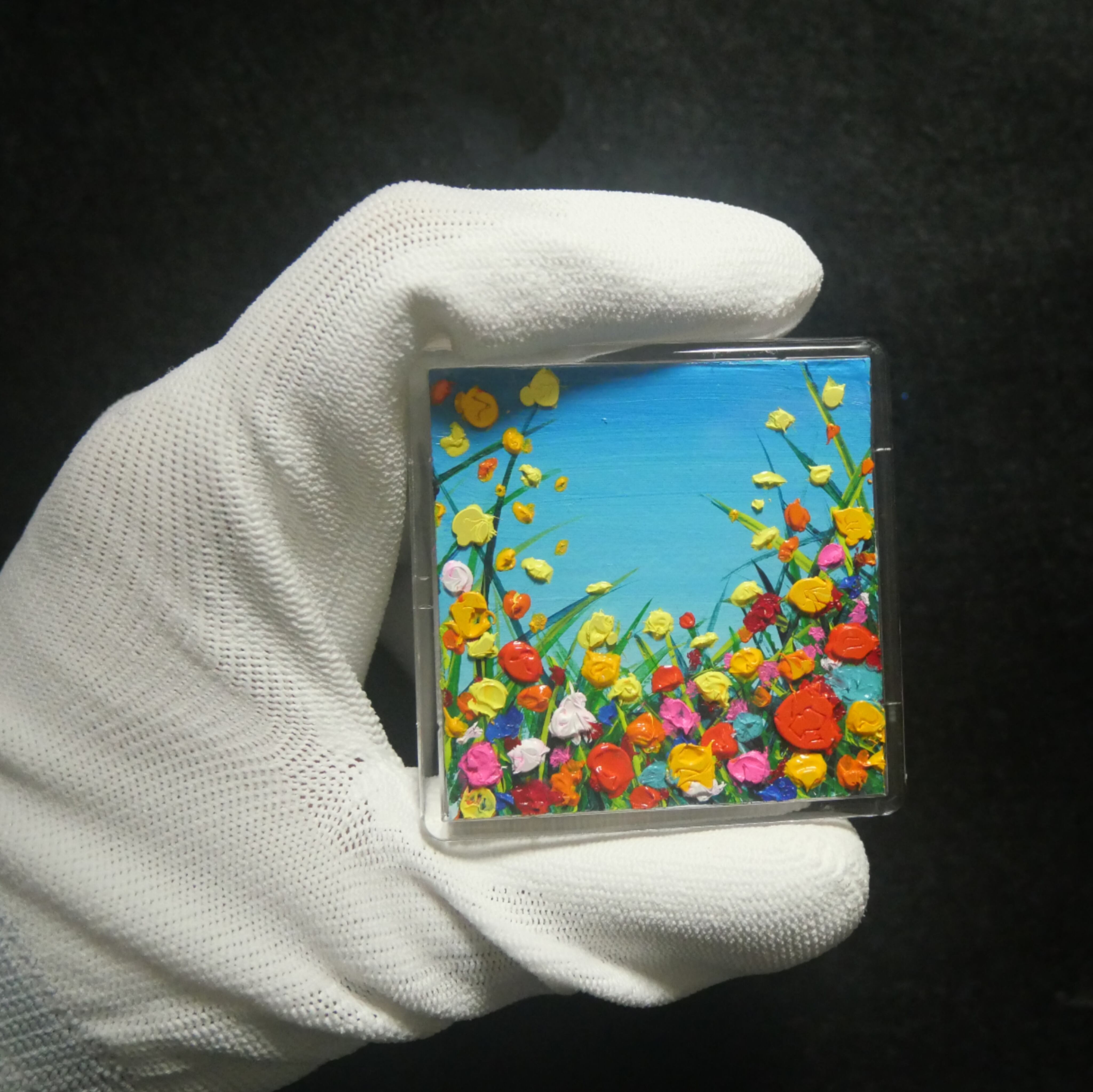 油絵 マグネット絵画【野生のお花畑】は、マグネットサイズの小さな油絵です。お花畑の美しい風景を描いたこの作品は、冷蔵庫やオフィスのホワイトボードに飾るのに最適です。野生のお花畑をイメージして描かれたこのアートは、春の訪れや花の美しさを感じさせてくれます。
