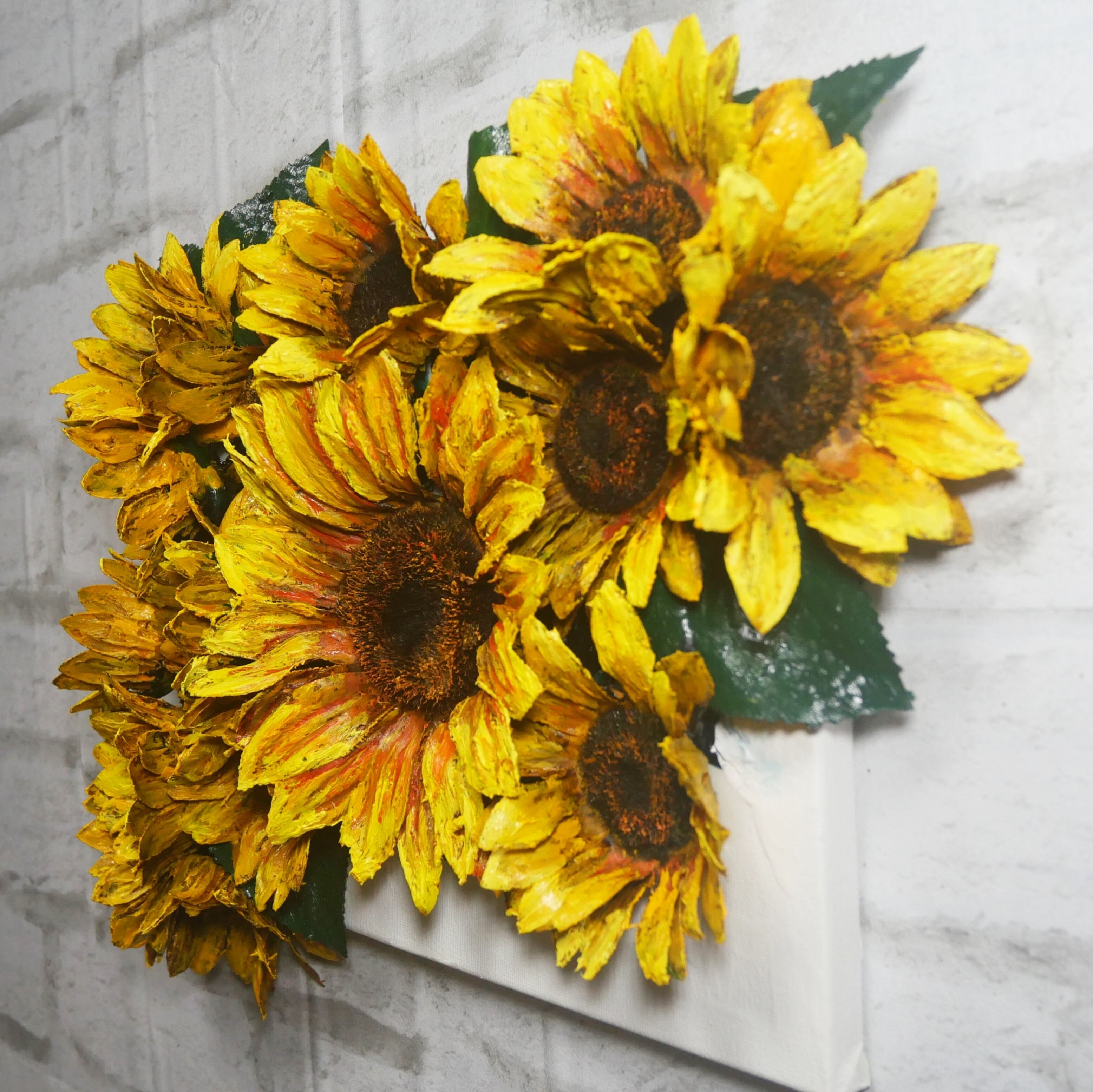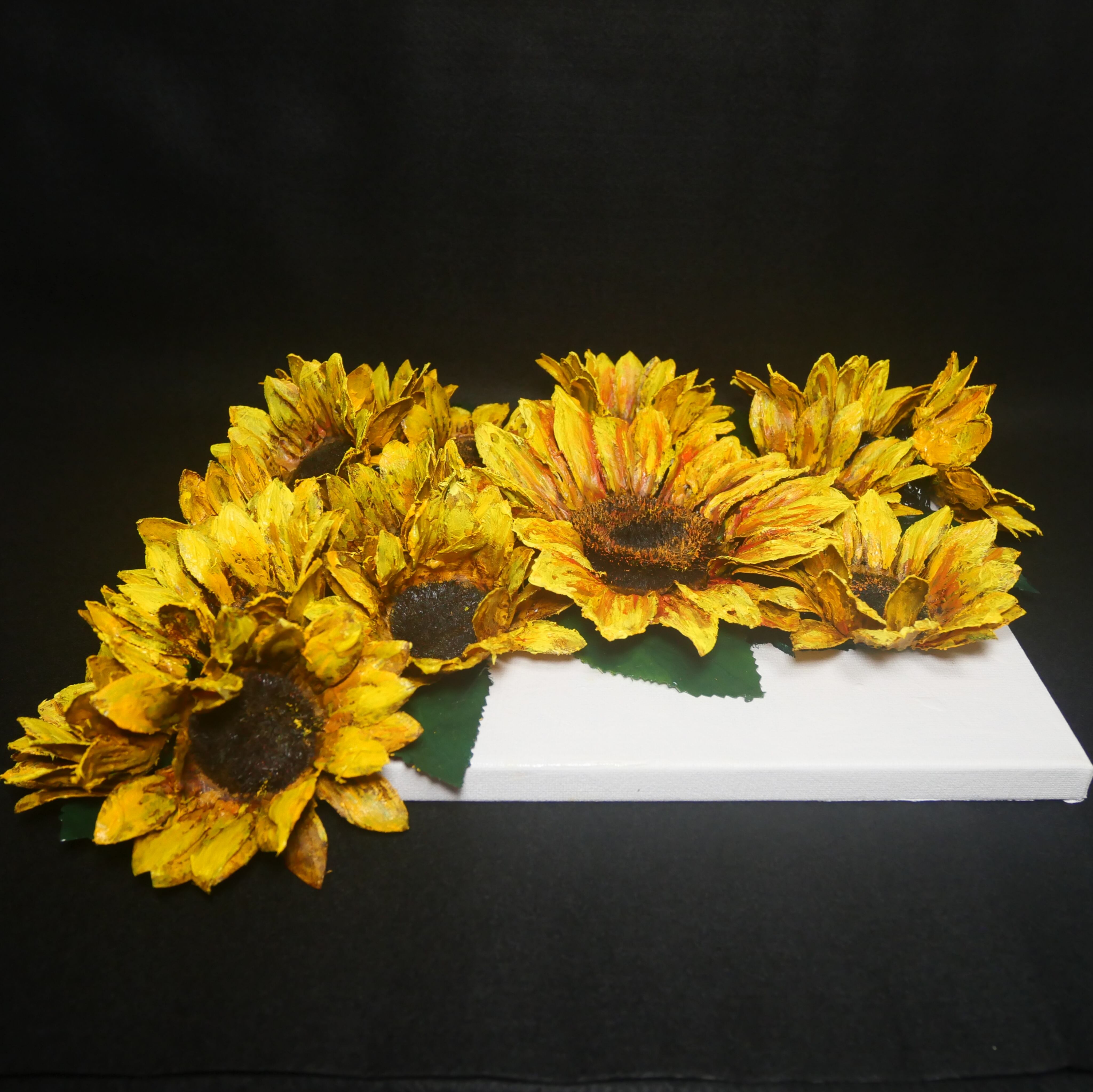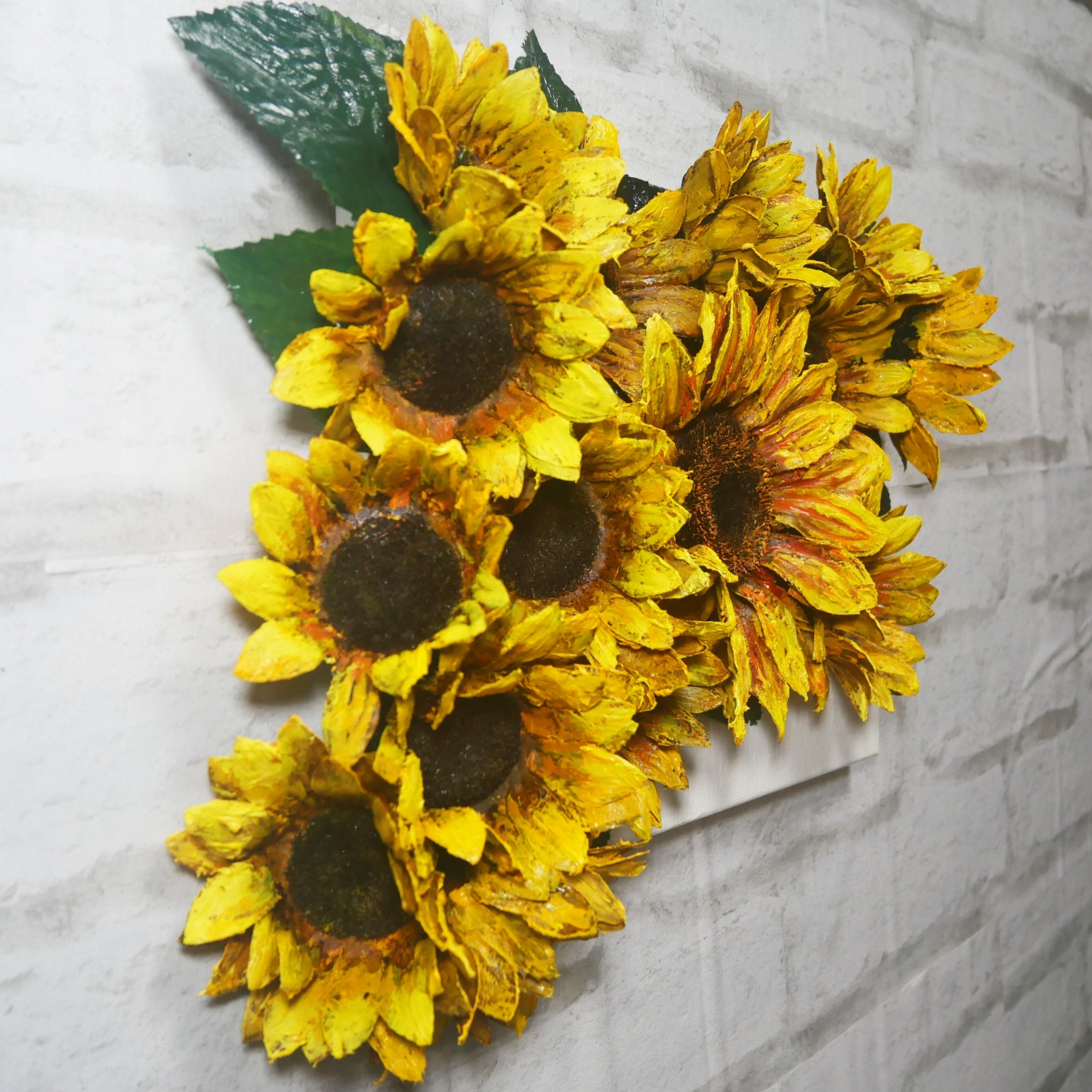 「枯れない向日葵」は、油絵具と造花を組み合わせたアート作品です。ひまわりのモチーフが永遠に枯れない美しさを表現しています。手軽に壁掛けできる金具も付属しており、お好きな場所にお飾りいただけます。サイズは横37.0cm、縦31.0cm、厚さ5cmと、存在感があります。本商品はART CANVAS キャンバスF3号を使用しており、高品質な仕上がりを実現しています。油絵の具にはホルベインを使用し、リアルな表現を追求しています。この作品は、壁に飾ればお部屋に彩りを添え、永遠に美しい花を楽しむことができます。是非、お手に取ってご覧ください。