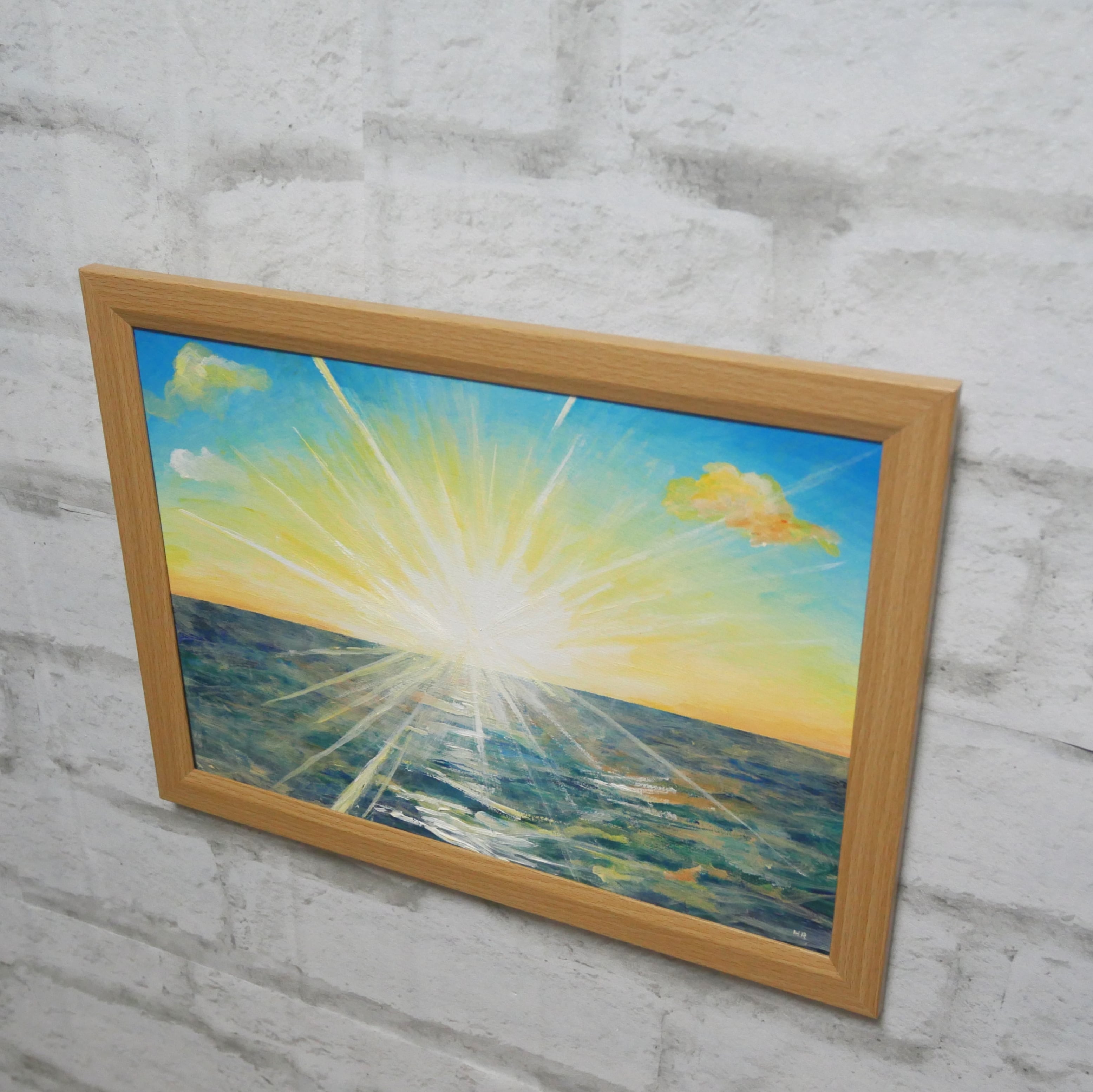 朝日に反射してきらめく海と太陽の光を美しく描いた作品です。作品を眺めるだけで、癒しと幸福感が心に沁みわたることでしょう。絵の中には、穏やかな光景や夢見るような情景が広がっています。