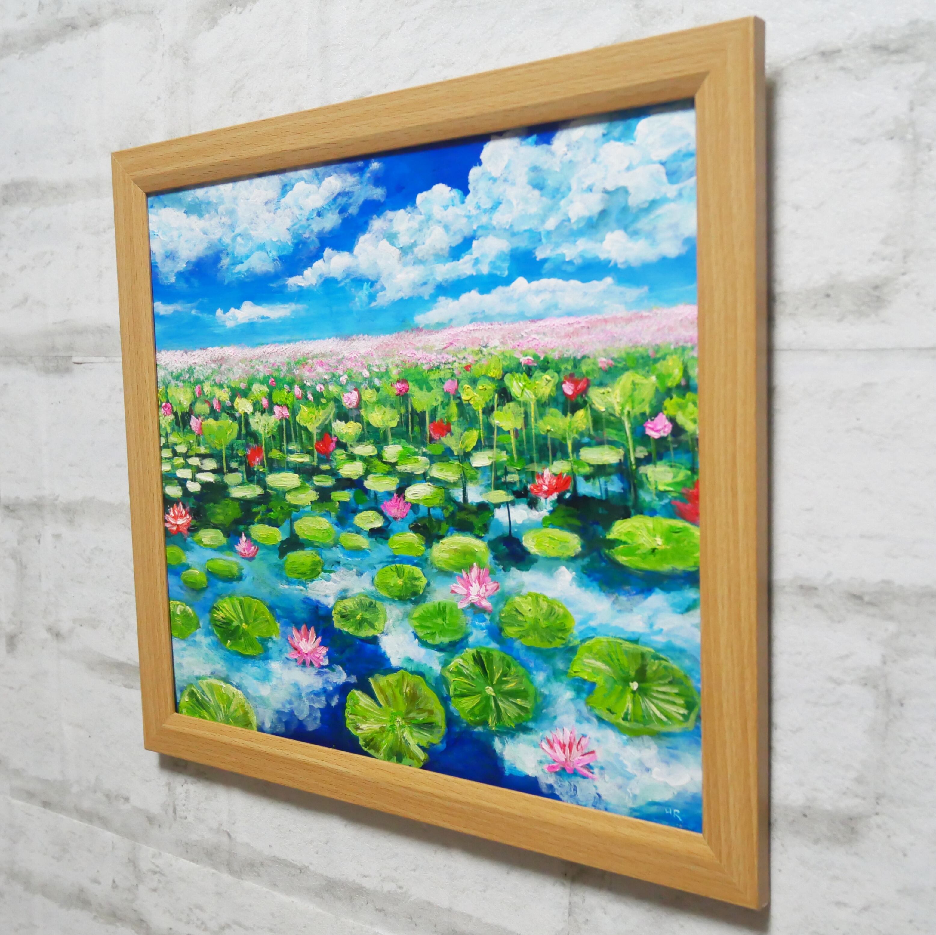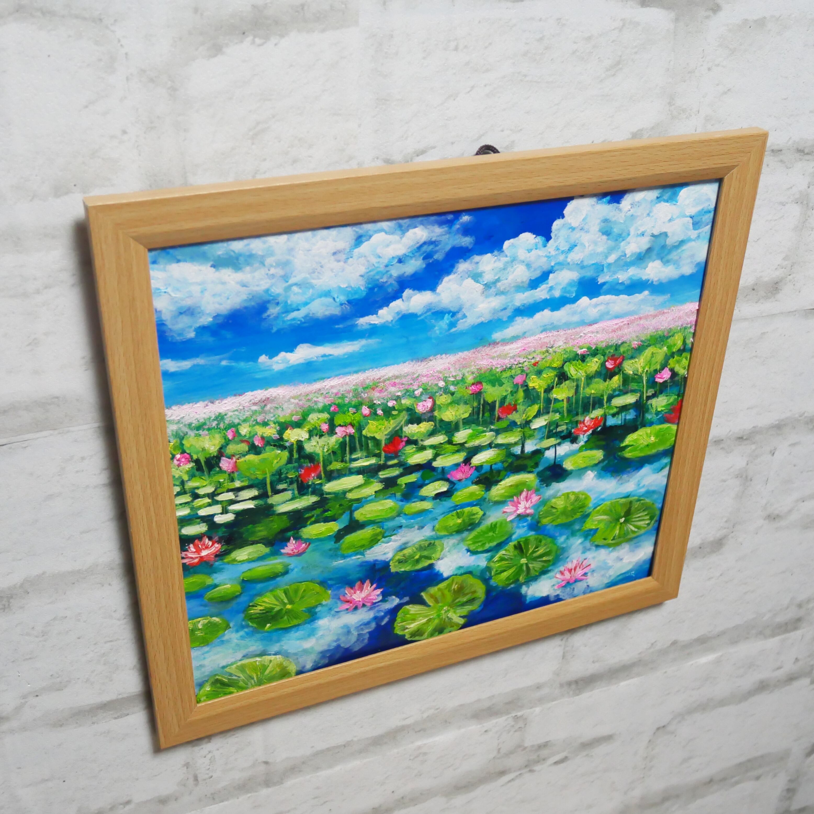 「水面映る蓮」は、青空と雲に映る湖の風景と、優雅に咲く蓮とその葉を描いた特別な油絵作品です。この作品は、静けさと心の安らぎをもたらし、見る人の心に美しい自然の情景を思い起こさせてくれることでしょう。蓮の花の美しさと湖面に映る風景が、夏の穏やかな時間を切り取ったかのような印象を与えます。