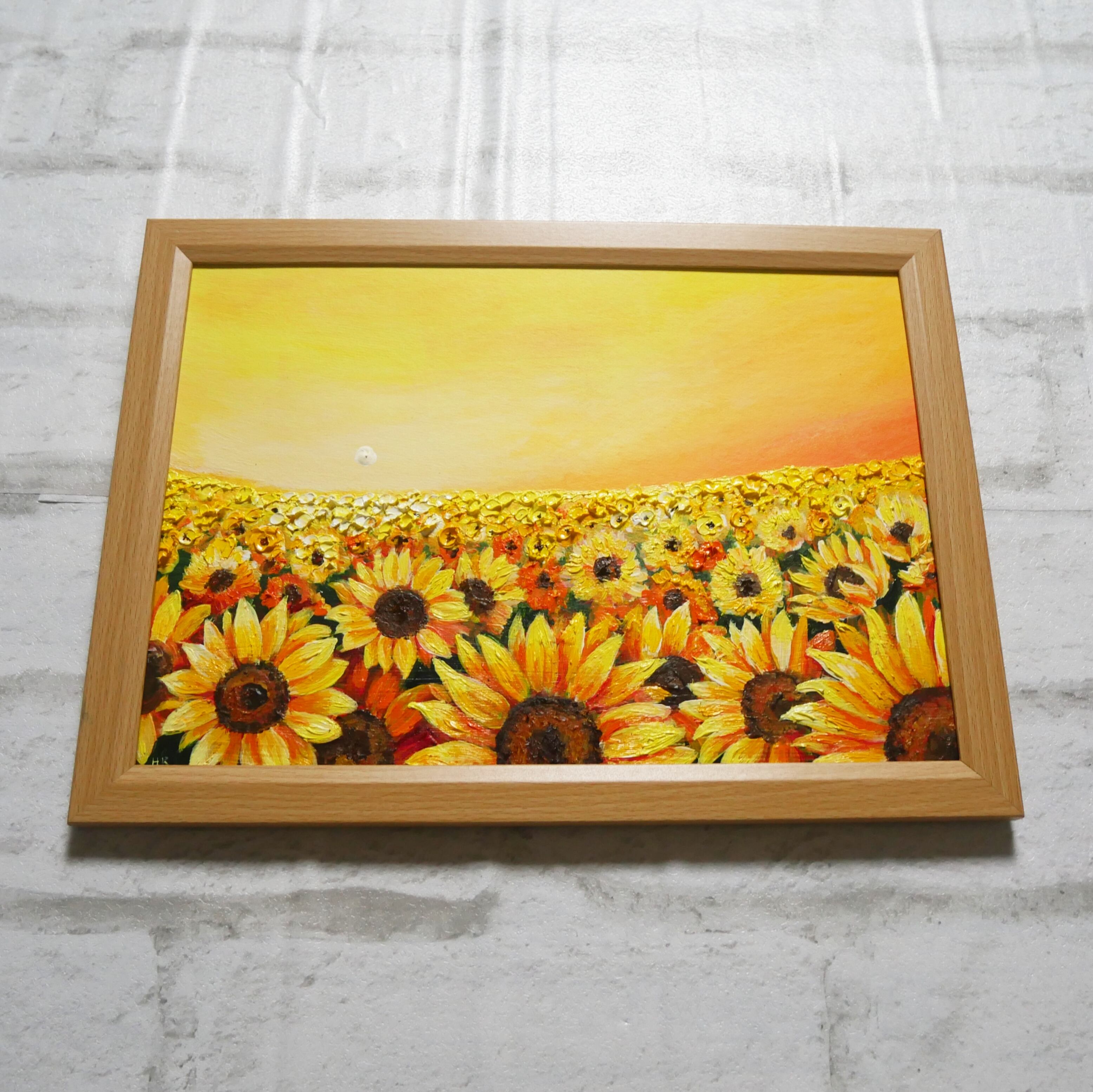 この油絵は、縦210mm × 横297mmのサイズで、ナチュラル額縁(縦24.2cm × 横32.8cm × 厚さ1cm)に収められており、どんなインテリアにも調和し、特別な雰囲気を演出します。壁掛け用の金具も付属しているため、お好きな場所に手軽に飾れ、夏の思い出を漂わせることができます。「夕日のひまわり畑」は、大切な方への贈り物や特別な瞬間を共に分かち合う際にも自信を持っておすすめいたします。
