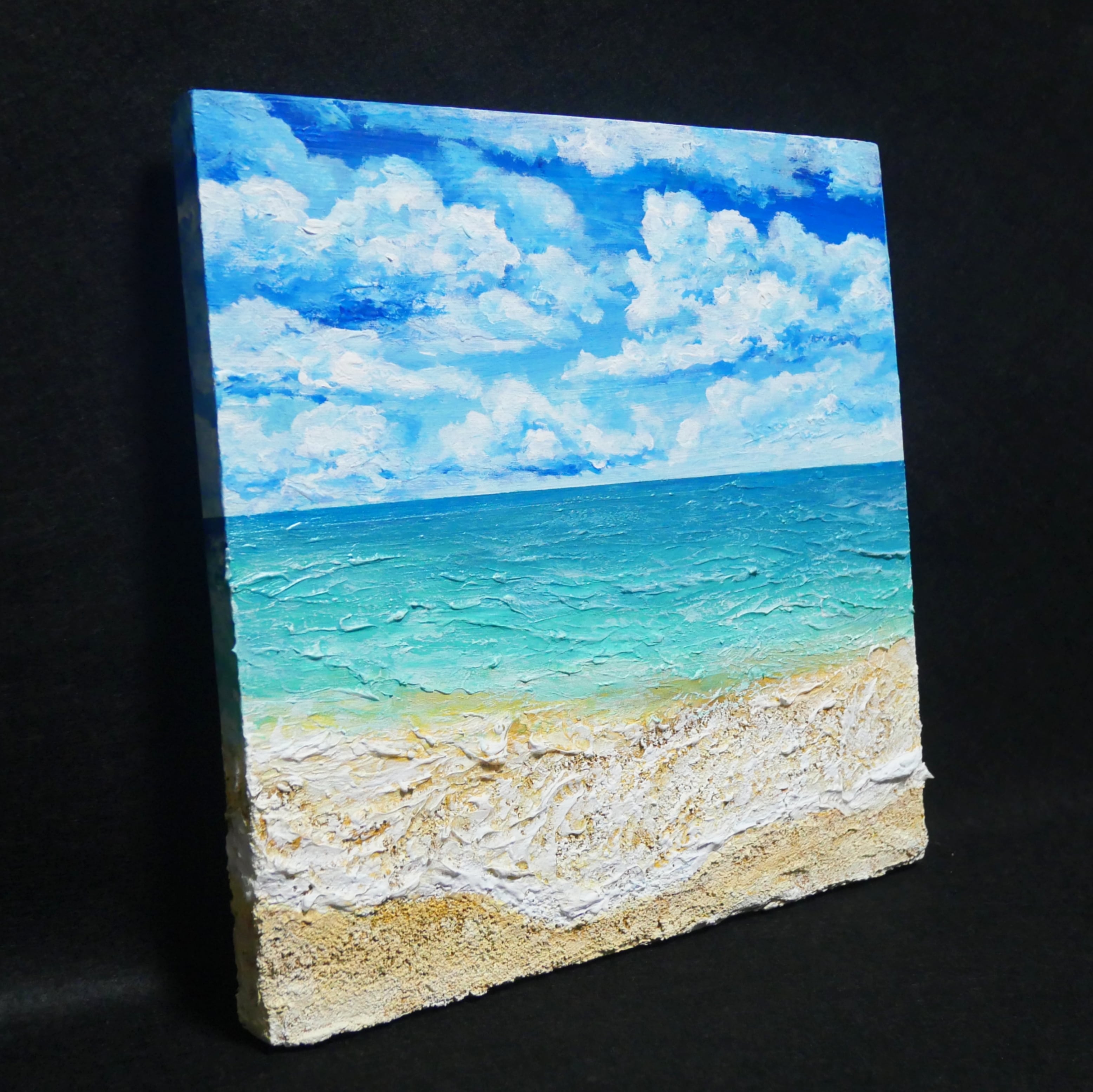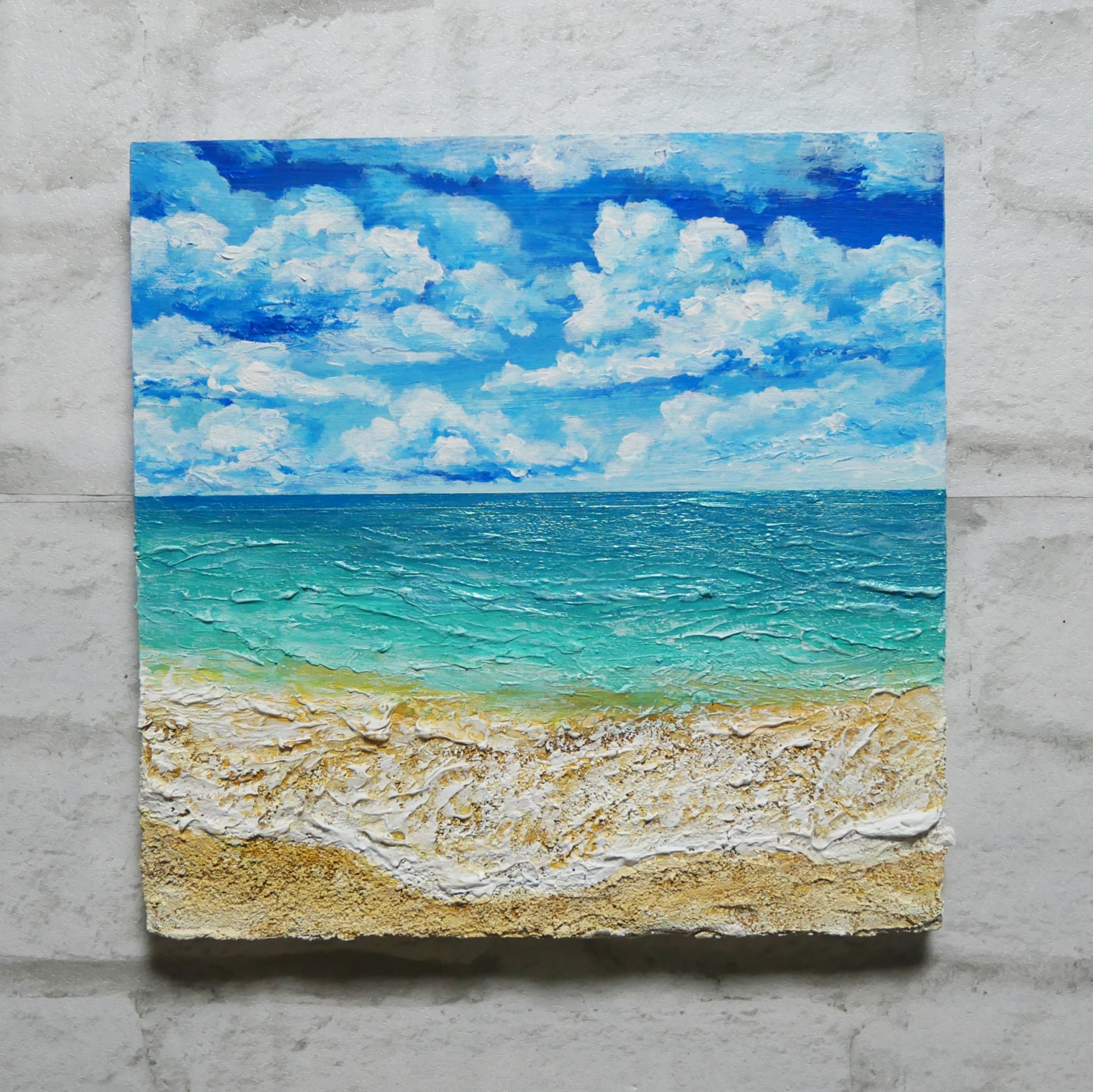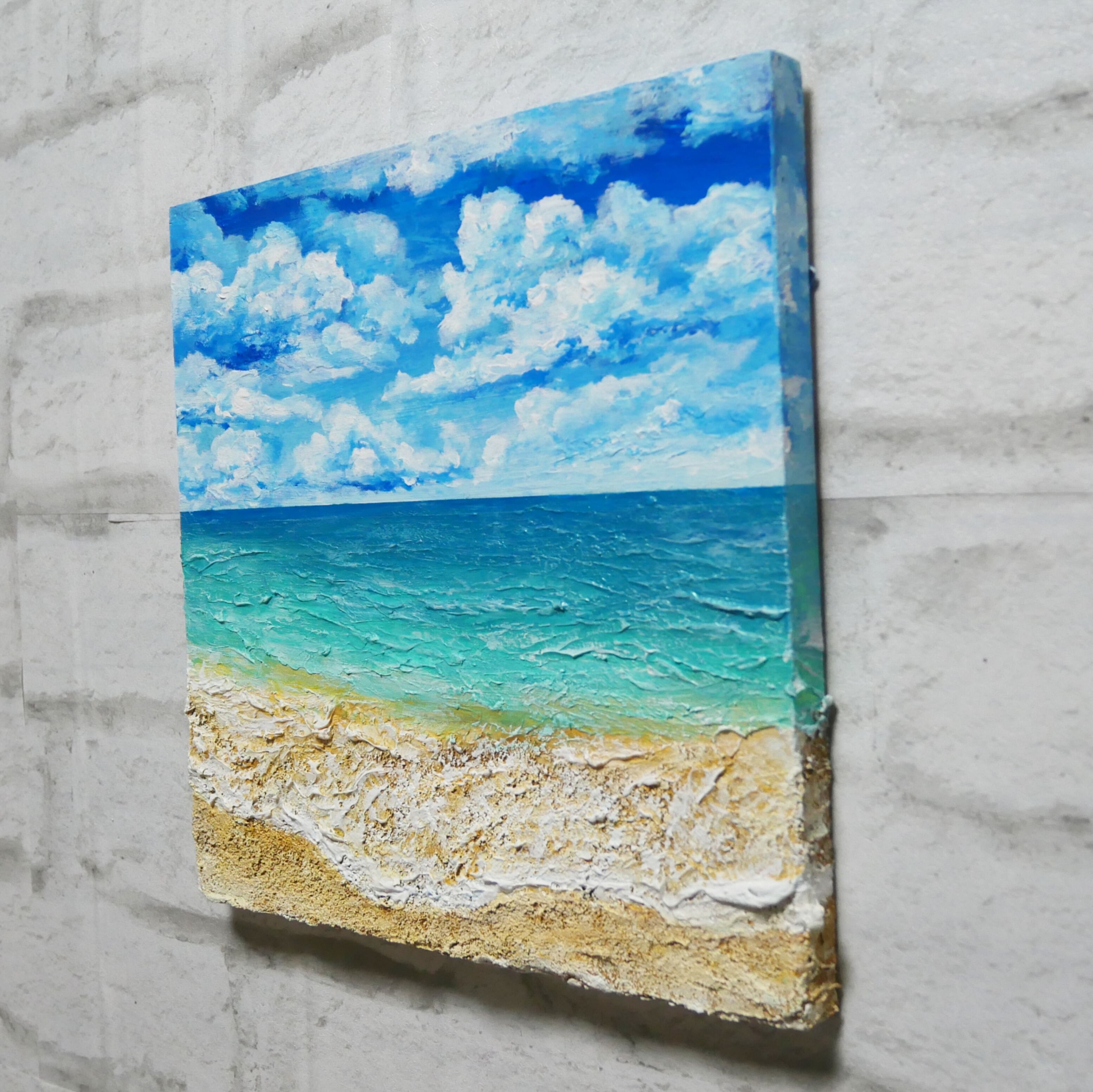 木製パネルに描かれた油絵【砂浜の夏】。海と青空、雲、そして砂浜の美しい風景が描かれたこの作品は、まるで夏の一コマを閉じ込めたよう。24.0×24.0cmのサイズで、厚さ2cmのスリムなデザインは、壁や棚に飾るのにも最適です。