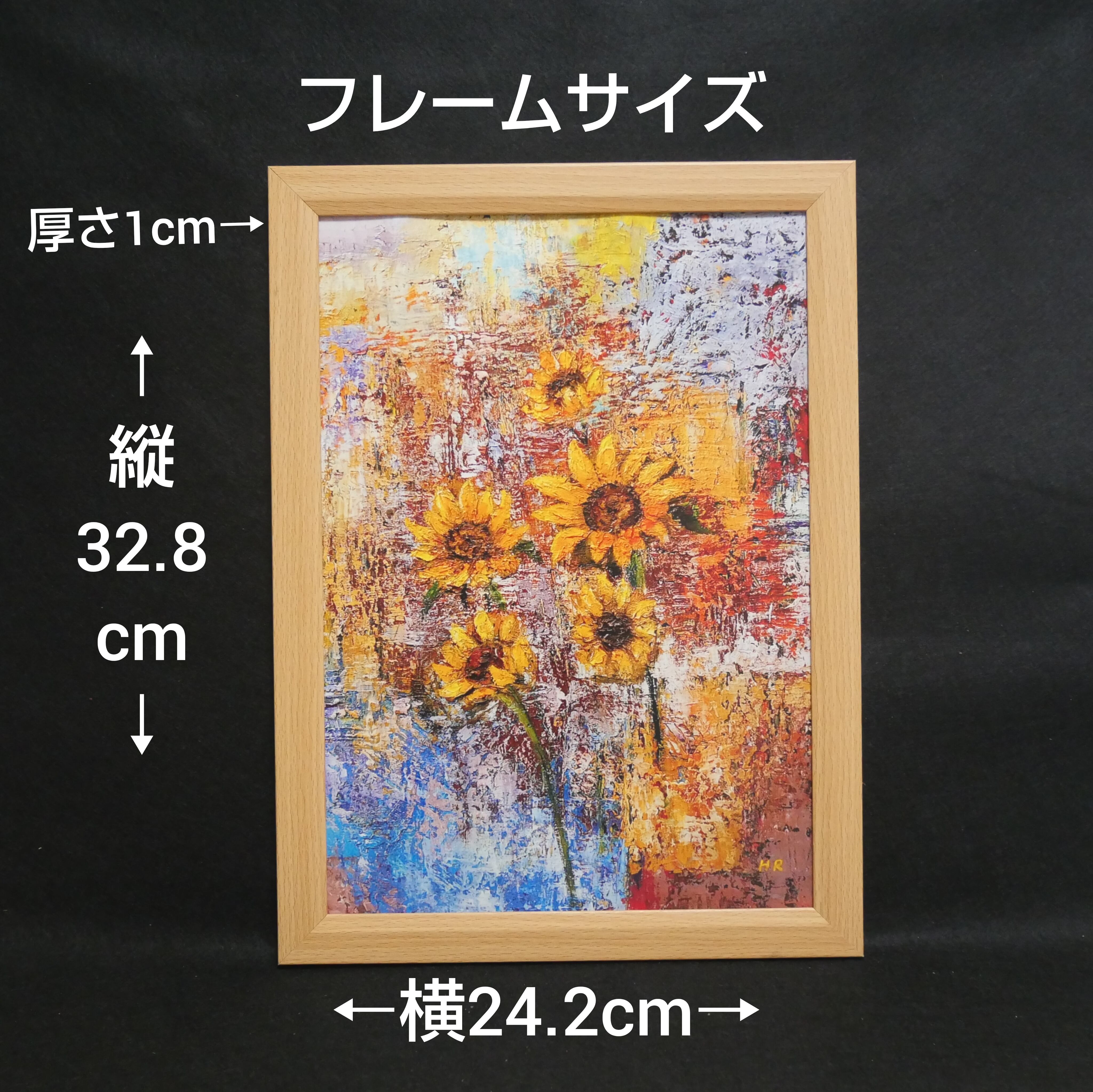 美しい夏の花「ひまわり」をアートポスターにしました。A4サイズのポスターで、どんなお部屋にもぴったりのサイズです。全面フチなし印刷により、美しい色彩を再現。立てかけるだけでなく、壁にも掛けられるので、お好みのスタイルでご覧いただけます。モチーフは向日葵、夏の象徴。太陽のような明るさと、元気を届けてくれることでしょう。商品はラッピングも付いており、プレゼントとしても最適です。