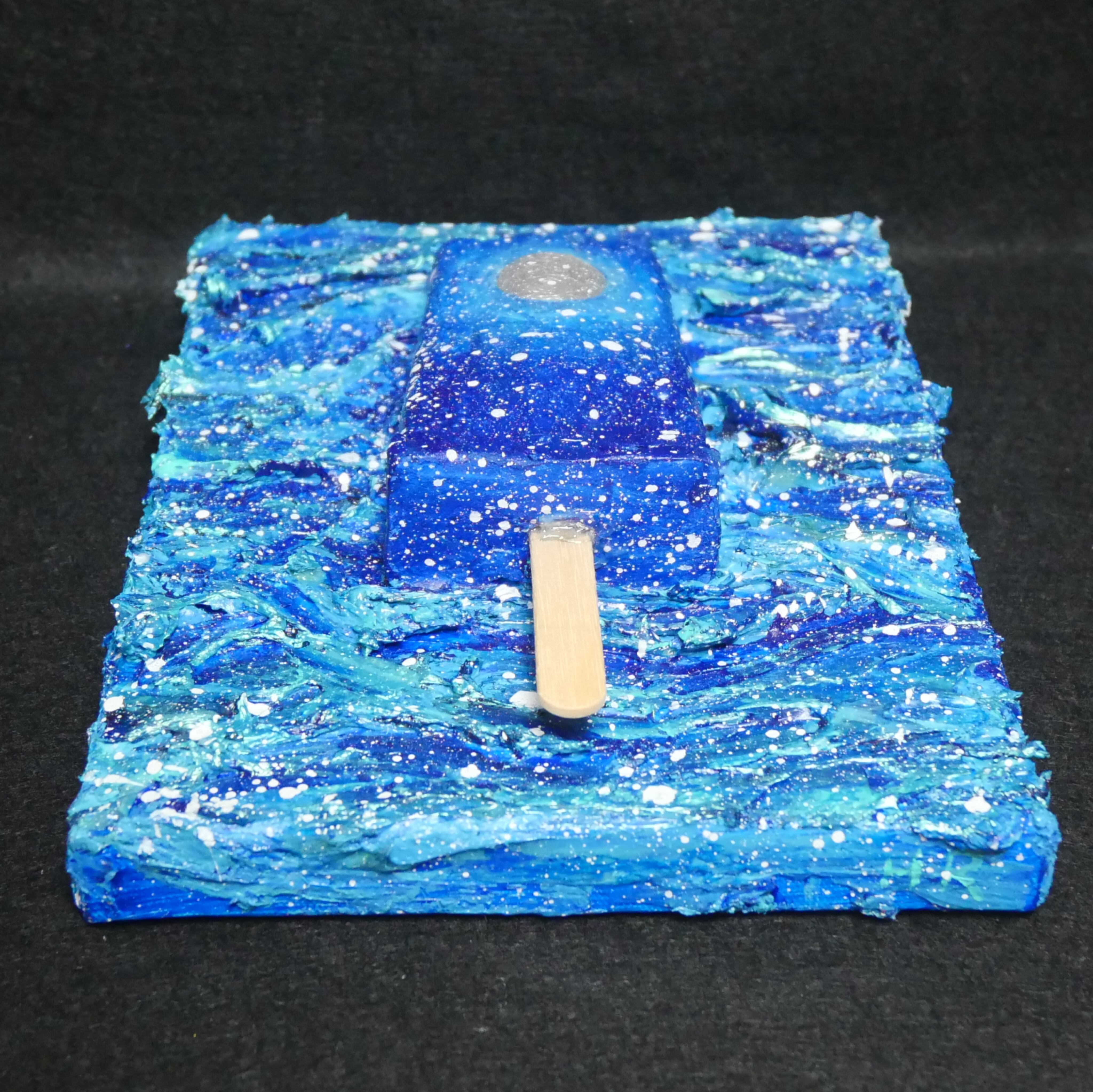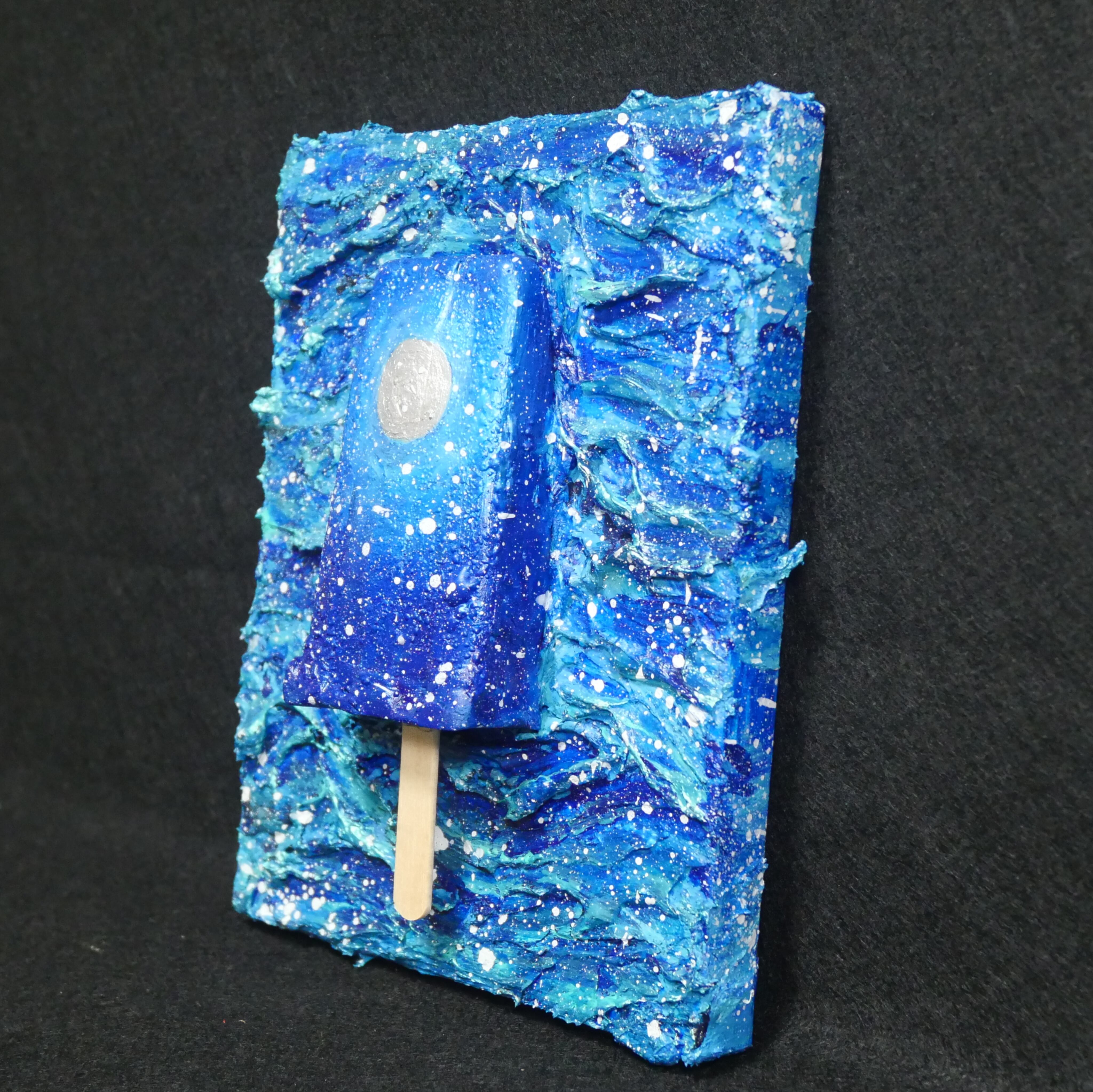 海雪の冬の風景を描いたこの作品は、アイスキャンディーの形状を模して作られています。アートパネルの背景には、冬の海を波の表現で描き、アイスキャンディーの上には雪が降り積もるイメージを表現しています。繊細な描写と色使いが、作品に深い冬の美しさと静寂を与えています。
