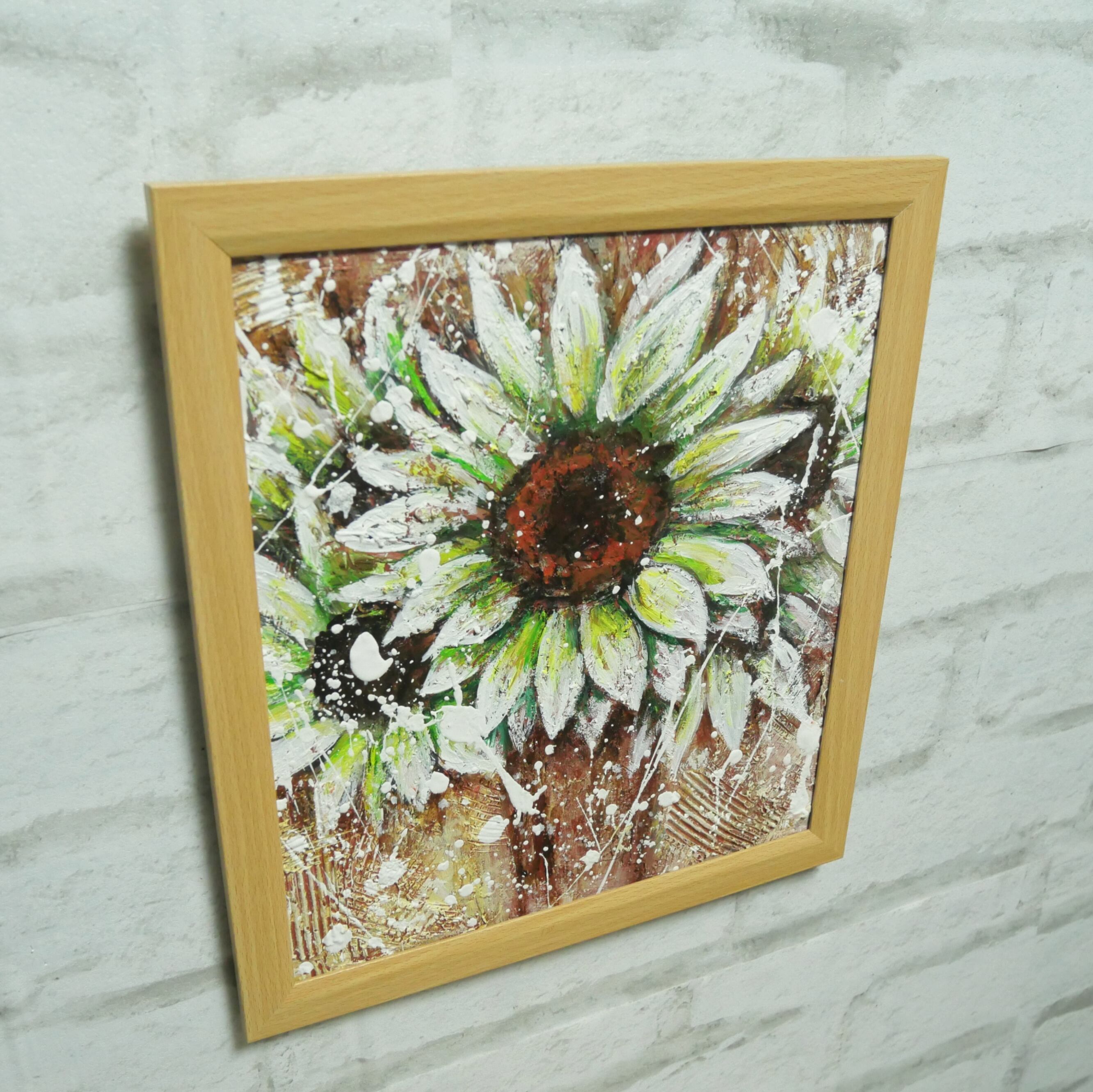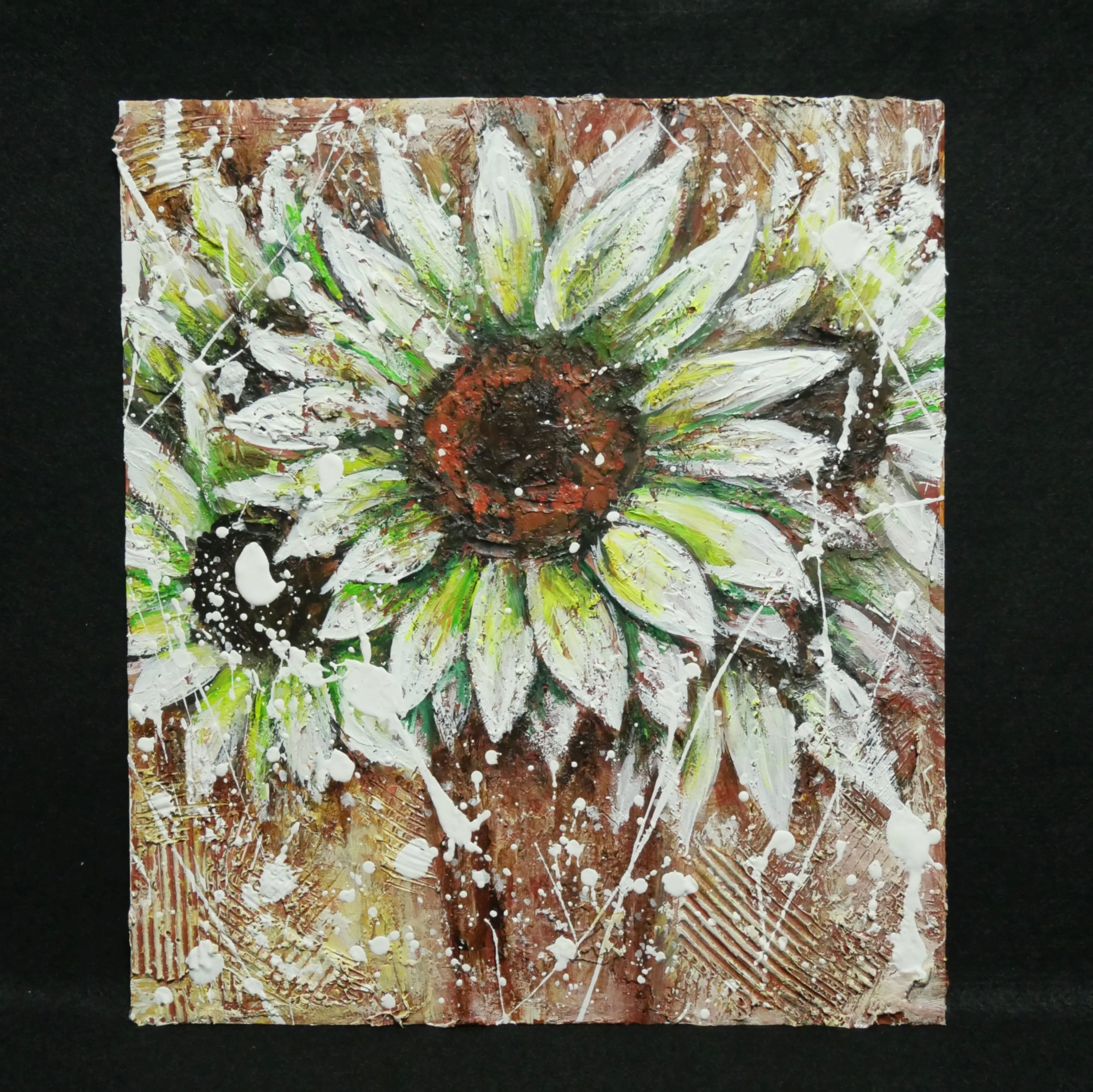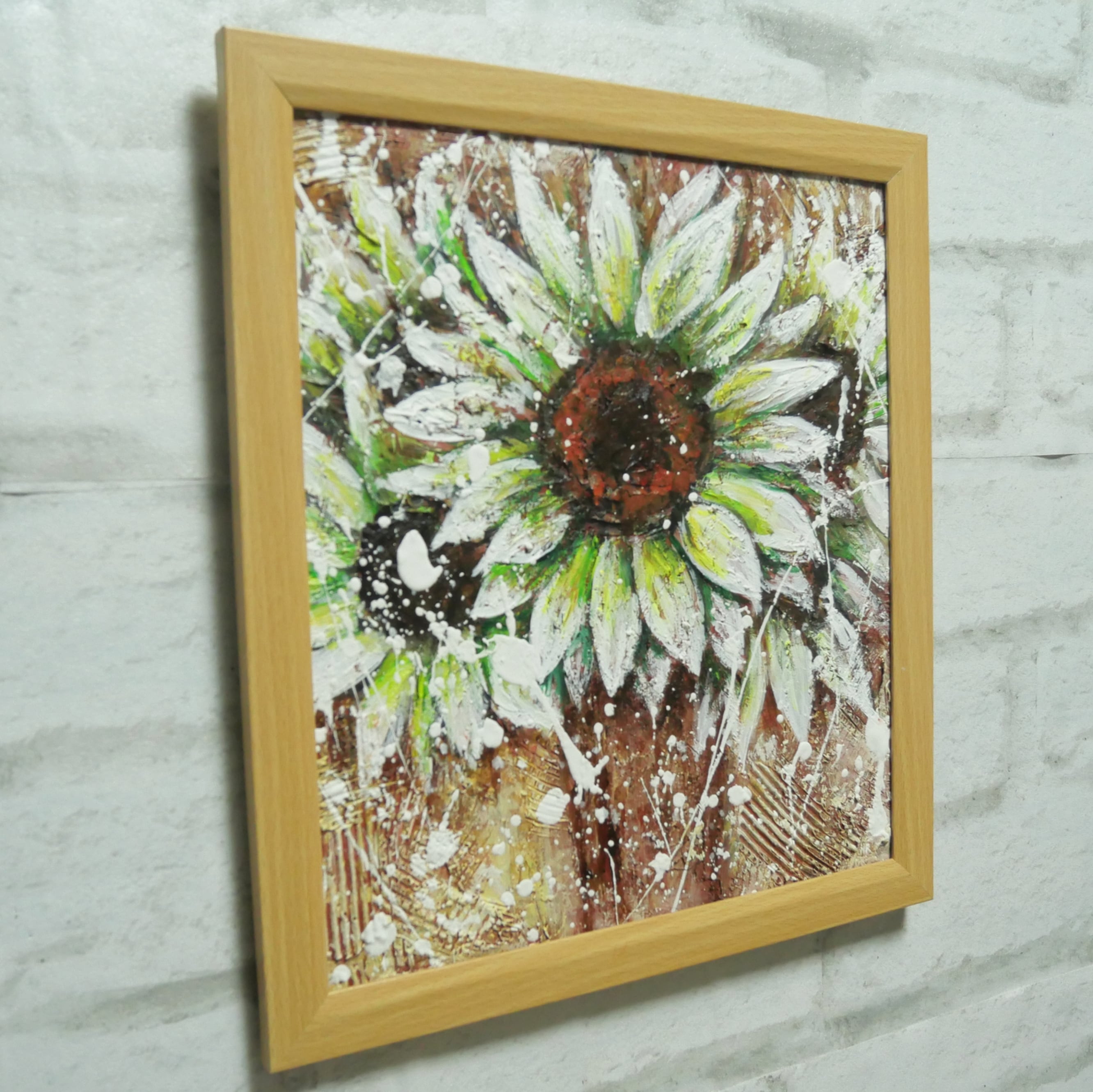 白いひまわりの油彩画は、視覚的な美しさと象徴的な意味を兼ね備えた作品です。真っ白なひまわりは、「ほどよき恋愛」という花言葉を持ち、観賞するだけで心が和むこと間違いなし。この白いひまわりの絵画は、お部屋のインテリアとしてだけでなく、心に癒しを与えるアート作品としても最適です。手軽に壁に飾れるサイズと付属の金具で、どこでもお好きな場所にお楽しみいただけます。癒しと愛情を象徴する白いひまわりの油彩画は、贈り物としても喜ばれること間違いなし!是非お客様の特別なスペースに飾ってみてください。