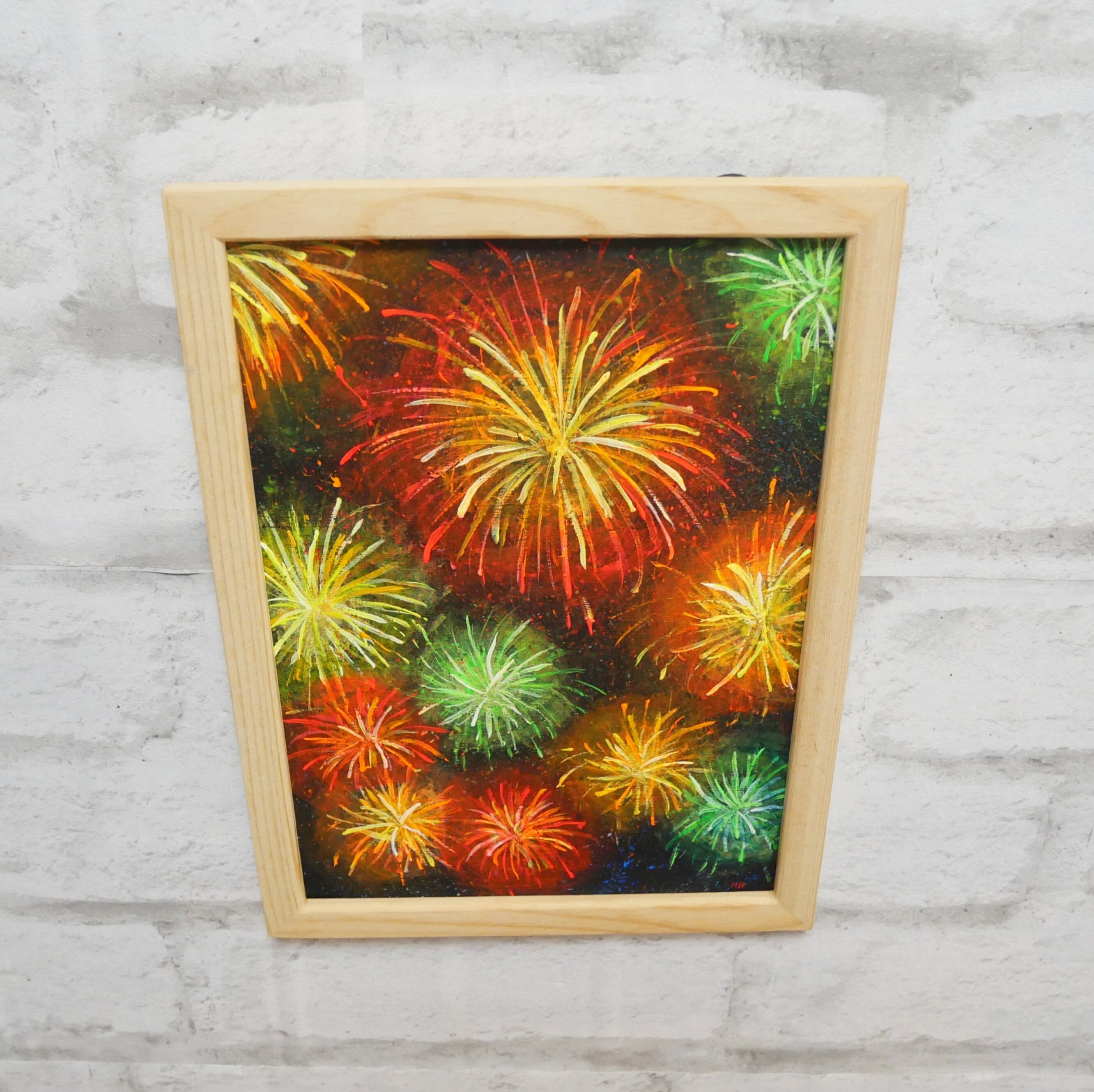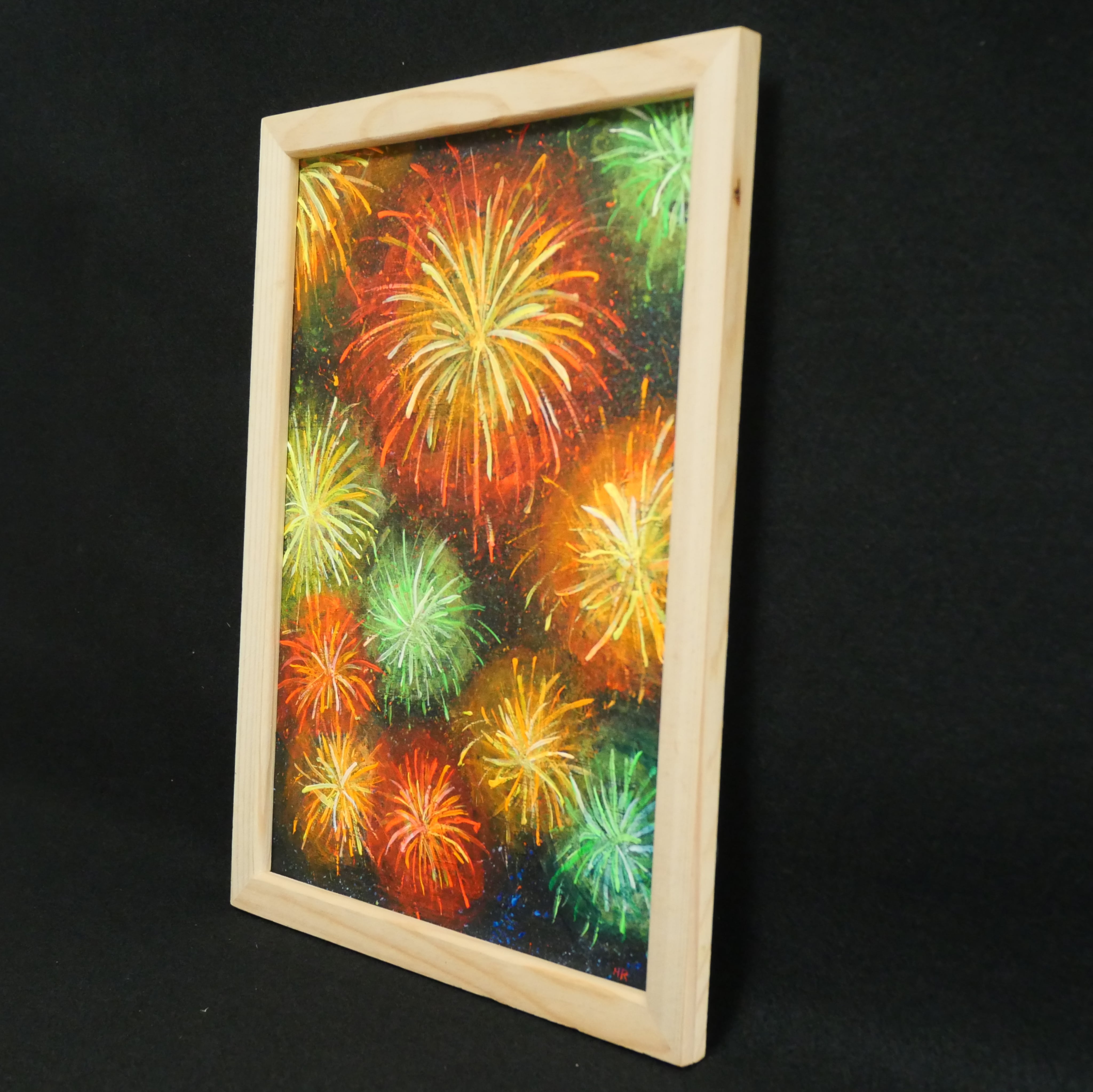 「花火」は、真夜中の空に煌めく美しい花火を描いた特別な油絵作品です。赤、オレンジ、黄、青、緑と多彩な色彩が織り成す夜空の幻想は、見る人々の心に夏の特別な瞬間を呼び起こすことでしょう。この作品は、夏の時期に飾るのにぴったりなアクセントとなり、あなたの空間を華やかに演出します。